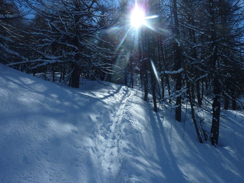 Partiti da Chateau alle 9.00 con 30-40 cm. di fresca. Per fortuna il percorso era stato già tracciato. Ambiente in mezzo ai boschi veramente suggestivo data la quantità di neve e la giornata di sole.