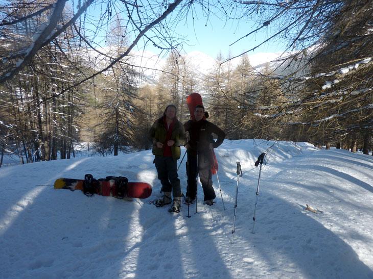 Il Cotolivier non offre certo per lo snowboard ampi spazi, però la discesa in mezzo al bosco è comunque sempre divertente. In compagnia di Bosco e Andrea.