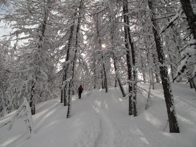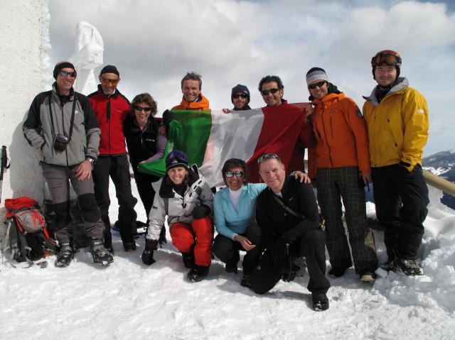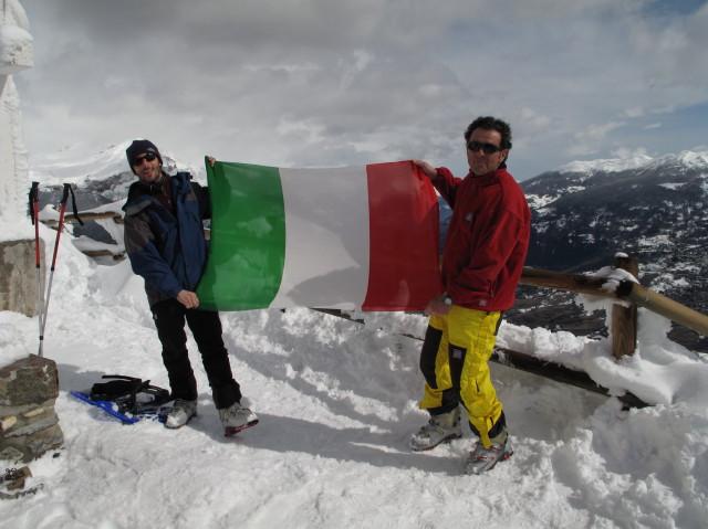 Dove andare con questa carica di neve,i posti sono abbastanza ristretti, quì, cima del bosco, risalire delle piste, ma sicuramente lontani da quei bei posti che ti attirano, quei pendii vergini ma in questo momento non consigliabili, la neve è tanta, le due stelle sono strette, perciò ne diamo tre, in occasione dei 150 anni di unità d’Italia anche le nostre montagne si sono vestite a festa. Dopo due girni di pioggia e neve finalmente un pò di sole è tornato a splendere, qualche bella curva fino a metà discesa siamo riusciti farla, temperature un pò elevate ma nell’insieme è andata bene, in punta abbiamo trovato una parte della scuola SUCAI di snowboard, altri skialp e dei ciaspolatori, abbiamo formato un bel gruppo, fatto la foto con il tricolore, un modo come un altro per festeggiare questo evento che coinvolge noi e la nostra amata ITALIA. Un saluto a questi cari amici ed un augurio a tutti gli skialp, ciao alla prossima.