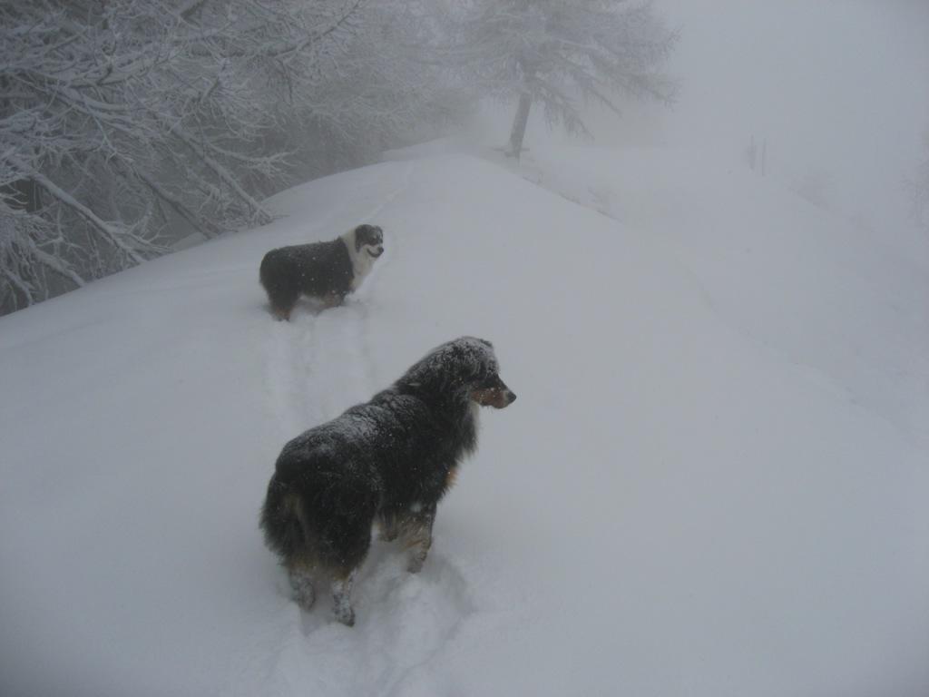 Come possa cambiare il meteo da un giorno all’altro….!!! daltronde era previsto e scontato, ma non avendo potuto muoverci ieri causa forza maggiore, abbiamo optato per una delle poche gite efffettuabili oggi. Partiti dal parcheggio alle 08,45 con -4°,bella e suggestiva salita sotto una bella nevicata che ha coperto le vecchie tracce, in punta il venticello bello fresco che faceva nevicare orizzontalmente,ci ha fatto decidere di scendere velocemente… La discesa e’ stata molto divertente, 15/20 cm di neve fresca asciutta su crosta dura portante hanno reso nuovamente immacolati i pendii, permettendo, nonostante le poche pendenze di questa gita, una bella sciata. Pensavo che oggi io, Cri e i due 4 zampe fossimo gli unici saliti su questa cima, invece a meta’ discesa abbiamo incontrato un’altro ski-alp che salutandoci ci diceva che stavano salendo alcune altre persone,in ogni caso per cosi’ poca gente oggi ce n’era davvero per tutti! Le stelle potrebbero anche essere anche 4, ma la visibilita’limitata in alto e alcuni passaggi in basso negli ultimi 50/80m di discesa prima del ponte, da fare con attenzione per mancanza di fondo sotto la farina odierna (occhio…!)mi fanno dare questo giudizio. Per me un bel Cotolivier d’altri tempi…