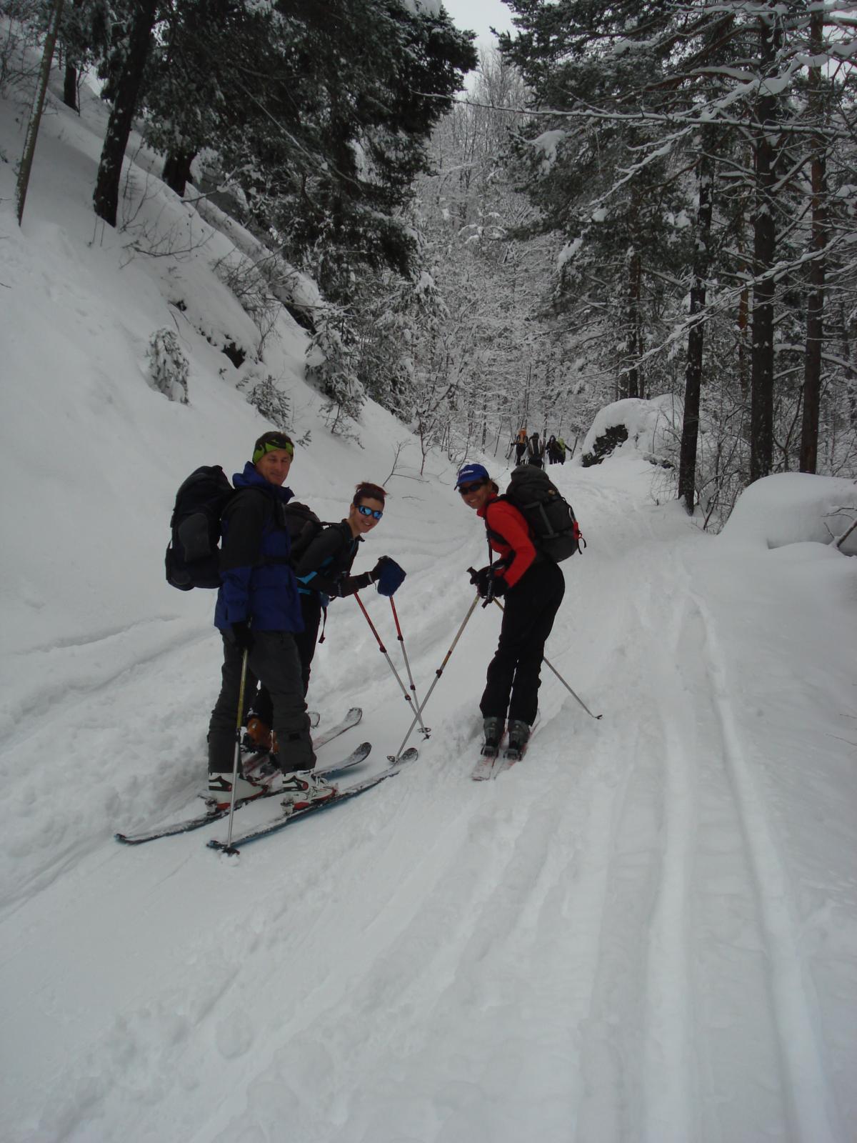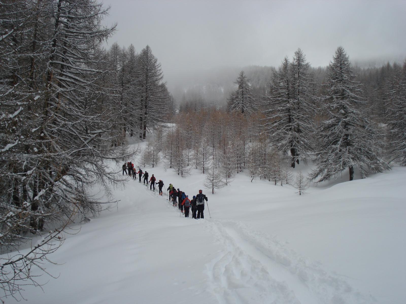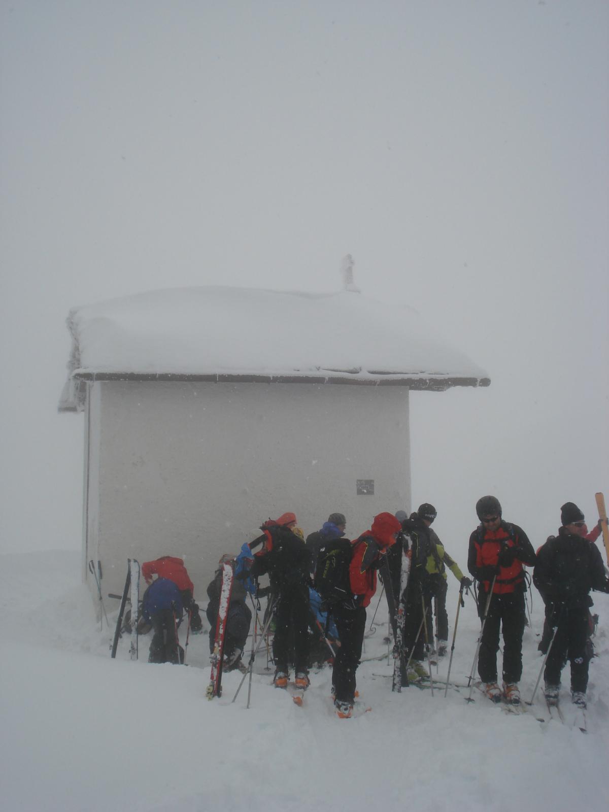 Prima gita della stagione 2014 per i G.A.S.A.T.I. del CAI Chivasso, per l’occasione in trasferta con il pulman dell’amico Claudio di Locana. Partenza da Beaulard sotto una nevicata molto fine e mai fastidiosa. Buona la visibilità nel bosco, discreta nei rari tratti non coperti dalla vegetazione e un po’ di nebbia in vetta. Discesa al top nei pendii più ripidi mentre dove veniva meno la pendenza occorreva spingere a causa della neve troppo abbondante (circa 40 cm). A quota m. 1.385 tappa obbligata da L’Eitabl a Chateau per rigenerare le forze con il “menù dello scialpinista”, consigliatissimo (polenta con contorno, vino, un dolce e caffè a 10 euro). Ultimi 300 metri di dislivello su neve via via più pesante, anche a causa della temperatura non troppo fredda, con qualche difficoltà dovuta alle libagioni di cui sopra.