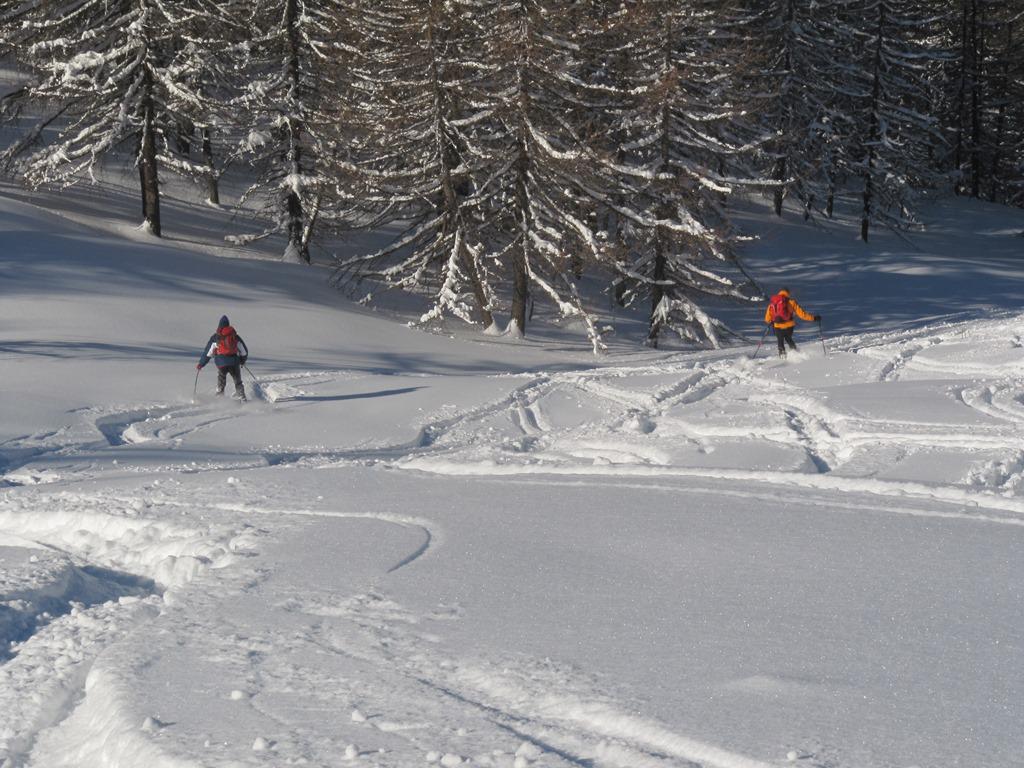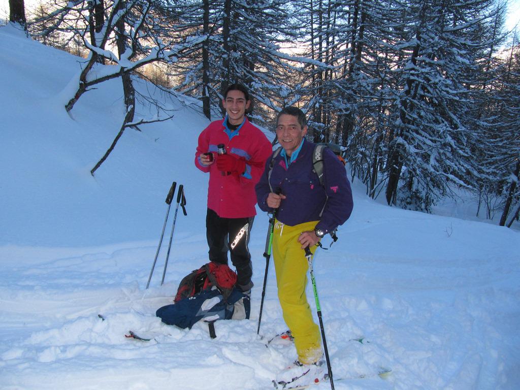 Fresche nevicate (FINALMENTE!!), che causano rischio 4 in val Susa e su tutte le Cozie e Marittime, ci inducono a una gita tranquilla che si rivela da 4*. Neve polverosa e sole (in vetta). Saliti lungo una traccia che Giacomo segue fedelmente nella 2a metà facendoci venire il fiatone. Discesa inaspettatamente scorrevole e piacevole nella farina totale.