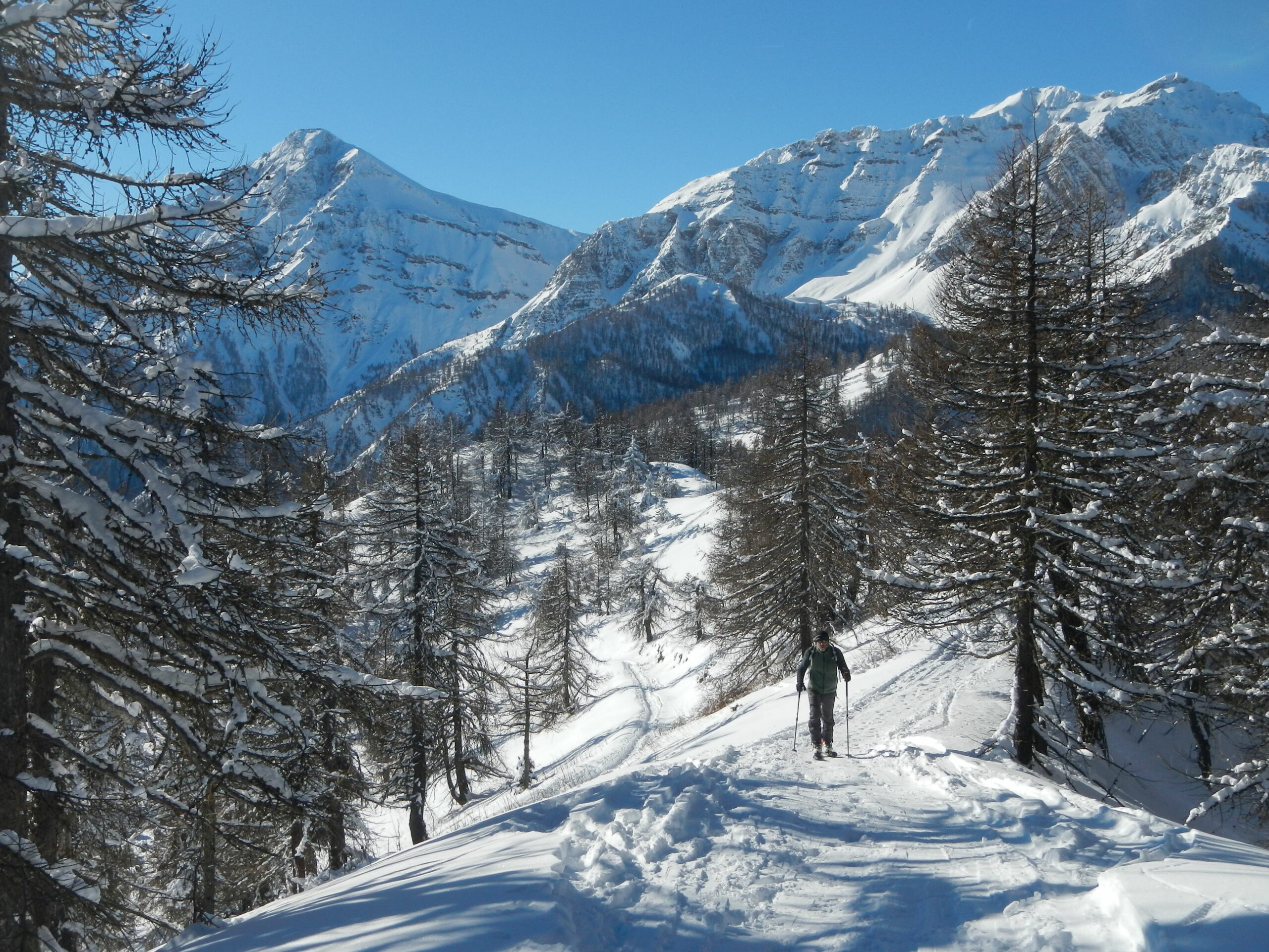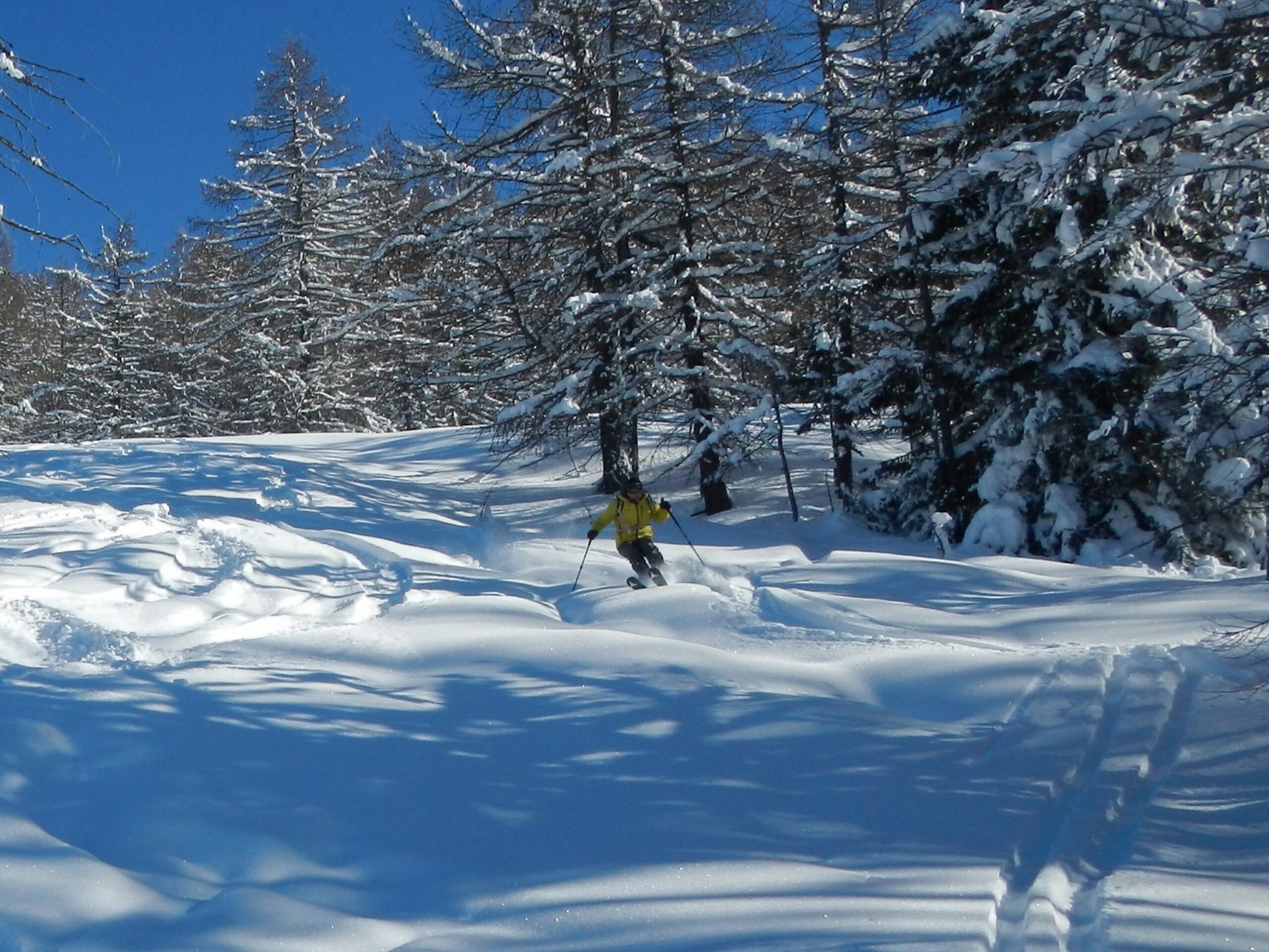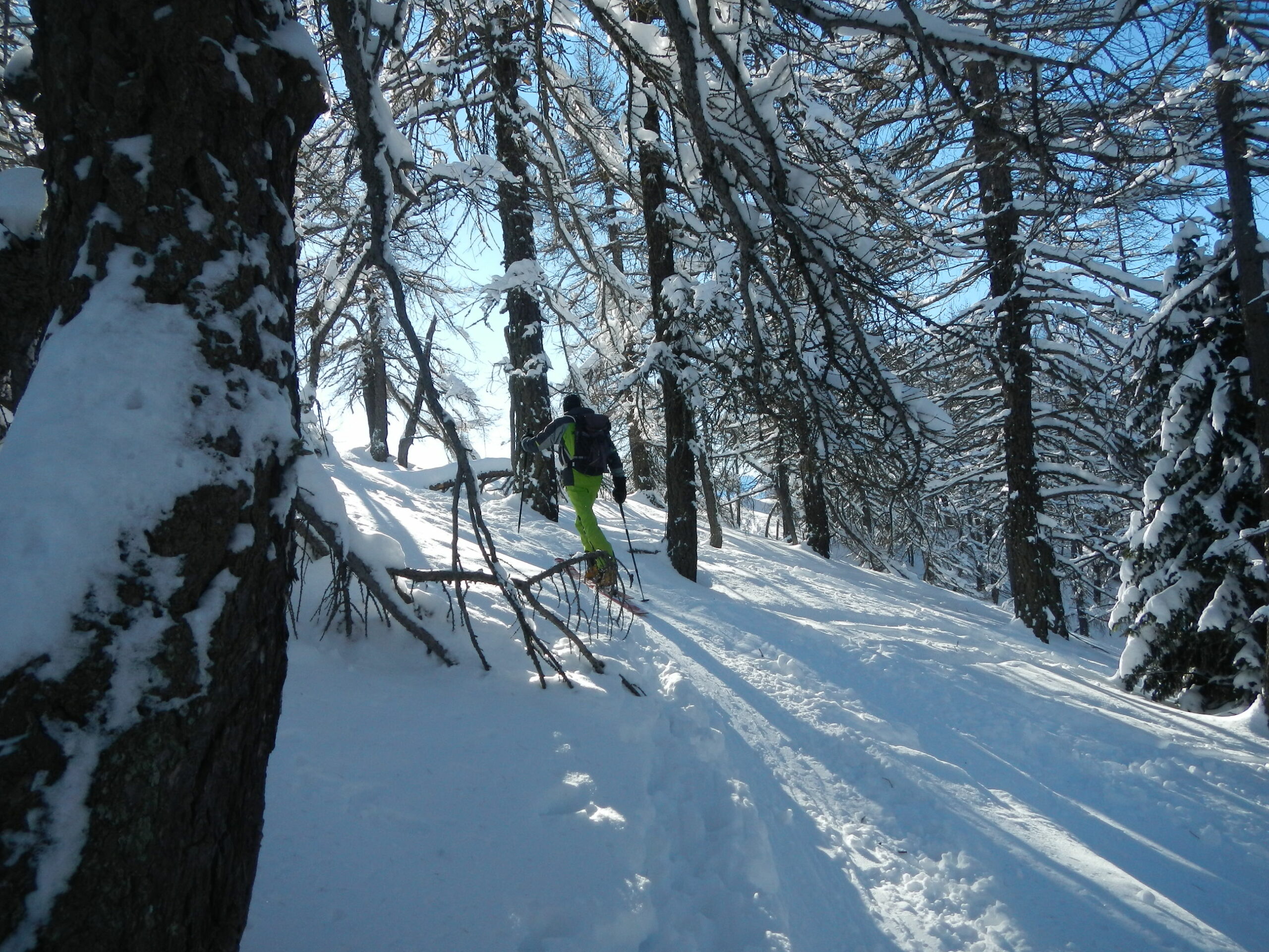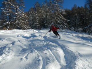 L’itinerario non presenta pendenze sensibili ma la discesa nel bosco, con questa bella neve, risulta davvero divertente.
