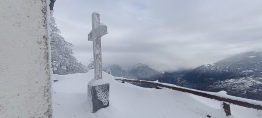 Partiti da Chateau alle 7e 30 arrivati alla cappella verso le 9 e 30 , scesi su abbondante farina per un bel tratto in fondo neve più pesante ma divertente…non so quanto possa durare in queste condizioni.