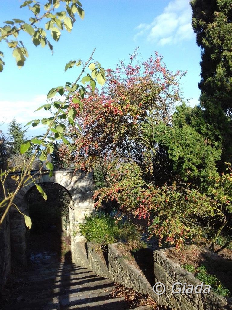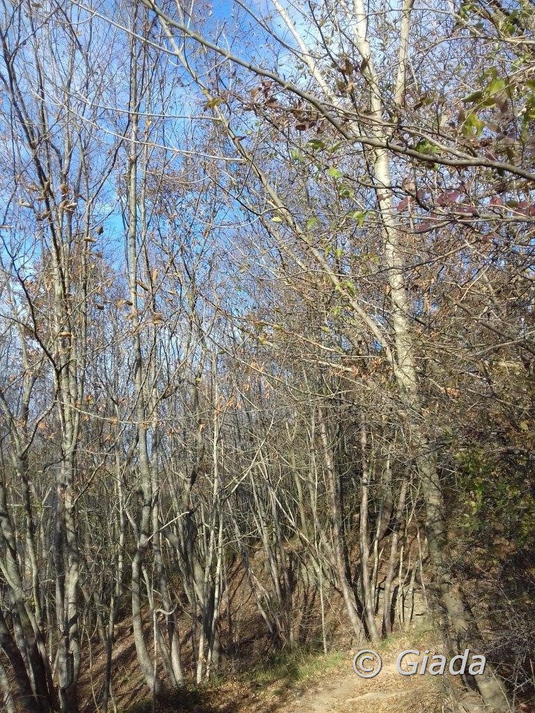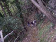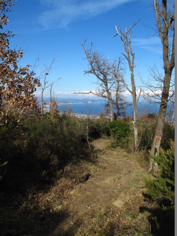 Imboccata la strada asfaltata in salita seguire i due bollini rossi per un tratto di strada asfaltata e poi per sterrata e sentiero, giunti al pilone votivo con Madonnina, proseguire in salita fino al bivio del sentiero dell’Onda a sinistra, imboccarlo e seguire ora il segnavia onda fin sopra ad Alassio, molto panoramico, dove si trova una palina indicatrice. Qui proseguire verso ovest, per il raccordo con l’Avbs alla sella del Bignone, segnavia lineetta bianca e rossa. Giunti alla sella del Bignone, svoltare a sinistra, seguire il segnavia due bollini rossi fino ad una biforcazione del sentiero circa un centinaio di metri prima del bivio per il Pisciavino. (Il Monte Pisciavino o Cima di Vegliasco, si può salire come contornare, sia a destra che a sinistra, io propongo per l’inverno il contornarlo a sinistra all’andata e salirlo al ritorno) Qui svoltare a sinistra lasciando il segnavia due bollini rossi, seguire un sentierino ben marcato ma senza segnavia, che taglia in piano il fianco est del Pisciavino. Giunti sul crinale si tralascia un sentierino sulla destra che torna indietro e sale direttamente sul Pisciavino. Proseguire e lasciare subito dopo il bivio precedente, un altro bivio a sinistra con palina indicatrice per Alassio, proseguire in discesa verso destra su mulattiera fino a giungere in breve sulla strada sterrata che sale sul Pisciavino. Seguire la strada sterrata in salita, sul fianco sud del Pisciavino, fin ad un tornante verso destra dove la si lascia per imboccare un sentiero che parte verso sinistra sull’esterno del tornante. Seguire il sentierino pianeggiante verso ovest fino a giungere di nuovo sul sentiero due bollini rossi, al bivio del sentierino che sale da ovest sul Pisciavino, palina. Proseguire verso sinistra col segnavia due bollini rossi, dopo un piccolo tratto di strada asfaltata si entra nel parco del santuario, stazioni della via Crucis, si giunge infine al bel Santuario della Madonna della Guardia m.585.