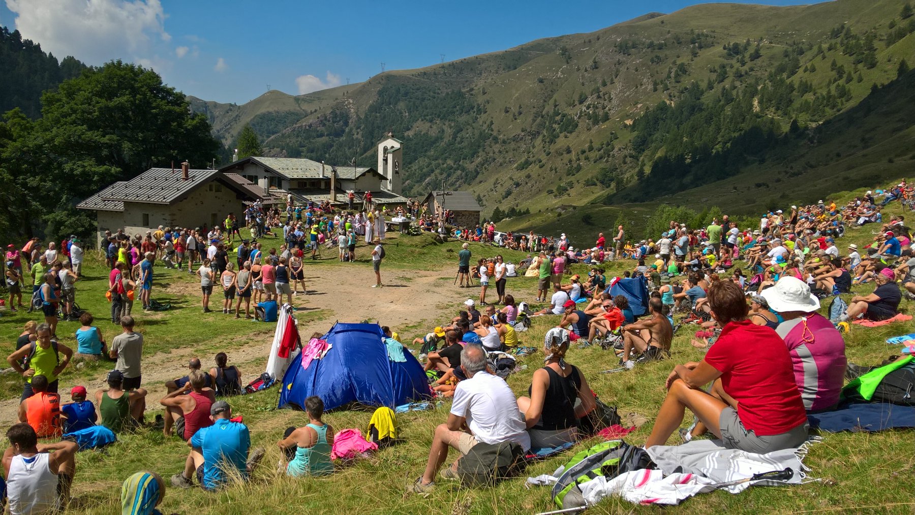 Ho preferito salire al rifugio Buzzoni per valle ombreggiata fino all’inizio della salita al passo del Toro e da li al rifugio Grassi, superato lo spartiacque sono sceso verso le baite del Sasso e da li al santuario dove e’ stata celebrata la Messa con la partecipazione di numerosissime persone.