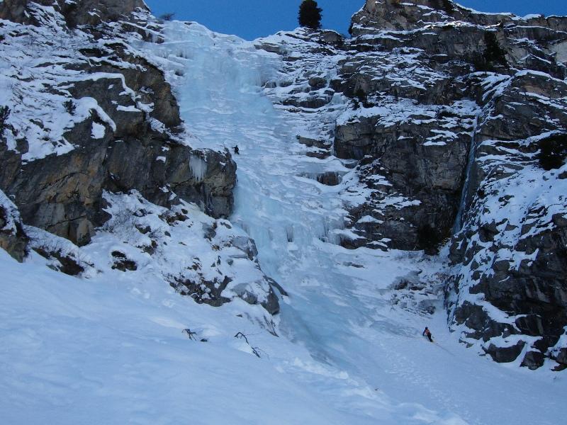 la cascata si sale in tre o quatro tiri con percorso non obbligato visto la sua larghezza di 50m!!!massimo muretti a 85 à 90°.