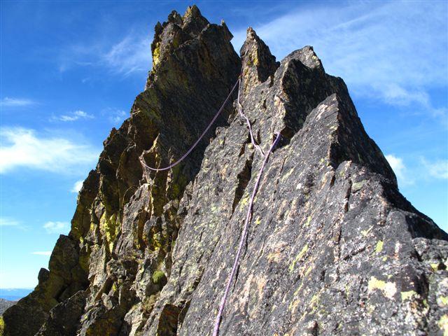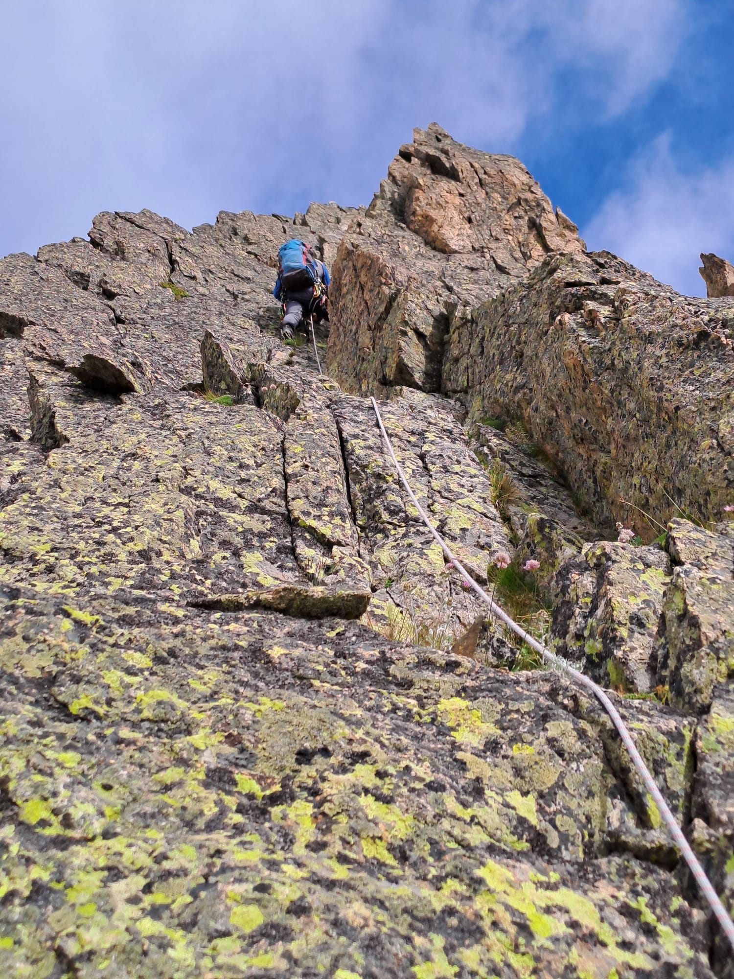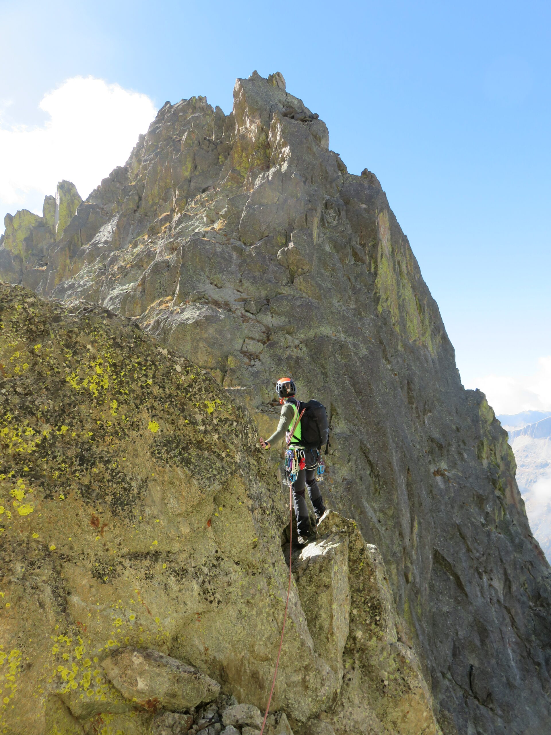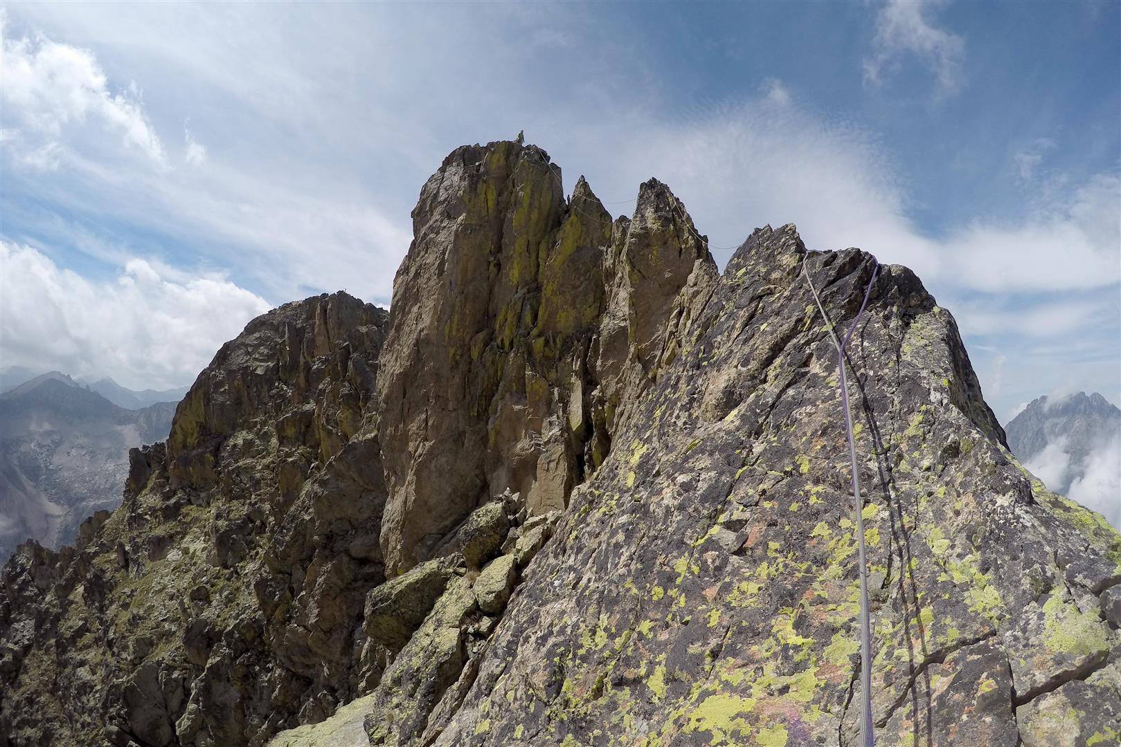 Dal colletto dei Camosci lungo il filo di spigolo (leggermente a sx, 2 ch.), per un diedro verticale fino al suo termine (IV+); da un piccolo terrazzo superare un tratto leggermente strapiombante (IV) che precede nuovamente la cresta, cui si giunge per un canalino che ora si abbatte (sosta a fix e clessidra). Scendere un gradino a sx, quindi traversare lato Sud fino ad un camino che riporta in cresta (III+/IV). Spostarsi leggermente a dx, quindi proseguire fino a riprendere il filo. Aggirare un gendarmino sulla dx, uscendo nel camino con passetto aggettante, in breve si raggiunge la cima Est. Scendere disarrampicando verso dx fino a trovare una sosta a ch. con cordino, con una doppia da 20m si scende fino all’intaglio tra le due cime. Spostarsi sul terrazzino lato Nord e salire la placca verticale (IV+, 2 ch.) si raggiunge l’affilato spigolo a sx; di qui per il filo (IV), poi a dx per una paretina verticale, quindi nuovamente lungo lo spigolo (sosta a ch. e fix), subito sotto la cima Ovest. Spostandosi poi più a O sull’anticima, si scende disarrampicando le placche delicate sulla dx (III) fino ad uno sperone sulla verticale del colletto De Cessole, su cui si scende con due corde doppie da 30 metri (chiodi e cordini sul posto). Diff. D- (IV+).
