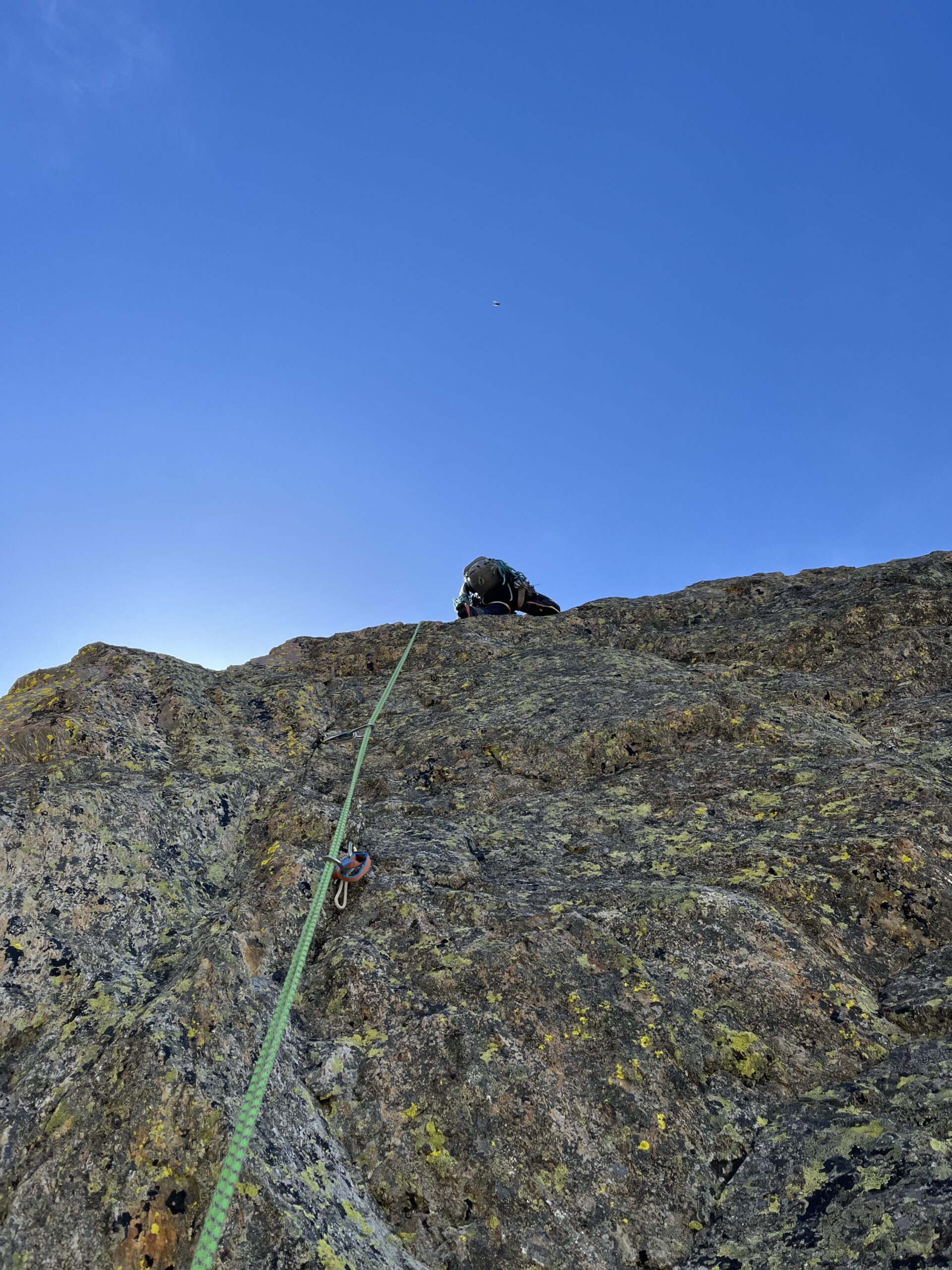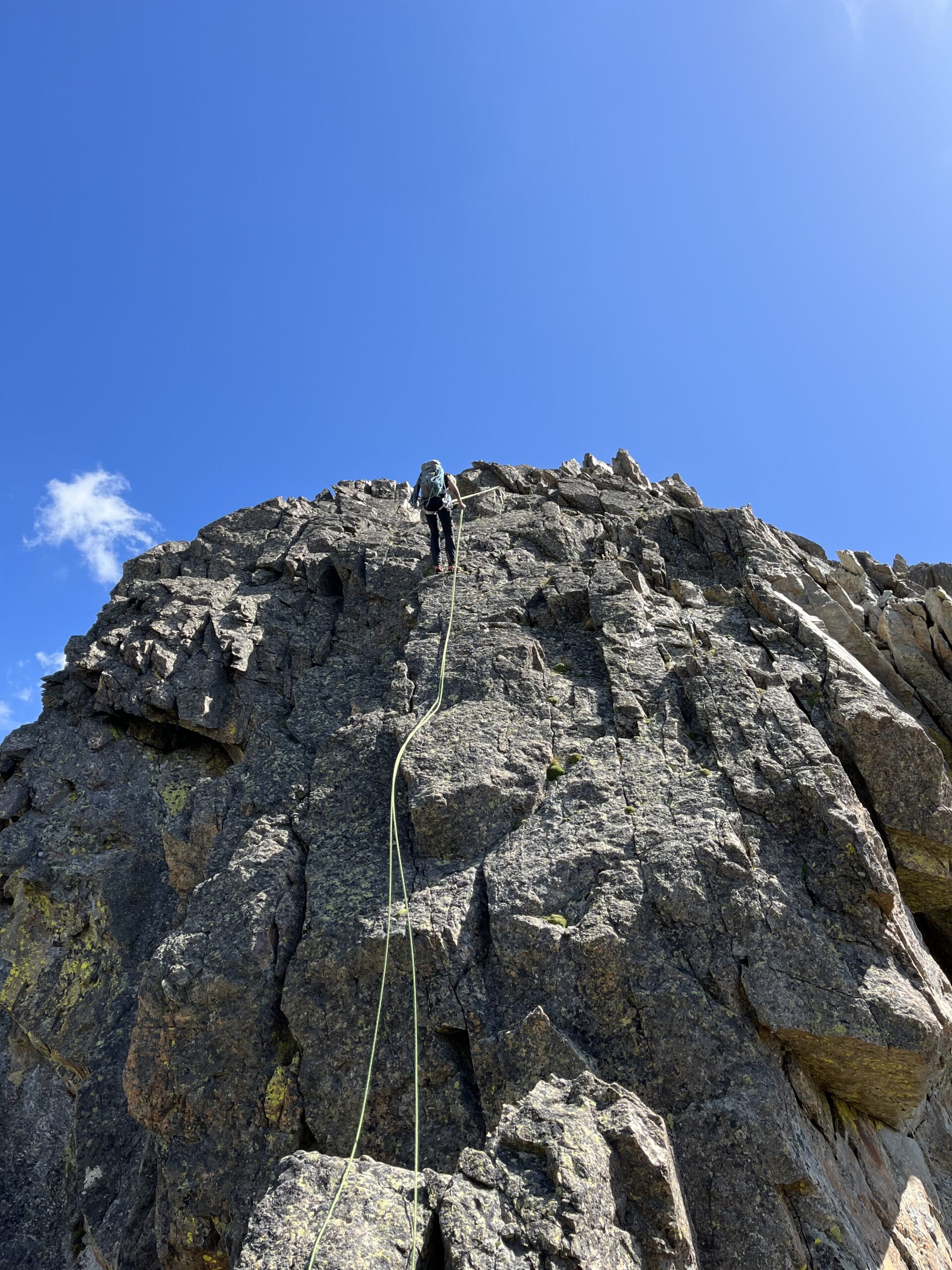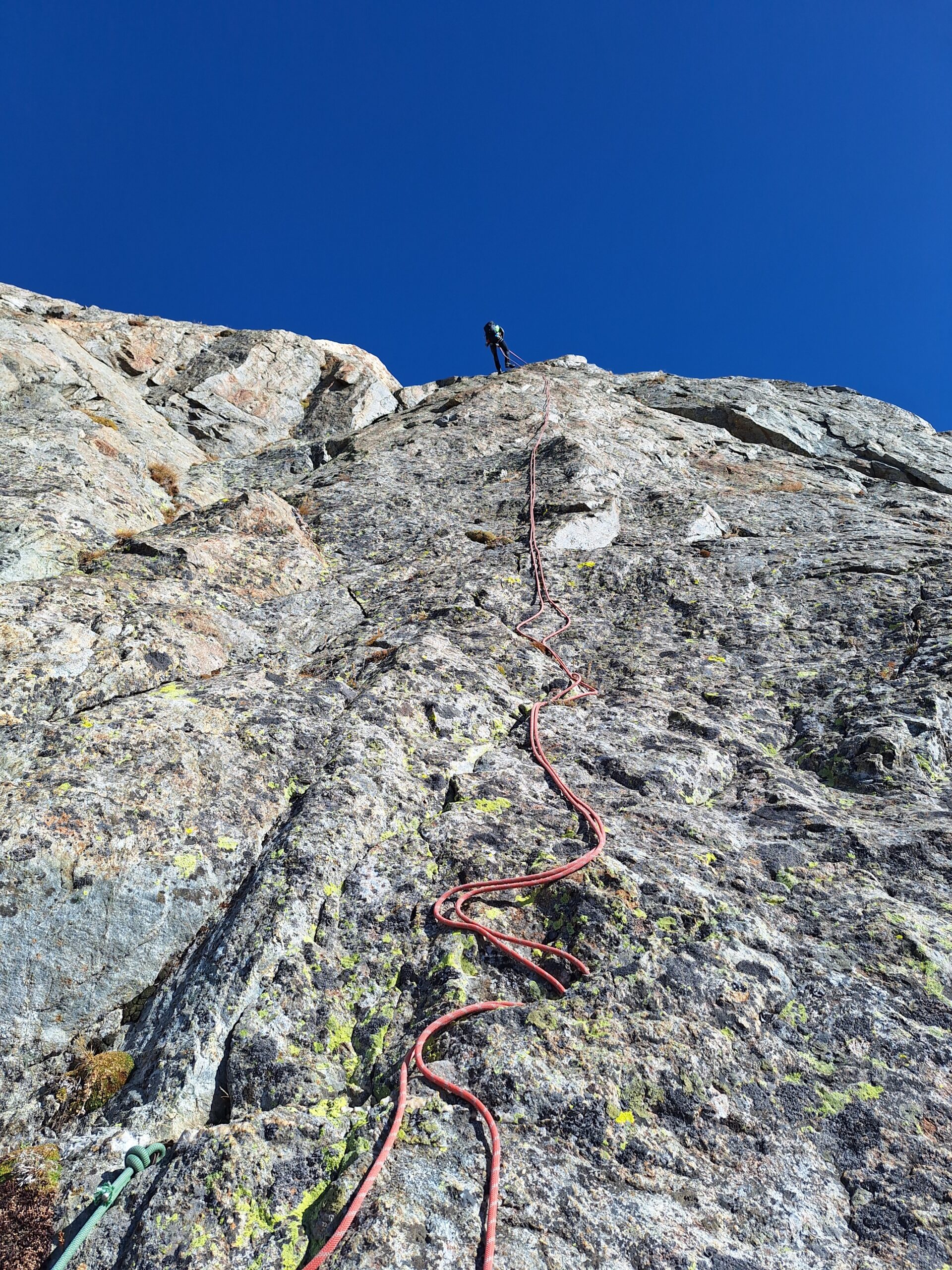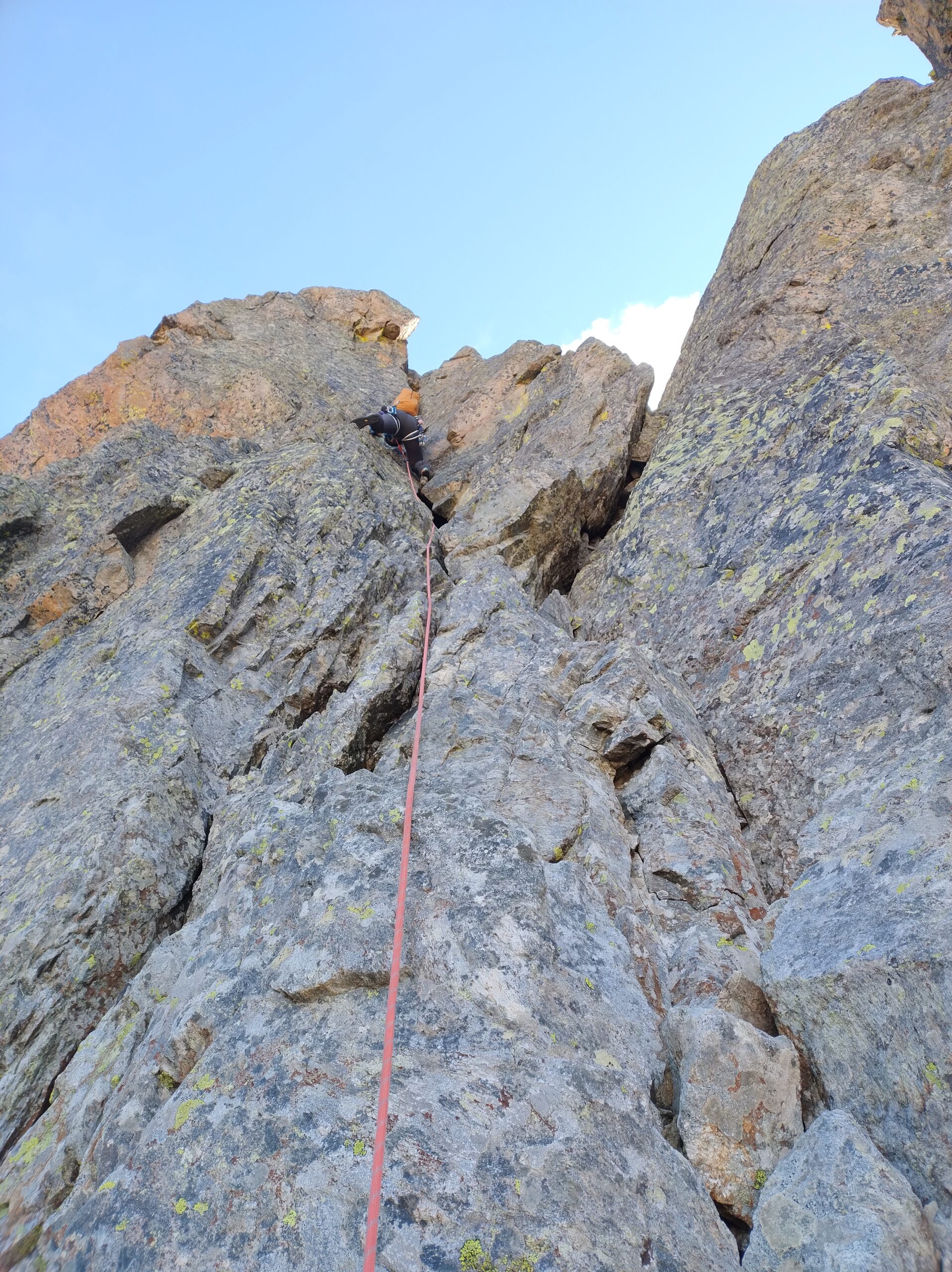 Dal colletto dei Camosci lungo il filo di spigolo (leggermente a sx, 2 ch.), per un diedro verticale fino al suo termine (IV+); da un piccolo terrazzo superare un tratto leggermente strapiombante (IV) che precede nuovamente la cresta, cui si giunge per un canalino che ora si abbatte (sosta a fix e clessidra). Scendere un gradino a sx, quindi traversare lato Sud fino ad un camino che riporta in cresta (III+/IV). Spostarsi leggermente a dx, quindi proseguire fino a riprendere il filo. Aggirare un gendarmino sulla dx, uscendo nel camino con passetto aggettante, in breve si raggiunge la cima Est. Scendere disarrampicando verso dx fino a trovare una sosta a ch. con cordino, con una doppia da 20m si scende fino all’intaglio tra le due cime. Spostarsi sul terrazzino lato Nord e salire la placca verticale (IV+, 2 ch.) si raggiunge l’affilato spigolo a sx; di qui per il filo (IV), poi a dx per una paretina verticale, quindi nuovamente lungo lo spigolo (sosta a ch. e fix), subito sotto la cima Ovest. Spostandosi poi più a O sull’anticima, si scende disarrampicando le placche delicate sulla dx (III) fino ad uno sperone sulla verticale del colletto De Cessole, su cui si scende con due corde doppie da 30 metri (chiodi e cordini sul posto). Diff. D- (IV+).