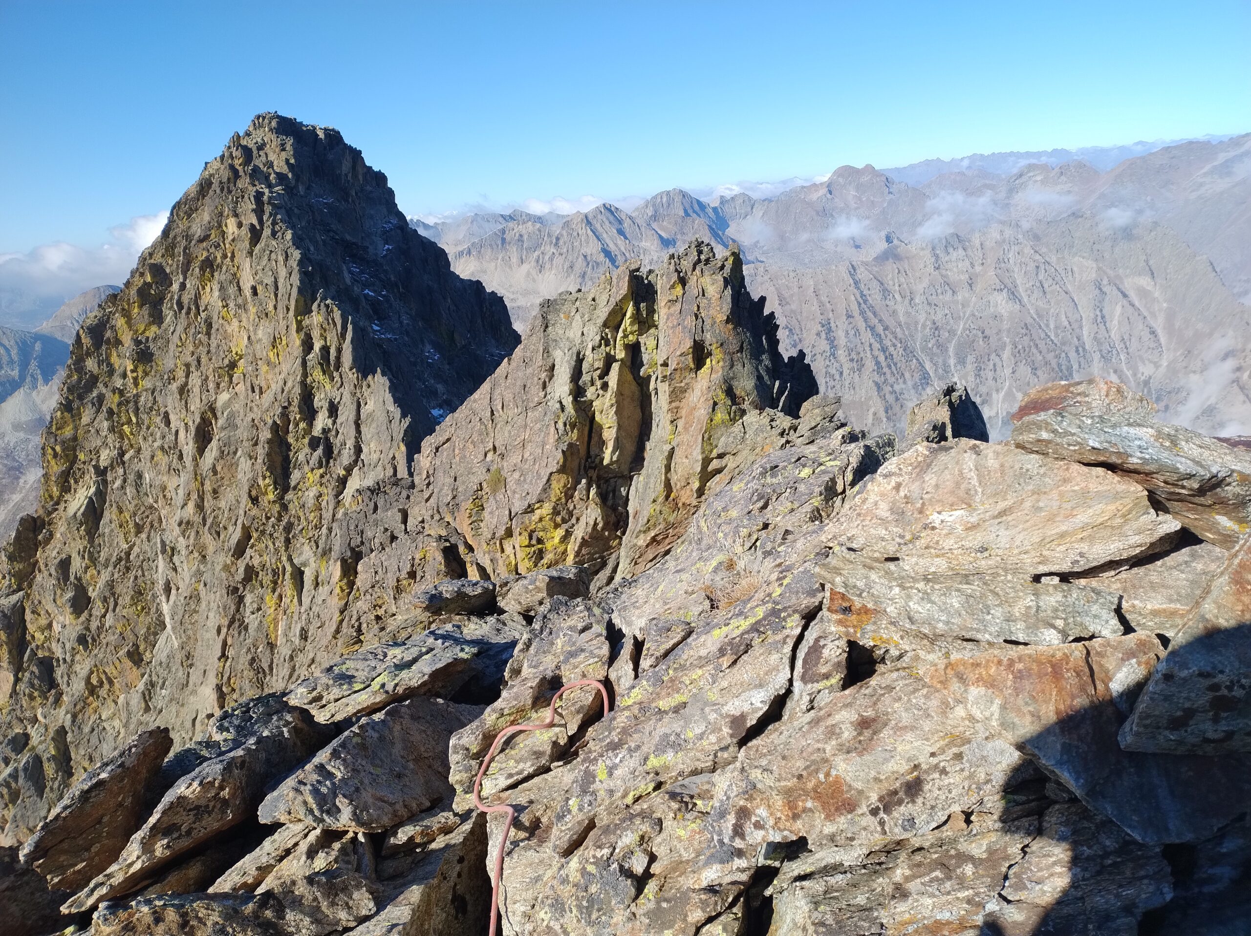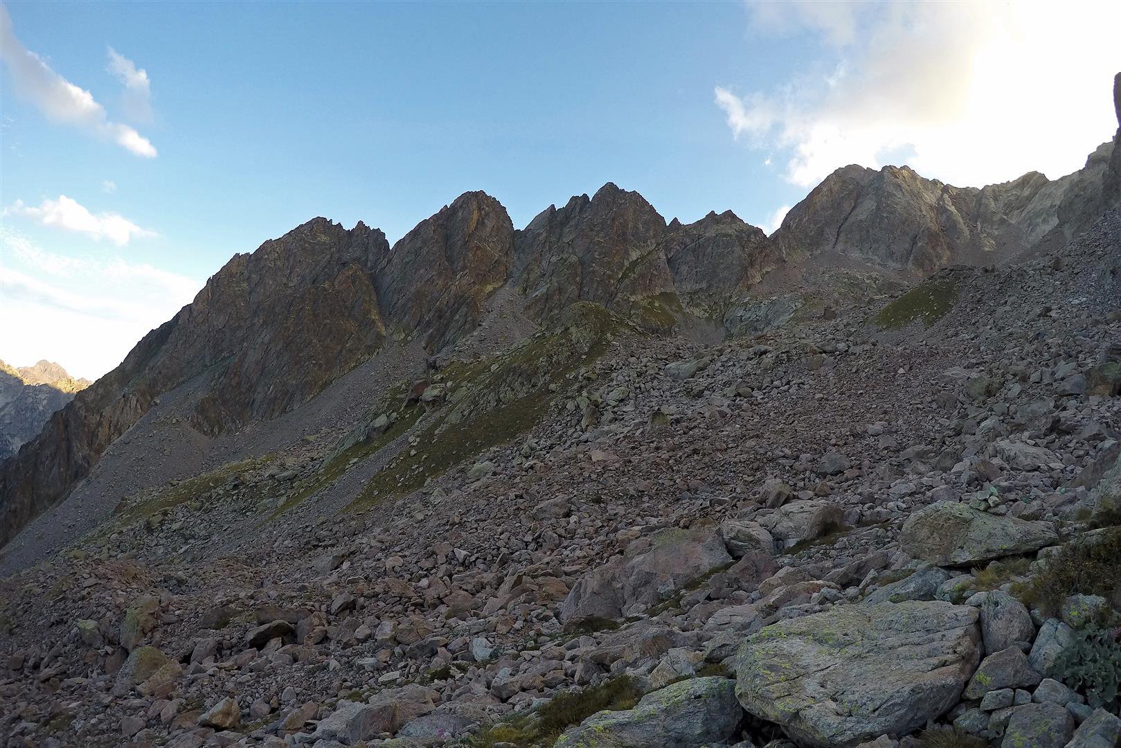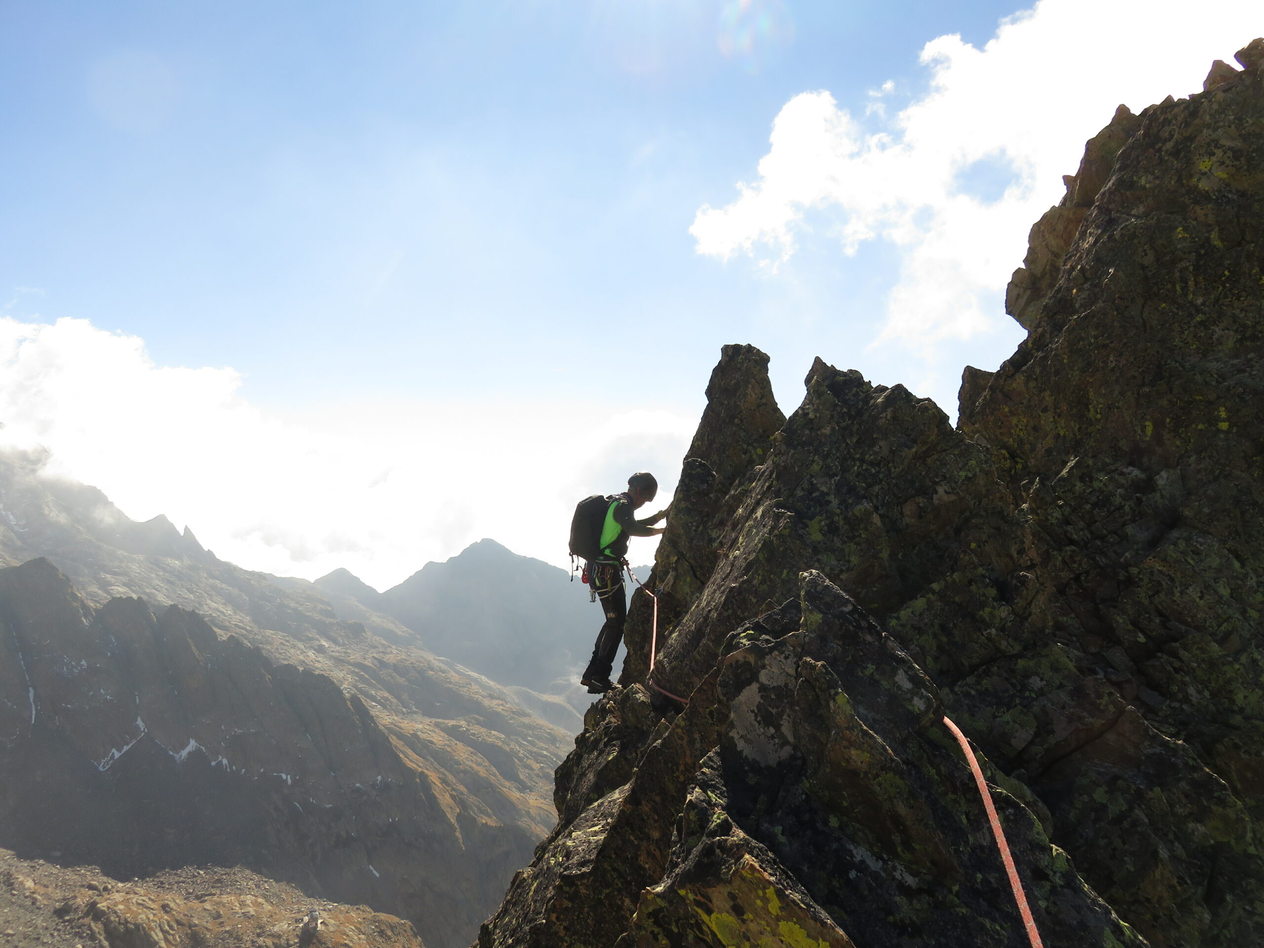 Prima vetta: Cima dei Camosci m.2860 costituita da due punte, Est ed Ovest alte pressoché uguali. Salita dalla cresta est con discesa dalla cresta ovest. Partenza a sinistra del colletto Freshfield.