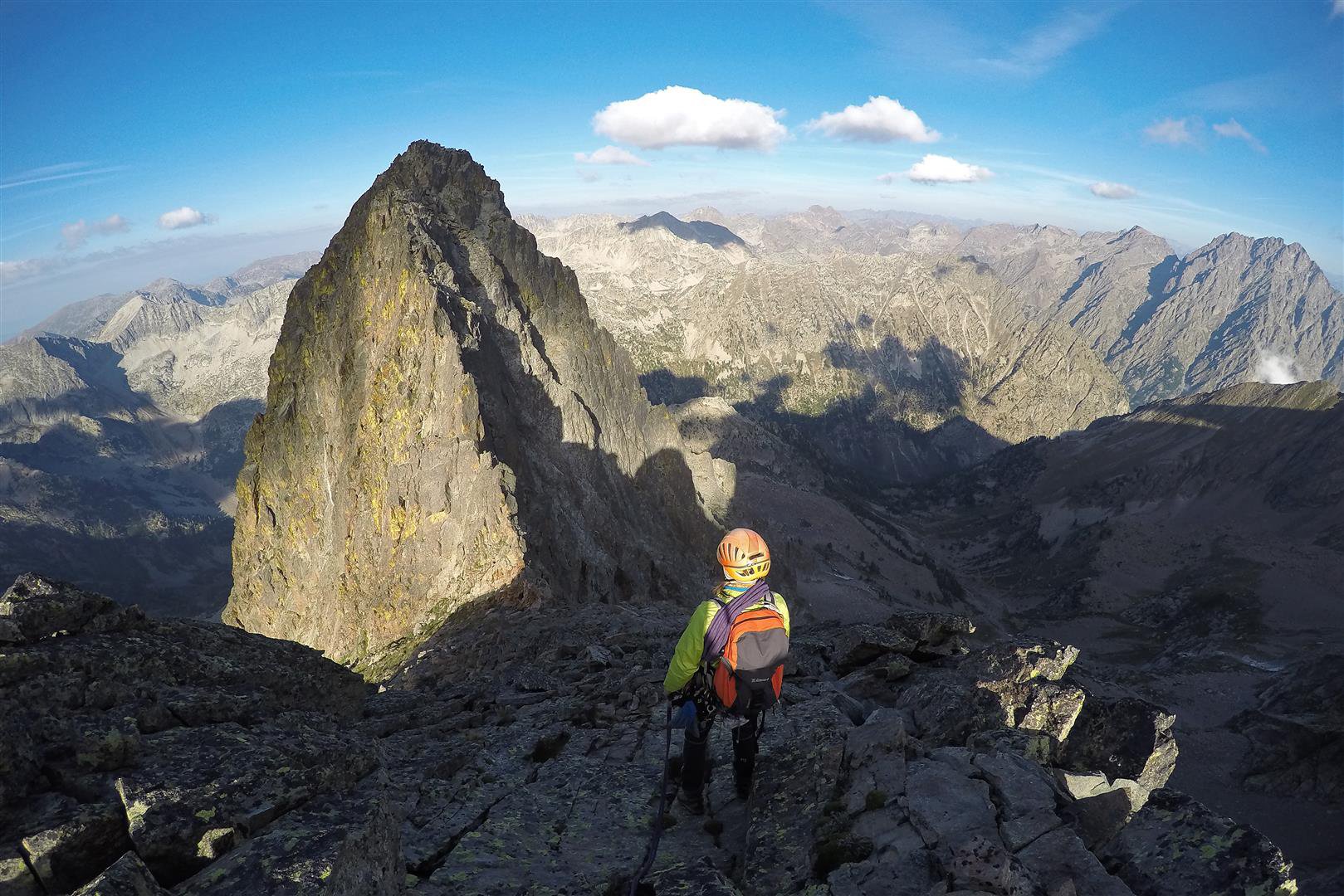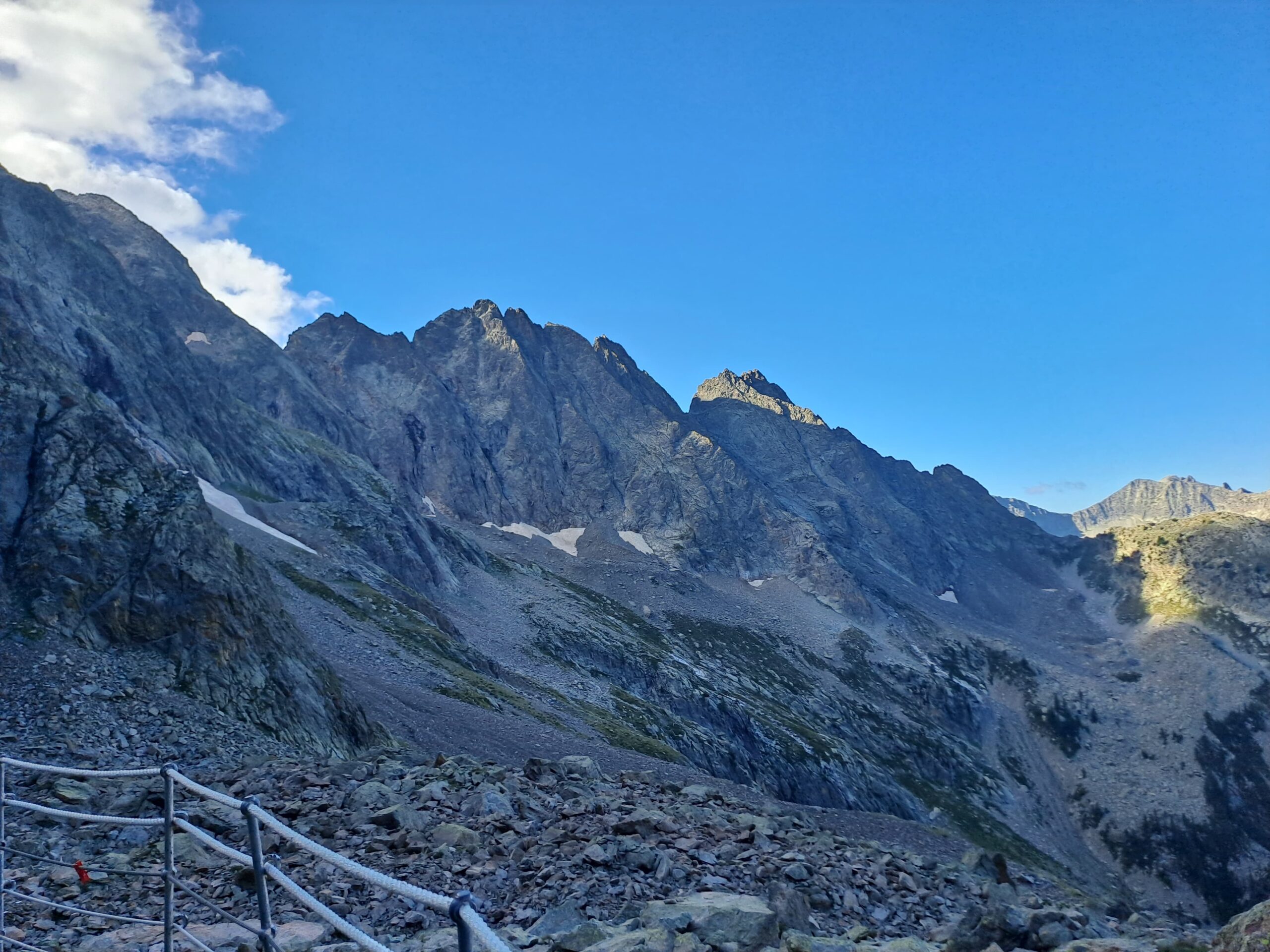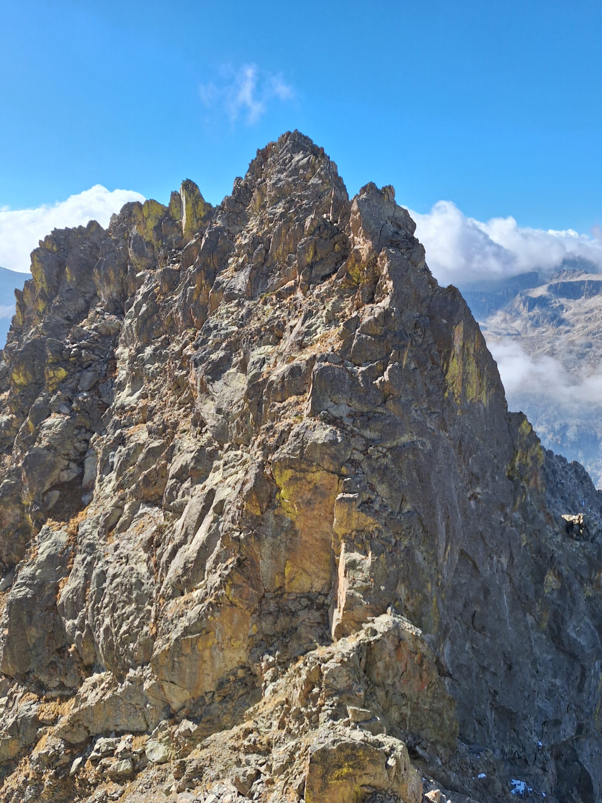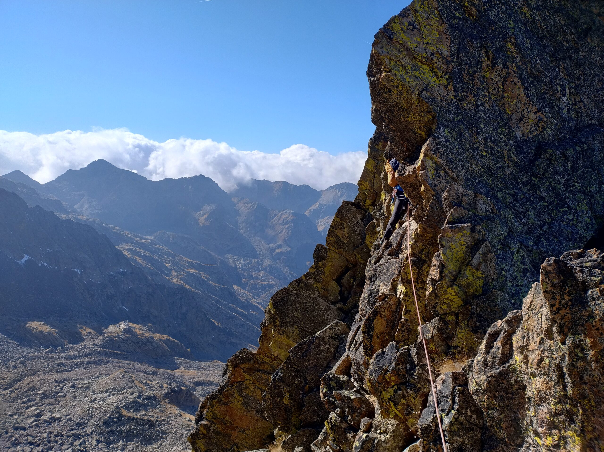 Prima vetta: Cima dei Camosci m.2860 costituita da due punte, Est ed Ovest alte pressoché uguali. Salita dalla cresta est con discesa dalla cresta ovest. Partenza a sinistra del colletto Freshfield.