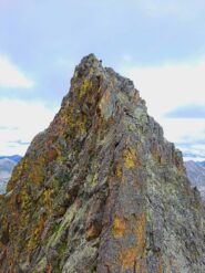 Dal colletto De Cessole per un primo tratto verticale si perviene ad un intaglio laddove la cresta si allarga; si sale diritti poi a dx su un blocco ed in seguito a sx fino ad un terrazzino (III+). Si aggira un risalto a dx giungendo presso un ripiano alla base di un camino con lichene giallo sulla sx. Lo si affronta (uscita leggermente strapiombante, III) e si raggiunge la cresta e di lì, seguendo una cengia lato Sud (ch.) fino in vetta. Dalla vetta scendere la cresta ovest alla meglio disarrampicando e tramite un ampio canale e rampe fino al colletto della Madre di Dio. Diff. AD- (III+)
