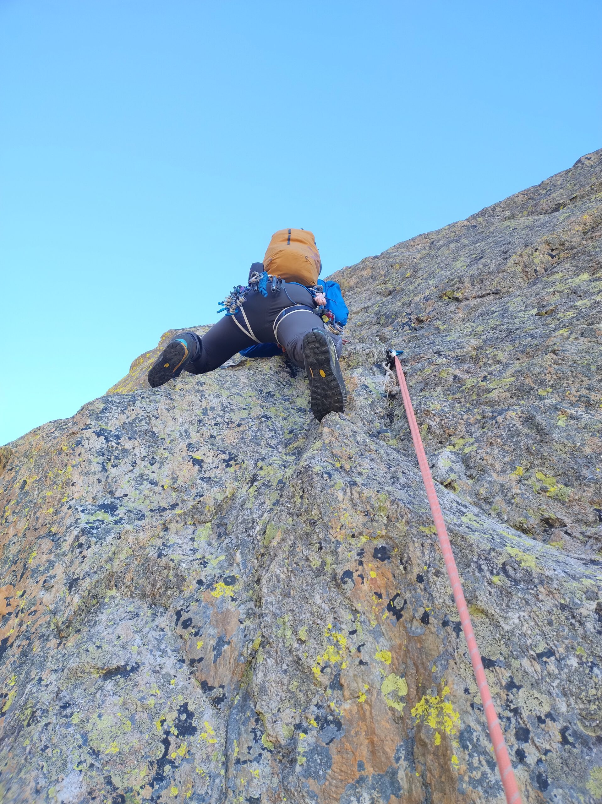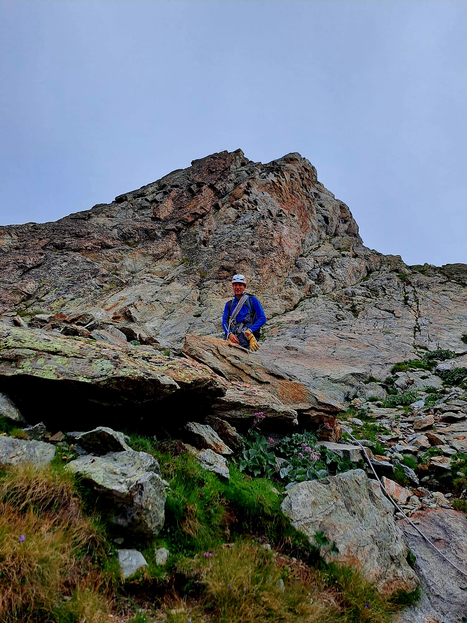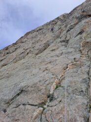Dal colletto della Madre di Dio salire direttamente per rocce grigie verticali per circa 15 metri fino ad un terrazzino (sosta su clessidra). Spostarsi a sx su una crestina che muore contro una parete verticale grigia, solcata da una breve fessura (V-, ch.) ed una successiva fessura-camino (III) che conduce all’intaglio sotto al torrione giallastro. Si va a sx in direzione di una facile cengia fino ad un intaglio, che si aggira a sua volta a Sud lungo una cornice esposta (III+), prima in piano e poi in salita lungo un canale portarsi in cresta dove in breve si arriva sulla cima Est. Successivamente discendere all’intaglio tra le due vette, tenendosi sul versante N, scendere pochi metri a dx per contornare lo sperone roccioso che dà sulla forcella, aggirandolo lungamente lungo una cengia esposta con uscita aggettante alla base del muro finale, caratterizzato sulla dx da una grande camino. Qui 3 opzioni: i) prendere a sx la fessura-diedro (V) che sbuca direttamente a sx della Madonnina sulla cima Ovest; ii) alla base della fessura andare a dx in una specie di canale camino più facile; iii) salire l’evidente grande camino sulla dx (cordino incastrato a metà). In alternativa, questo passaggio più impegnativo è evitabile sul lato Sud, dalla forcella continuando sulla via normale fino in vetta. Diff. D- (V- e V).