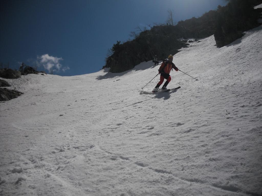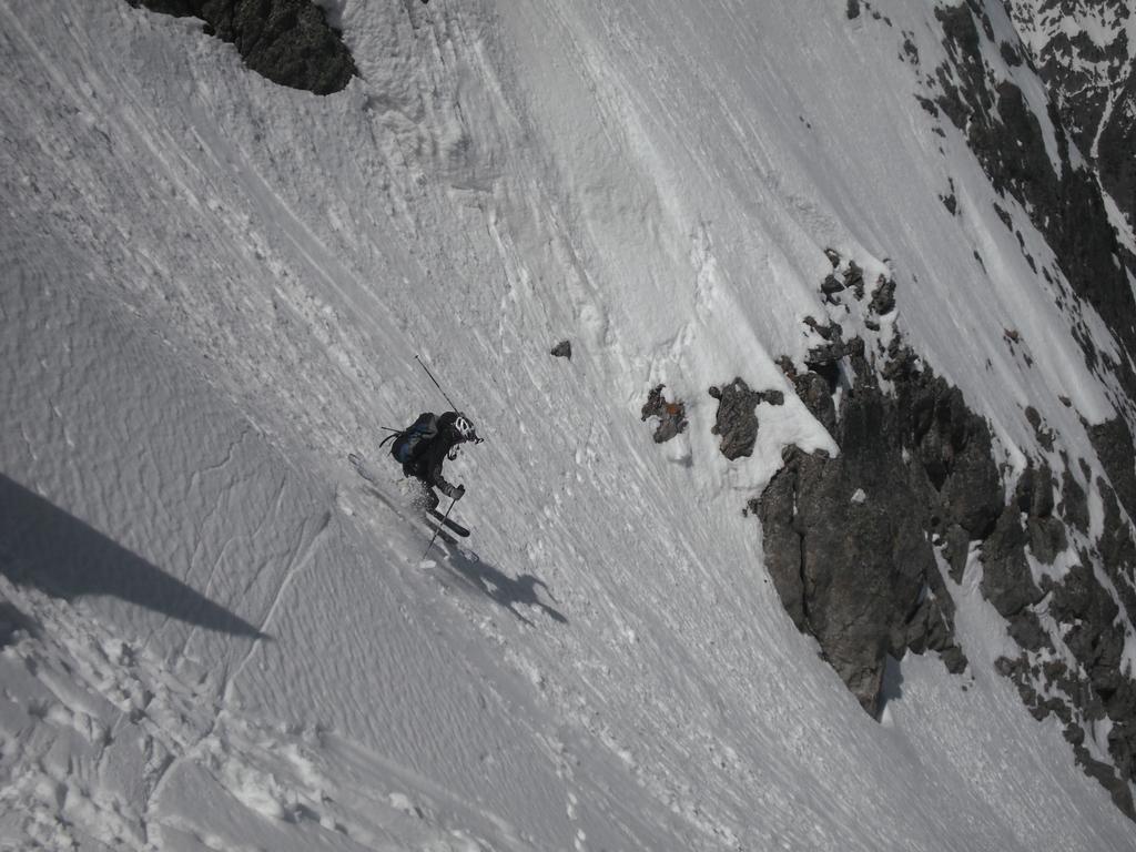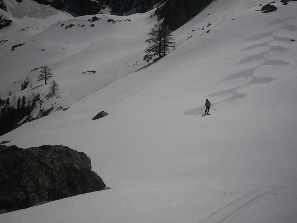 Si inizia nella parte bassa sui 30-35° per uscire con una strettoia a 40° o poco più.