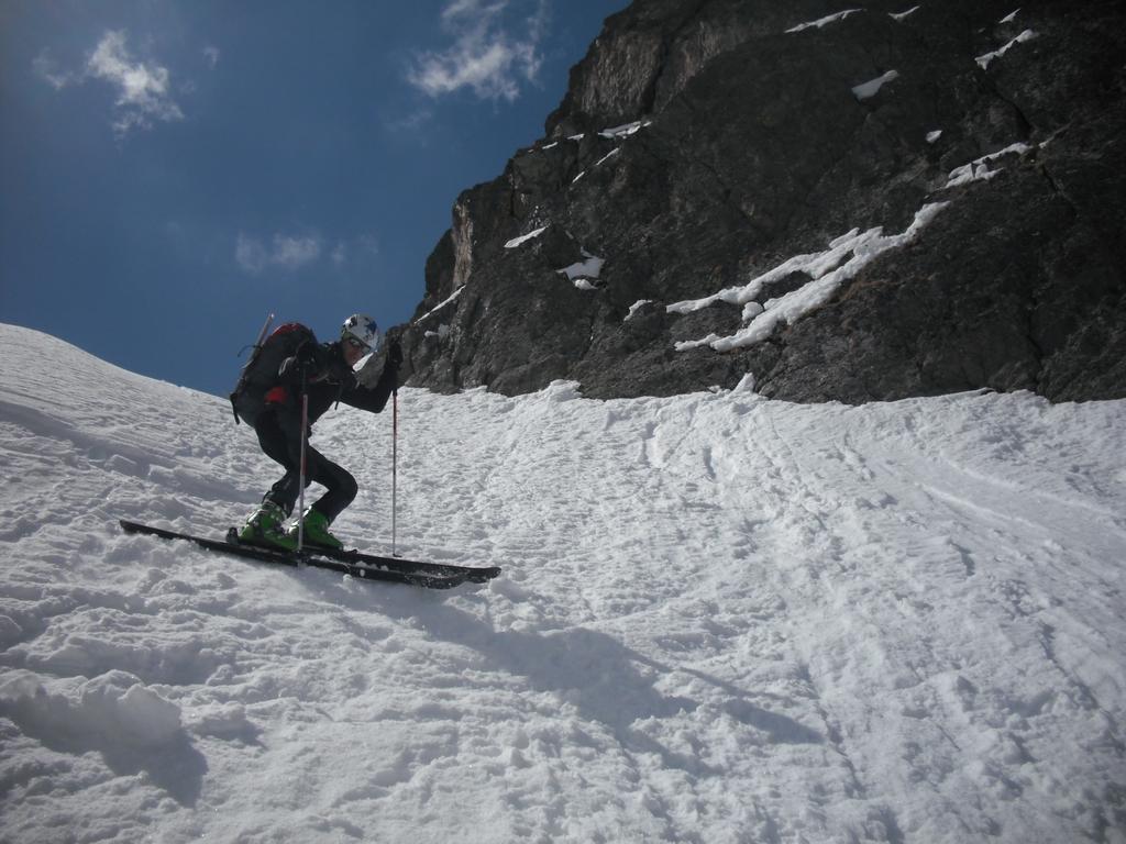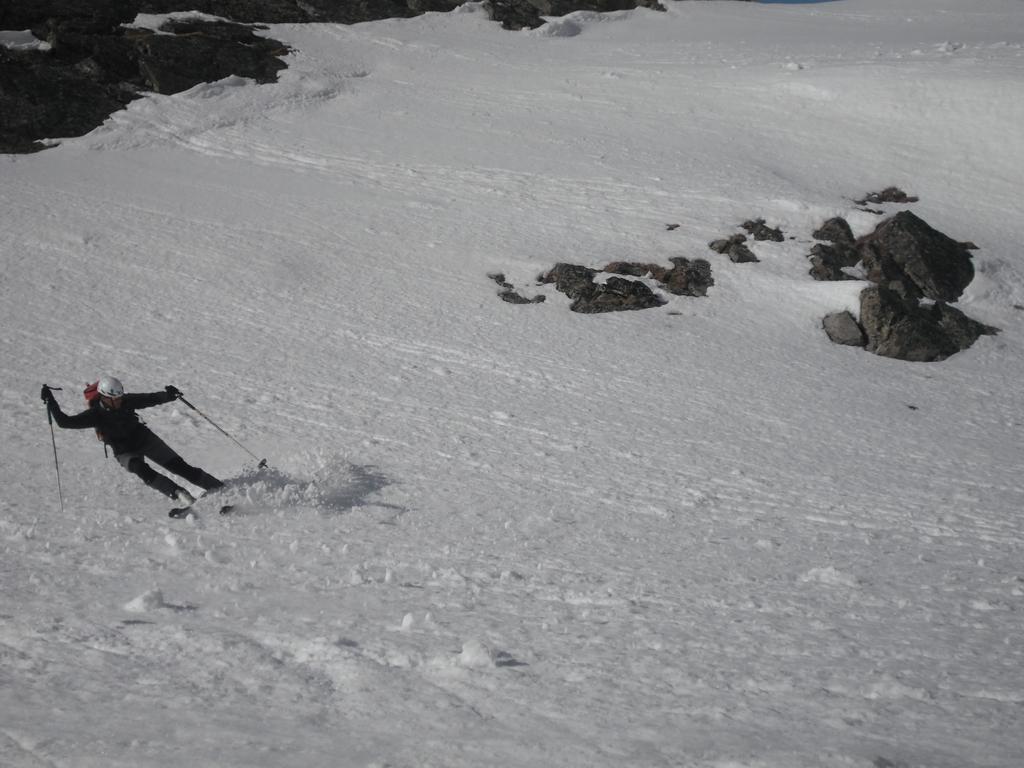 scesi alle 12 su neve che in alto non voleva saperne di mollare.Il canale è ostruito quasi per intero da resti di slavine durissime e insciabili, rimangono libere le contropendenze di sinistra più ripide e su neve comunque beton che rendono la discesa tecnicamente più difficile del normale.