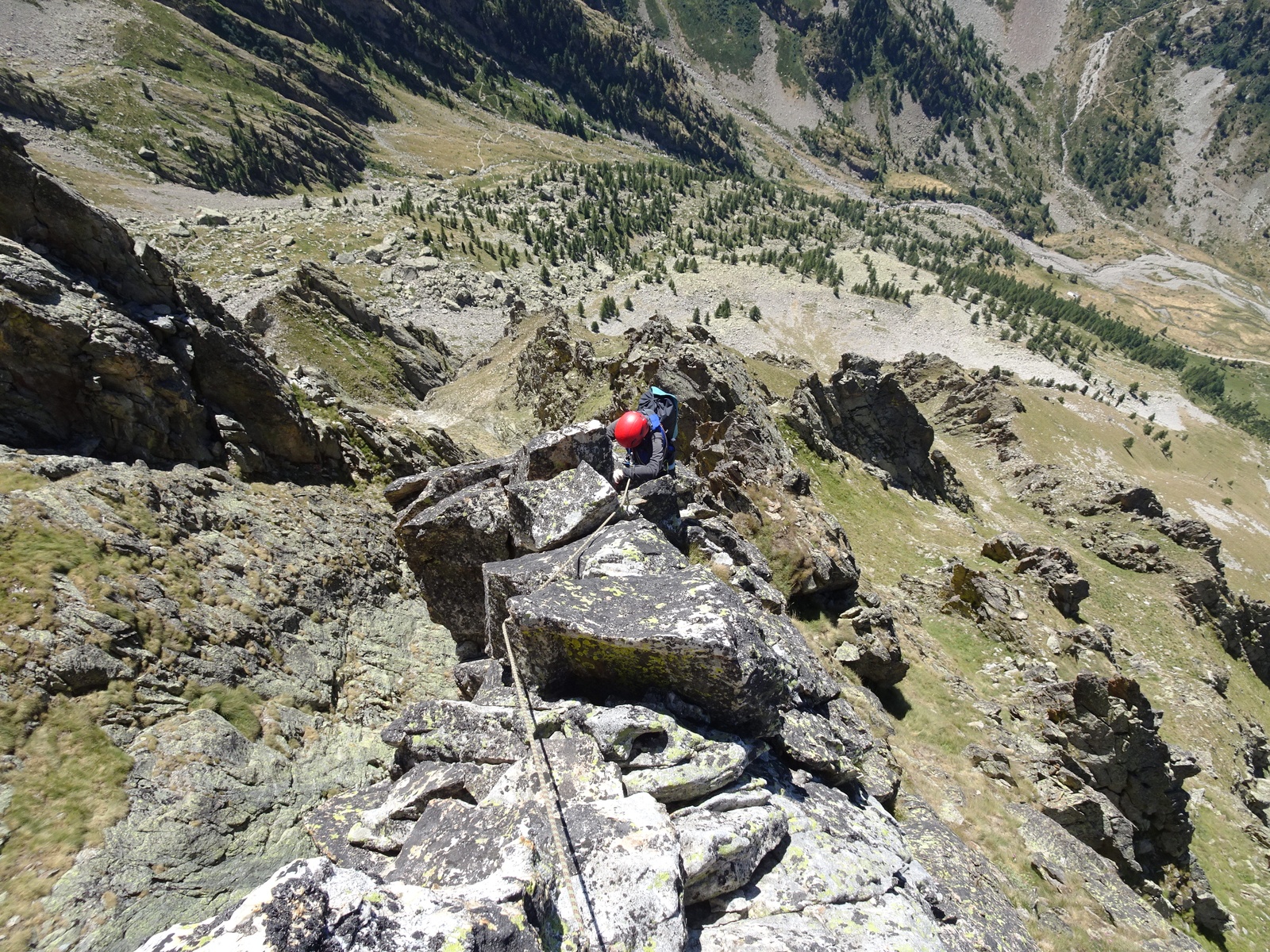 Qui inizia il crestone. Le prima placche si vincono direttamente (III/III+) o si evitano per teppe a sx, quindi si prosegue sul poco marcato sperone superando un torrione (II/II+ ultimi metri da evitare a sx). Si raggiunge così un colletto dove passava un tempo il vecchio sentiero di collegamento fra i rifugi Remondino e Bozano (ormai quasi invisibile).