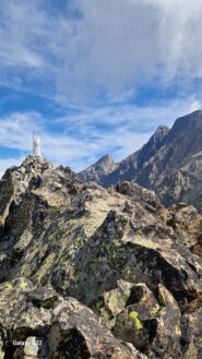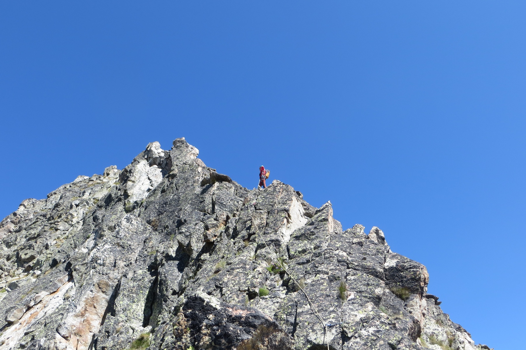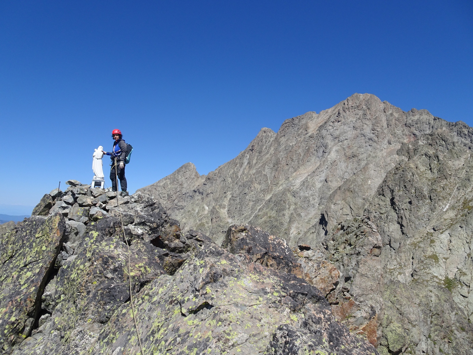 L’arrampicata diventa ora più aerea, continua, a tratti anche esposta, su roccia a tratti molto bella e lavorata, con difficoltà fra il II e il III+. Si segue sempre il filo del crestone (a sx passa la via normale a dx c’è un profondo canalone). A q. 2700 si raggiunge un colletto dove c’è un ometto della normale ma si prosegue sul filo, fino alla cima ovest o della Madonna (III-II).