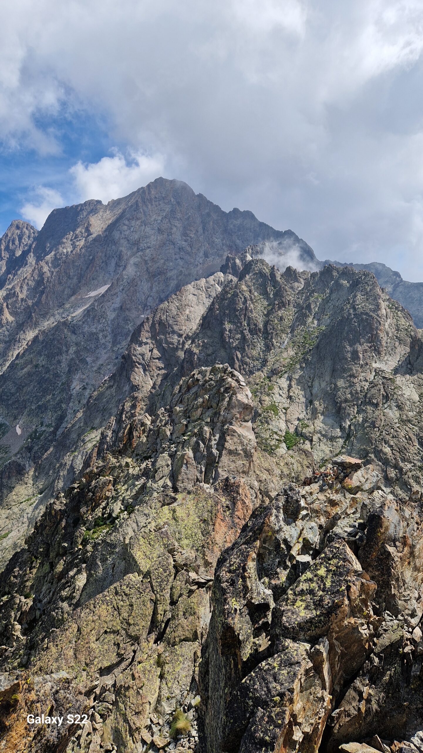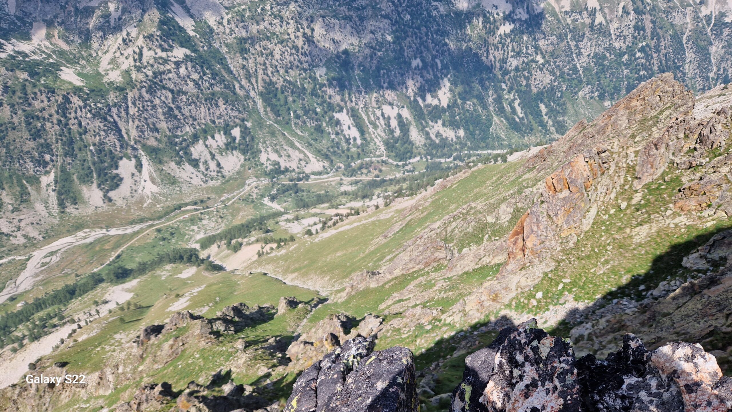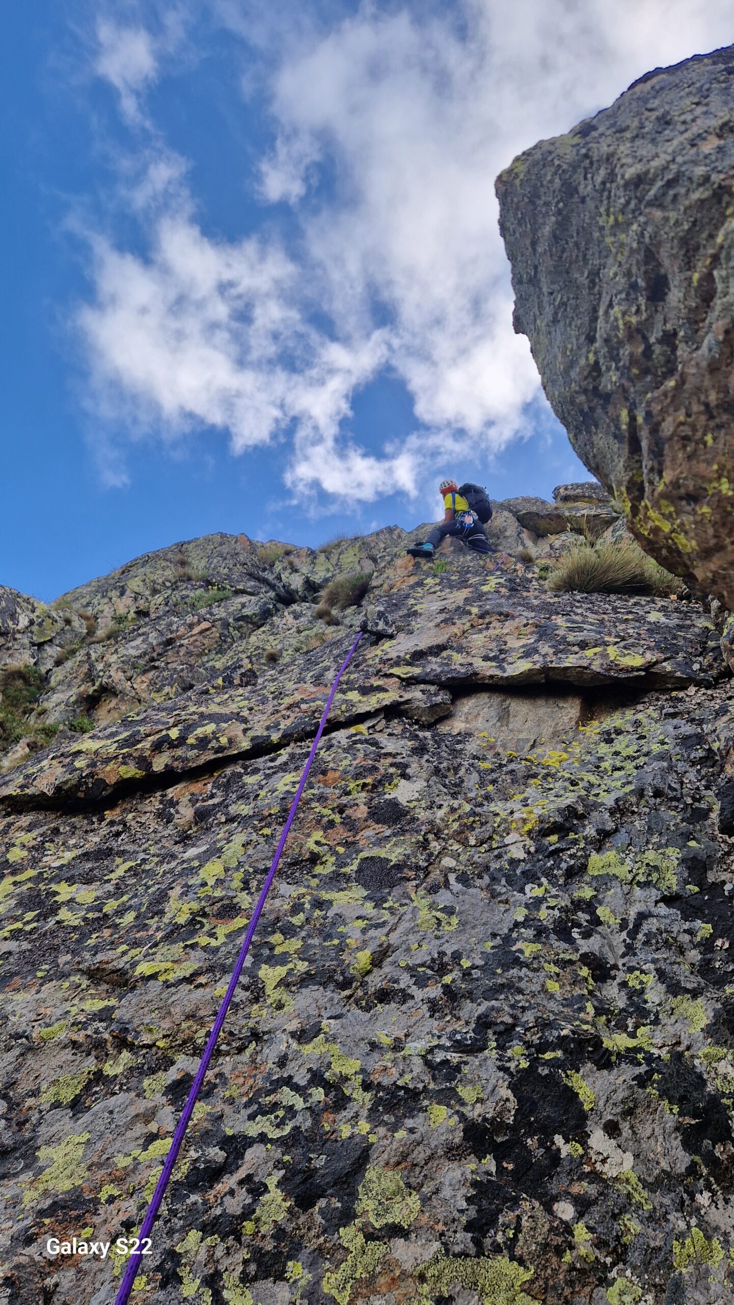 Si attaccano le placche successive e il salto che segue a queste (II/III). Si raggiunge così a 2500m circa il nuovo sentiero Bozano-Remondino dove si trovano anche gli ometti della via normale del versante OSO. Ci si tiene ora alla loro dx senza raggiungere subito l’evidente crestone tutto a dx ma raggiungerne il filo più in alto.
