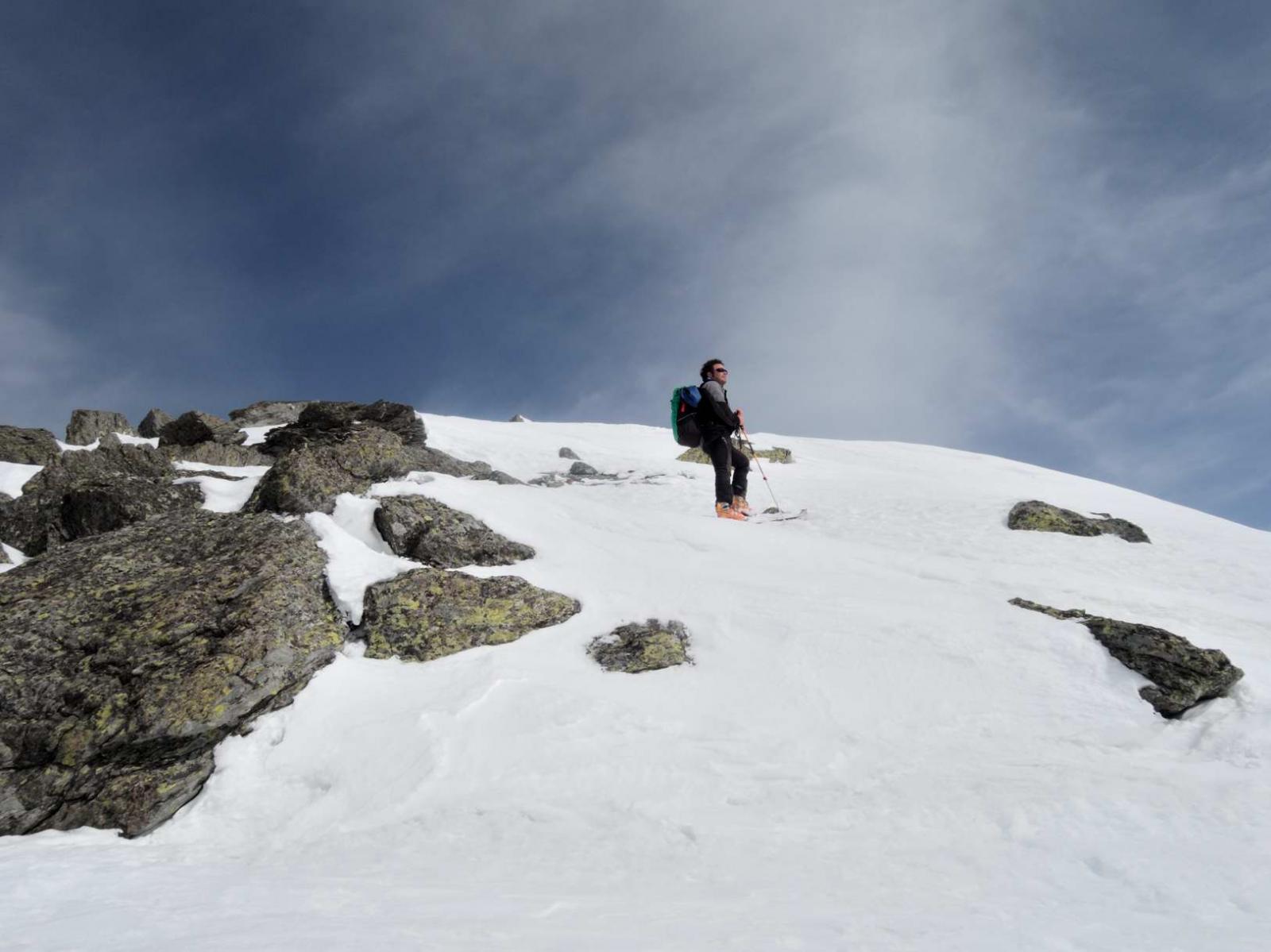 In discesa ci spostiamo leggermente a sinistra per evitare le rocce affioranti e troviamo, nel tratto più ripido e tecnico, neve polverosa indurita come succede solitamente alle quote maggiori, ottima superficie per affrontare in relativa sicurezza simili pendenze. Più in basso si alternano condizioni di neve poco trasformata negli avvallamenti meno esposti al sole, e tratti con neve cedevole dove il sole, pur velato, ha avuto modo di lavorare la superficie. In alcuni tratti la sciata è piacevole su neve che ricorda il miglior firn ma la consistenza cambia spesso obbligandoci a continue correzioni d’assetto.