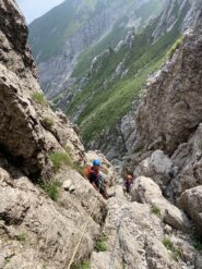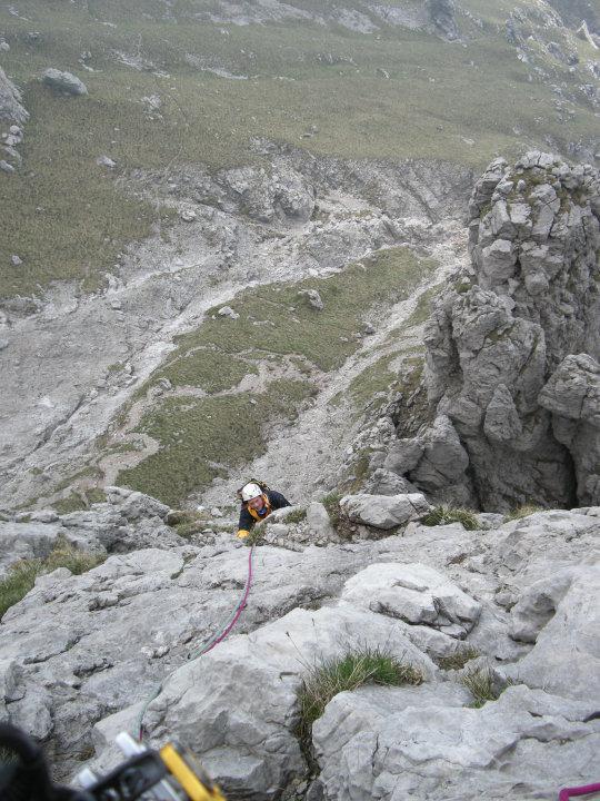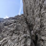 - L4:Dalla sosta si sale ancora per qualche metro dapprima in verticale (fix) e poi in diagonale verso sinistra, definitivamente in direzione dello spigolo di sinistra della parete. Si dovrà raggiungere lo spigolo piuttosto in alto, nel punto in cui il suo profilo si fa più verticale, in corrispondenza di una paretina liscia. Raggiunto lo spigolo si riconoscerà il punto giusto, indicato da un buon chiodo (attenzione: il chiodo è infisso molto profondamente in una fessurina ed è visibile solo da molto vicino, oltre che scomodo da moschettonare); appena sopra al chiodo potrebbero essere visibili i segni di una piccolo franamento. In questo punto la soluzione più semplice consiste nel portarsi a sinistra fin dentro al diedro dell’Albertini: nel marcatissimo diedro sarà possibile aiutarsi anche con gli abbondanti appigli della paretina di sinistra; altrimenti sarà possibile salire con più fatica la paretina in corrispondenza dello spigolo ed entrare nel diedro poco più avanti. Da qui si segue integralmente il diedro (passaggi di IV), tra manigliette ed appoggi sempre più unti; ci si troveranno un primo fix, a pochi metri dal punto di ingresso, quindi una coppia di solidi chiodi appaiati, ed infine un ultimo fix, più o meno nel punto di uscita. Si abbandona il diedro nel punto in cui si fa più liscio, quando la parete di sinistra si abbatte, e ci si allontana dalla verticalissima parete di destra. Ci si sposta verso sinistra in una diagonale dapprima poco pronunciata, quindi sempre più decisa, puntando ad un robusto chiodone. Si prosegue oltre sempre in diagonale fino a delle roccette strapiombanti, quindi si piega in un traverso deciso su facili gradini. La sosta è nascosta da uno speroncino ed è visibile solo negli ultimi metri.