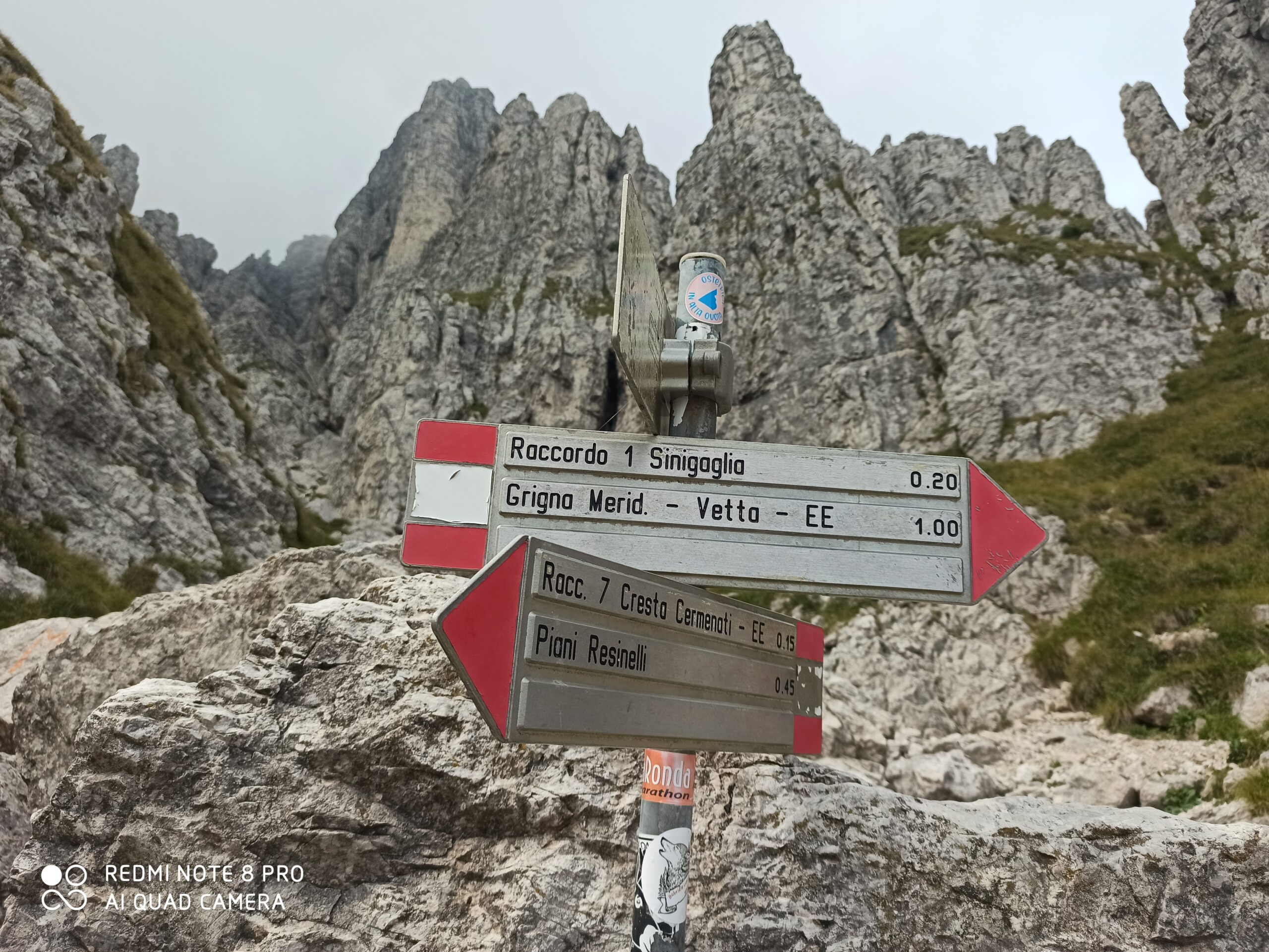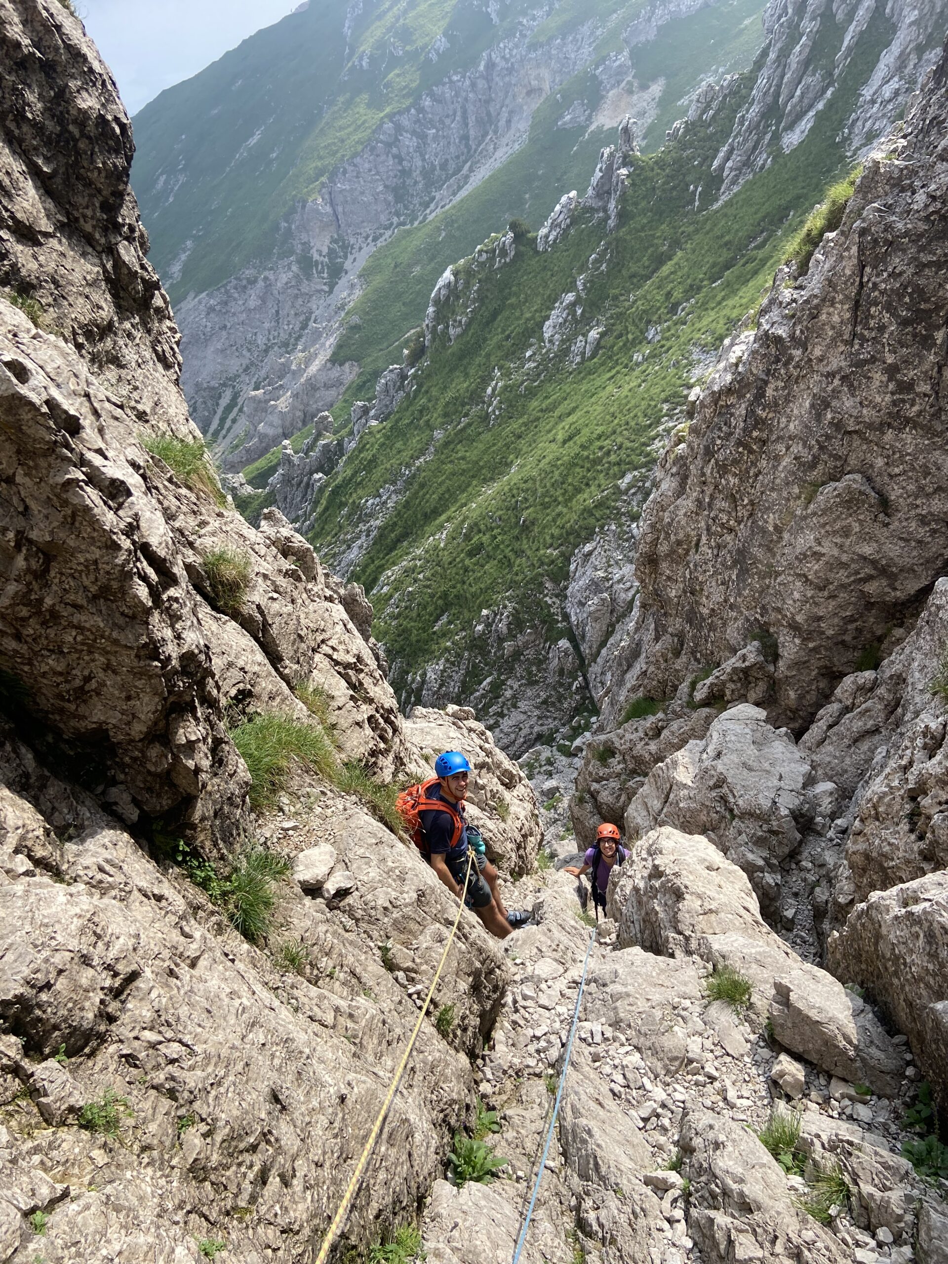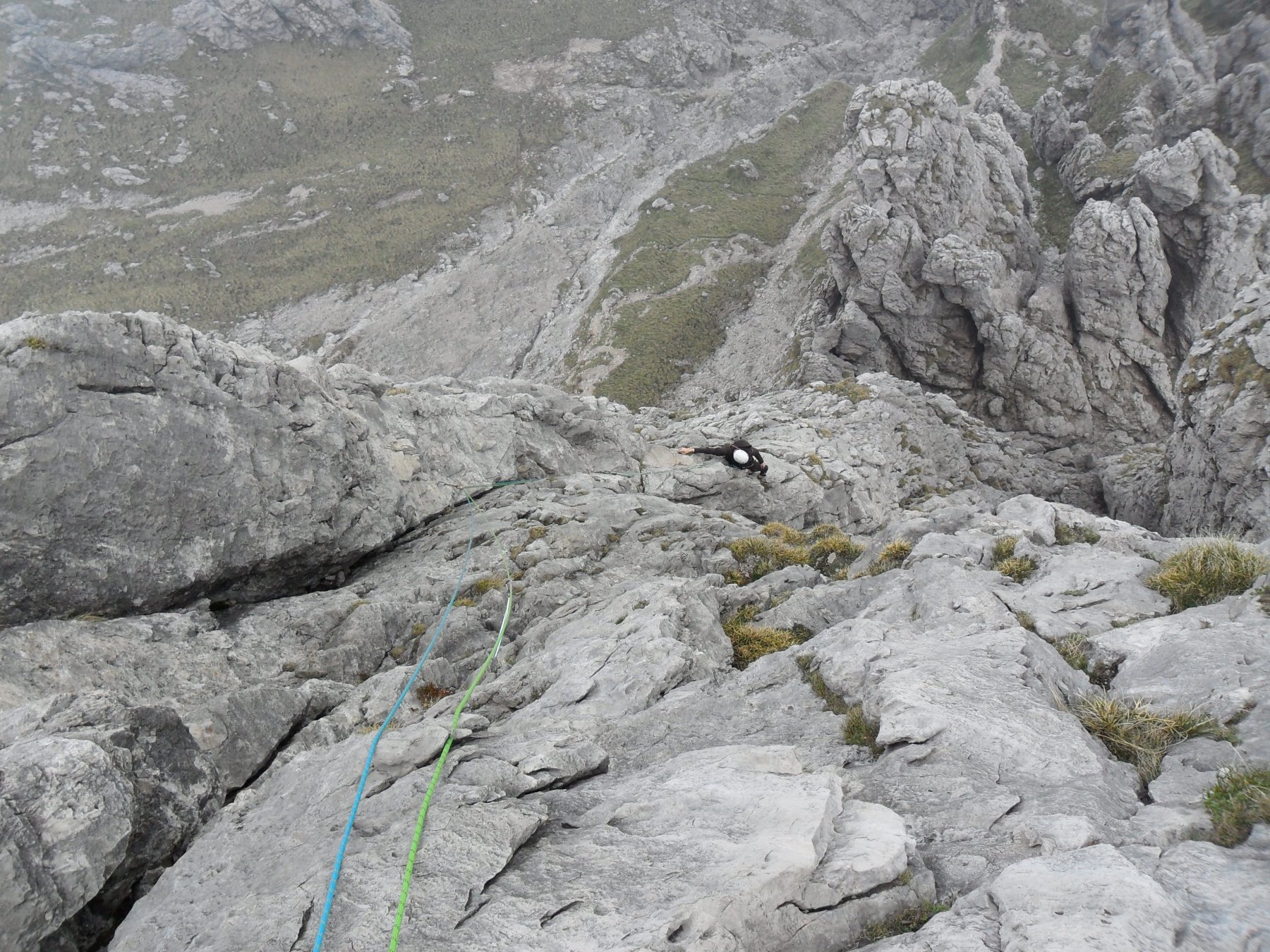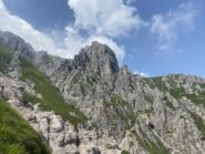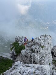 - L5:dalla sosta si sale in verticale nell’evidente spaccatura tra due speroncini molto pronunciati, quindi si piega a destra, prima per una facile rampa di rocce rotte, quindi lungo una paretina più liscia (fix) ma molto abbattuta. Si raggiunge la cima ed il termine della via in brevissimo tempo. Su un muretto si trova la coppia di fix di sosta.