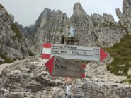 Discesa: Dal termine della via il modo più semplice per scendere è il salire fino in cima al torrione centrale e quindi scendere lungo la facile ‘ferrata’: dalla cima si prosegue in cresta, prima si scende in un intaglio, si risale il risalto successivo, si prosegue per rocce elementari e tracce di sentiero fino alla cima del torrione meridionale; quindi si scende verso est fino ad un grosso anello di assicurazione, si attraversa lungo il tiro del ‘traversino’ e si continua sempre in cresta fino in cima al torrione centrale, la si attraversa, si scende in arrampicata per il canalino indicato da una grossa freccia rossa e quindi si seguono le catene che conducono fino all’intaglio con il torrione settentrionale (forcella Glasg). Si scende quindi per roccette facili e sentiero costeggiando a sinistra le pareti est dei torrioni, oppure, consigliabile, si percorre una della vie che dalla forcella Glasg portano in cima al TMS: via Lecco o Bartesaghi.