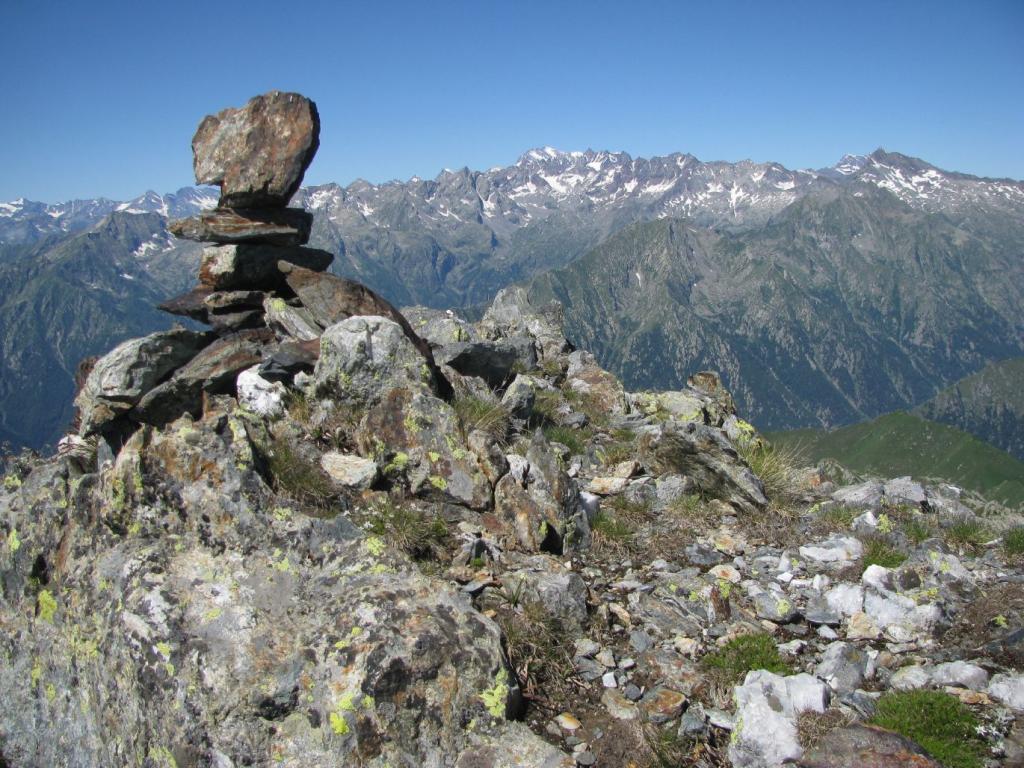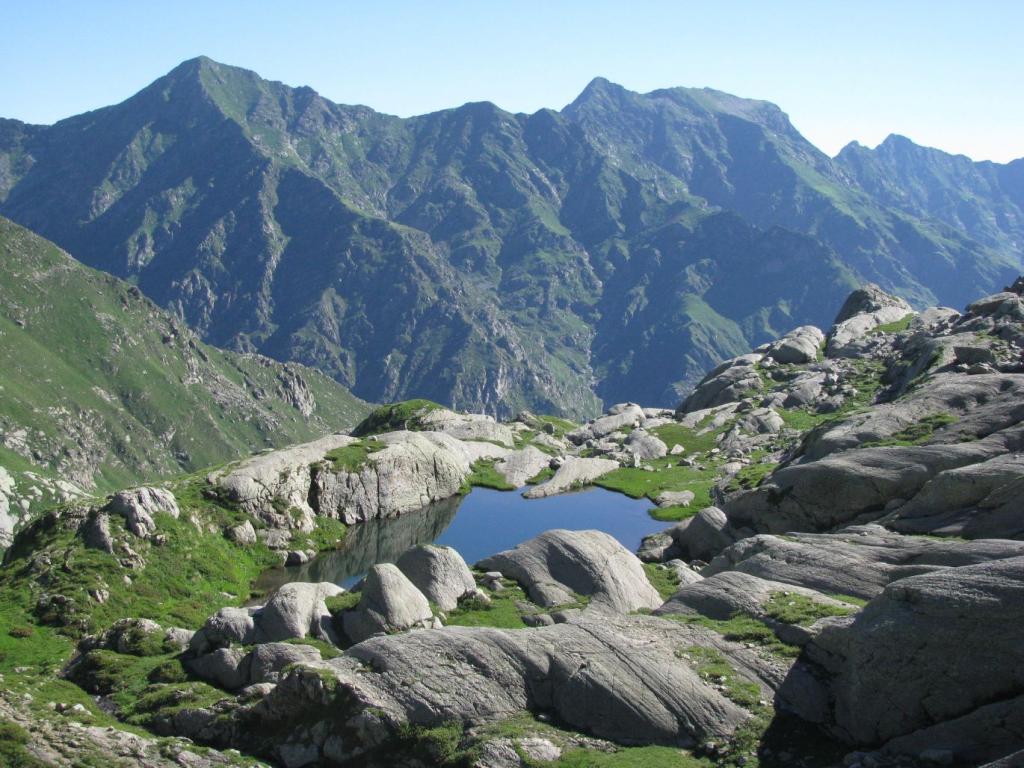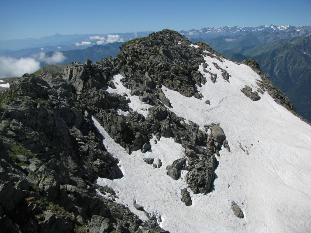 Da Fondo, seguendo il sentiero GTA, raggiungere Tallorno. A sinistra attraversare il ponte e l’abitato incontrando la sterrata da percorrere per un tratto fino a trovare il sentiero segnato n. 12 sulla sinistra. Seguire il sentiero che sale nel bosco, supera il rio principale e continua a salire superando diverse baite e dopo aver riattraversato il rio giunge alla conca paludosa del lago Creus. Seguire per un tratto il sentiero nel piano poi svoltare a sinistra attraversare il torrente e risalire varie gibbosità di rocce montonate sino ad arrivare al lago Sucal. Seguire sempre il sentiero che risale ora lungo il torrente, poi con un paio di giravolte raggiunge l’Alpe Prà. Proseguire dietro l’alpe, in direzione sud-ovest, giunti ad una seconda baita si scende leggermente in una bella conca erbosa e dopo un piccolo rio, bivio con scritta FURCE, lasciare il sentiero in discesa, quota 2300 circa, seguire ora il sentiero dapprima pianeggiante poi sale a contornare il contrafforte roccioso e giunge ai ruderi della baita Prà di Garella. Risalire ora in vista del colle, con un traverso ascensionale su pendio erboso, poi si supera una piccola pietraia, ci si alza su un nuovo pendio per lo più erboso e si giunge alla conca posta alla base del Colle Orientale di Pian Tallono; risalire ora sul lato destro il pendio erboso che risale fra due salti rocciosi, piegare a sinistra sopra il salto e poco dopo piegando a destra si sale alla visibile massima depressione del Colle del Prà, m. 2678. Dal colle, davanti al primo spuntone roccioso, si taglia in piano su ripido pendio erboso, versante Chiusella, e si giunge ad un canalino erboso, lo si risale fin quasi alla sommità poi si devia nuovamente a destra e su evidente traccia di animali, si giunge ad un secondo canalino parallelo al primo, che risalito giunge ad una finestra esposta che da sul lago Goiassa. Ora occorre salire sul filo di cresta perlopiù rocciosa, facile ma molto esile ed esposta di circa una decina di metri, segue un tratto più facile su erba e si giunge ad un primo intaglio che si raggiunge abbassandoci sul versante Chiusella su roccette; dall’intaglio sul lato opposto ci si alza con facile ma esposta arrampicata, un tratto di qualche metro, raggiunta la sommità del cucuzzolo, di quota 2804, si riscende su rocce facili al secondo intaglio e con un facile traverso su pendio di erba olina, lungo una cengia orizzontale, si raggiunge la cresta spartiacque un po’ a monte della vetta; da questo punto si inverte senso di marcia, si muove su facile cresta e si raggiunge l’ometto di vetta, m. 2818. In discesa, consiglierei di raggiungere la vicina vetta del Monfandì e scendere lungo la sua via di salita, andando ad intercettare il sentiero n° 8 e per fare il giro più largo ed interessante, andare al Lago Liamau, quindi alla Bocchetta dei Buré, Alpe Buré e Lago Creus dove si riprende il sentiero di salita.