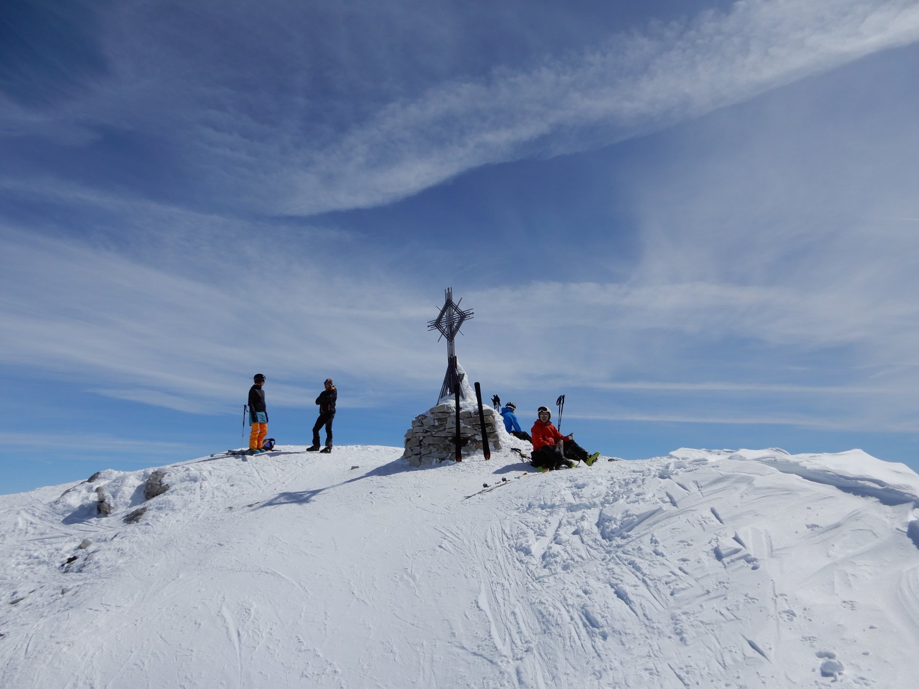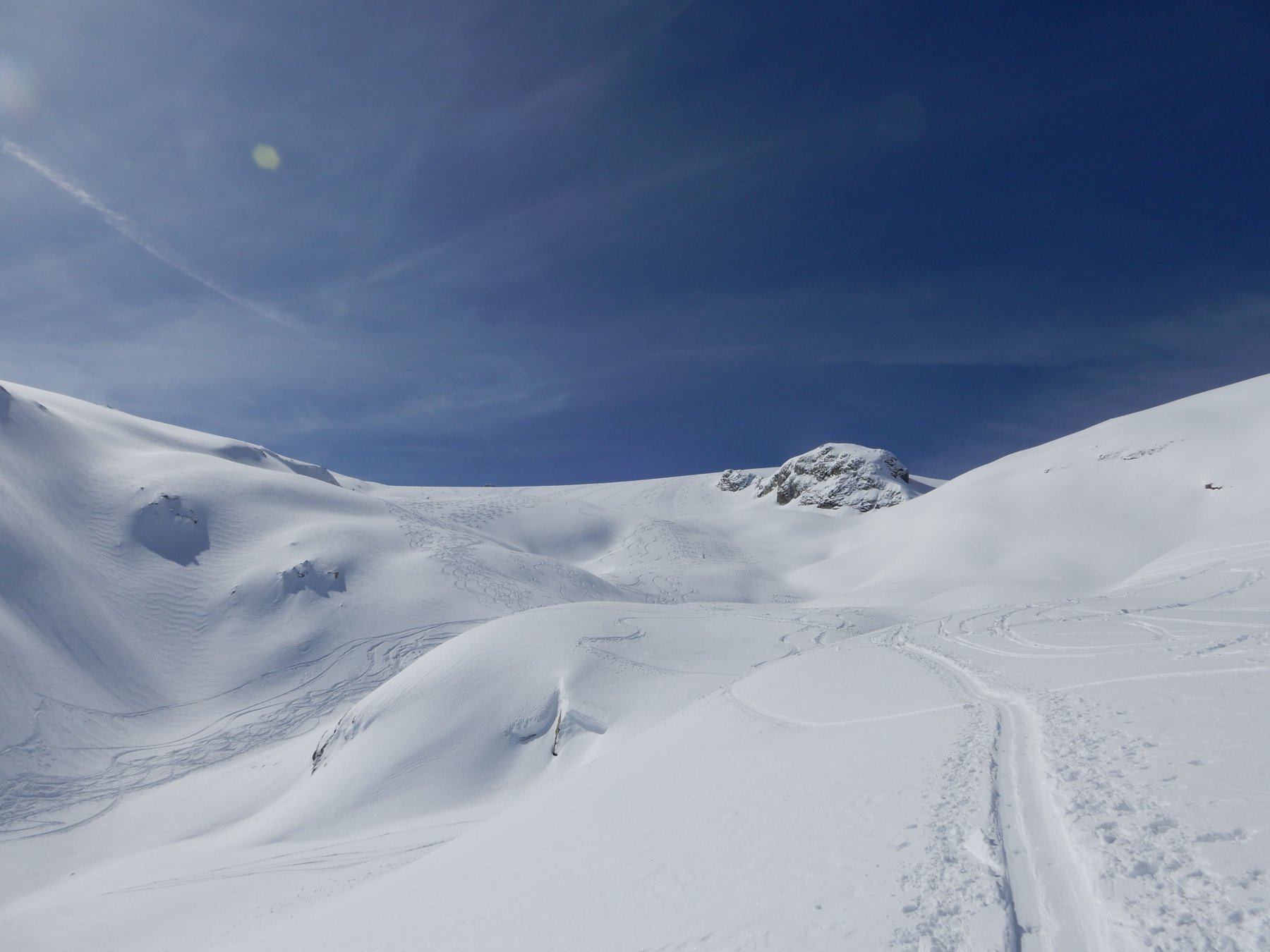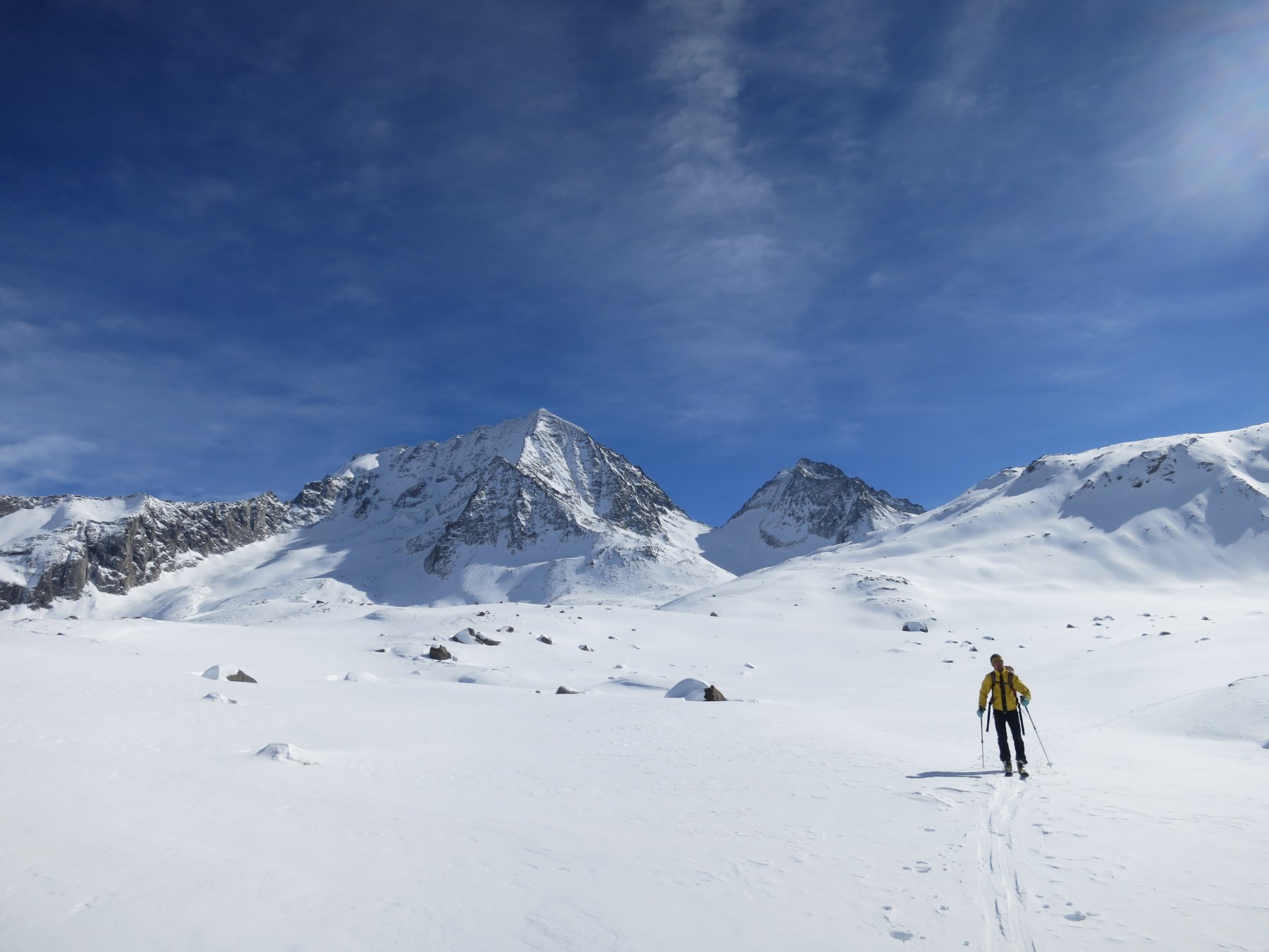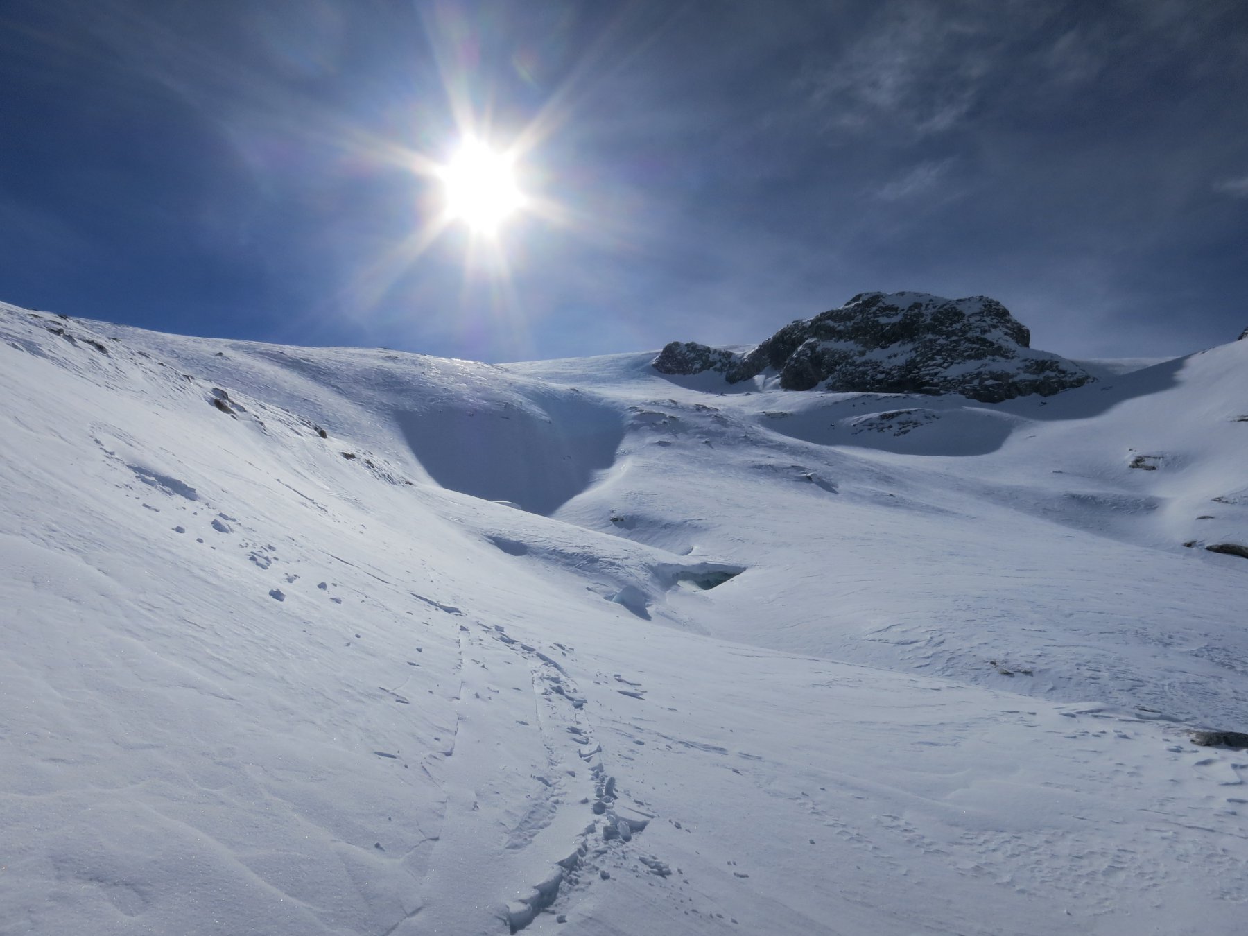 Itinerario discesa: Per la via di salita. Non farsi tentare da linee più dirette, il ghiacciaio è piuttosto crepacciato.