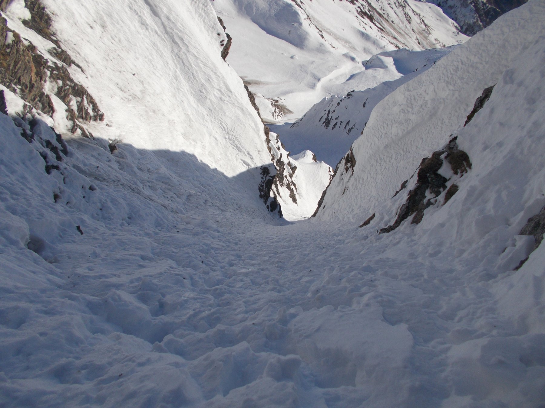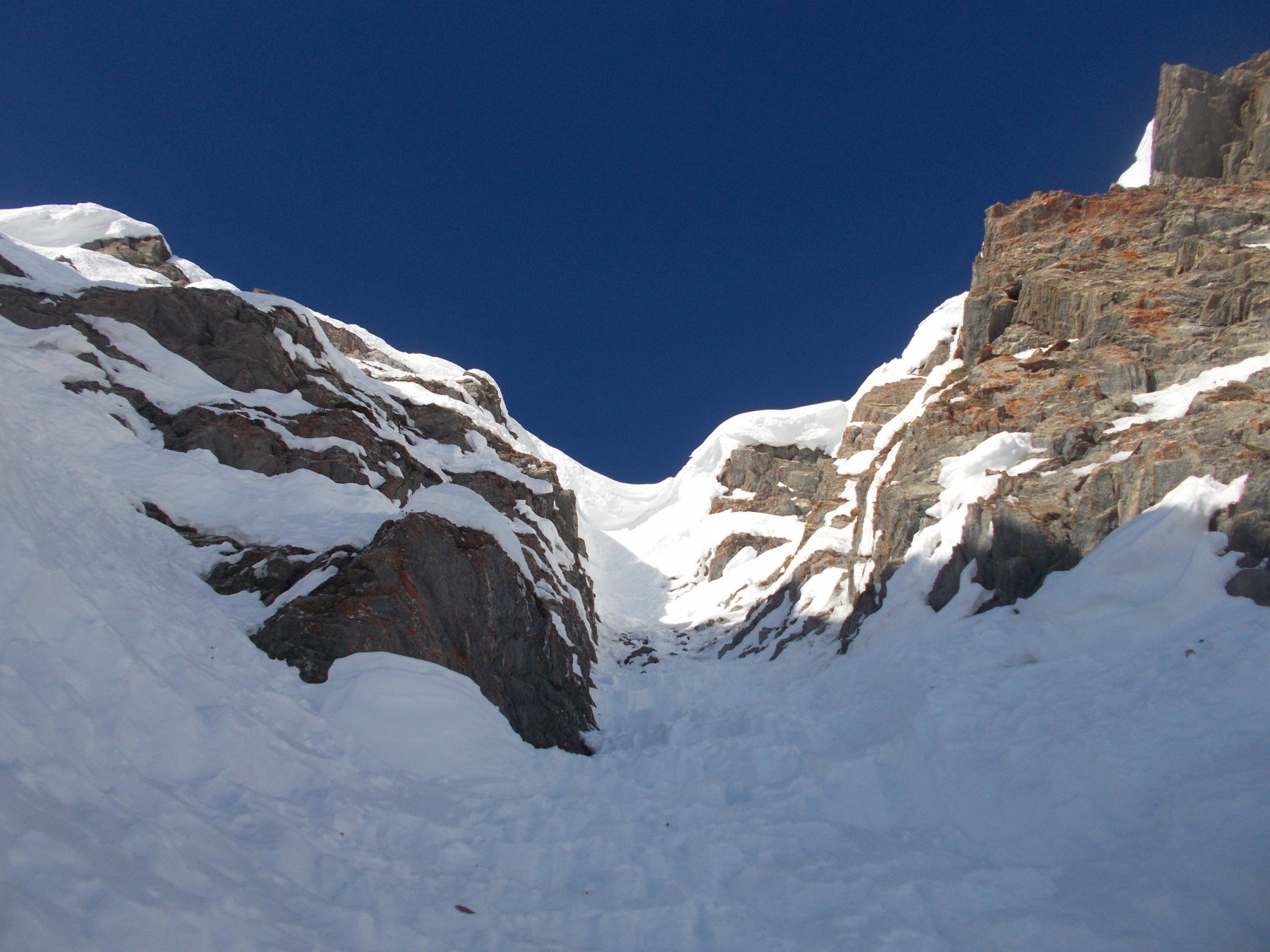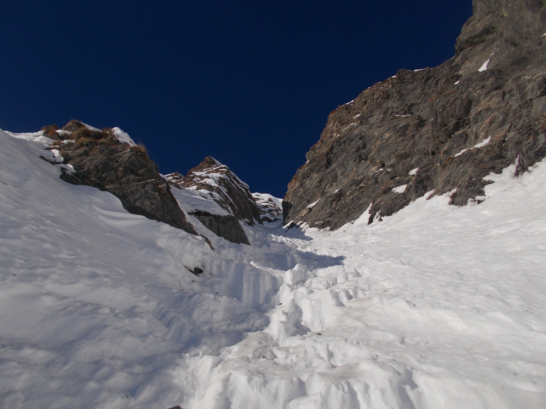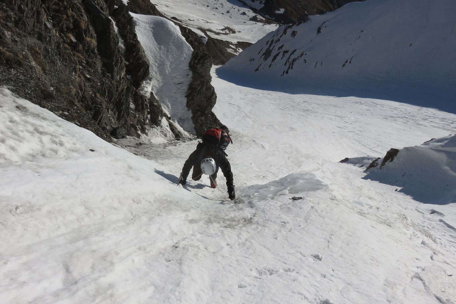 Lo si risale per circa un centinaio di metri (35/40°) quindi si imbocca sulla dx un canale secondario che si infila nella parete. Lo si risale per un centinaio di metri (45°, passaggio iniziale a 50-55° in ghiaccio possibile per pochi metri) e quando il canalino spiana leggermente si imbocca sulla dx una rampa di neve, detriti e roccia friabile (delicato, esposto) che permette di immettersi nel canalino finale vero e proprio, stretto pochi metri e lineare. Lo si risale completamente (50-55°) in alto è possibile trovare ghiaccio (brevi passi a 60°) e soprattutto una cornice incombente proprio verso il canale che obbliga a romperla oppure a passare a fianco su neve ripidissima o roccette friabili verticali e poco proteggibili (delicato, III).