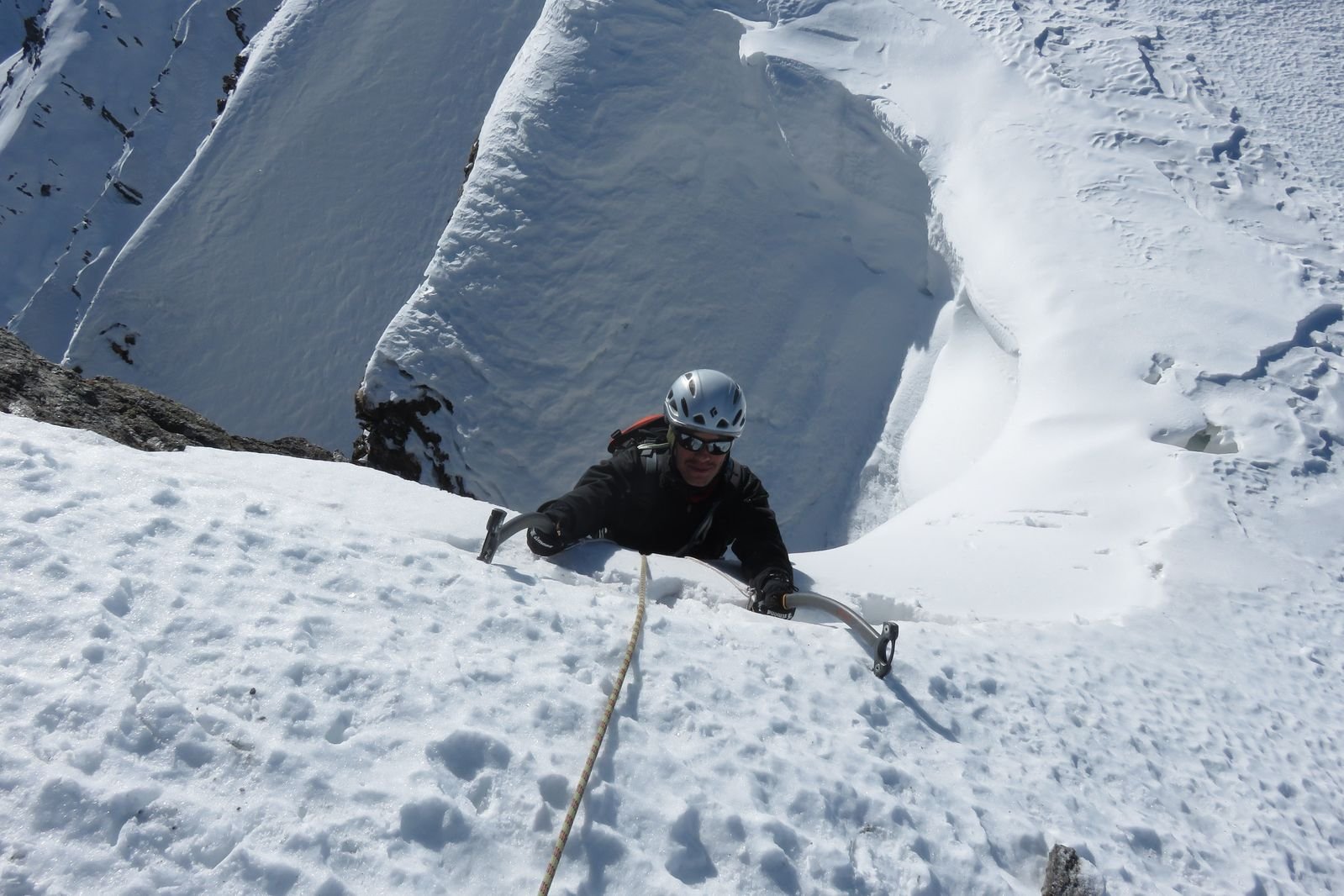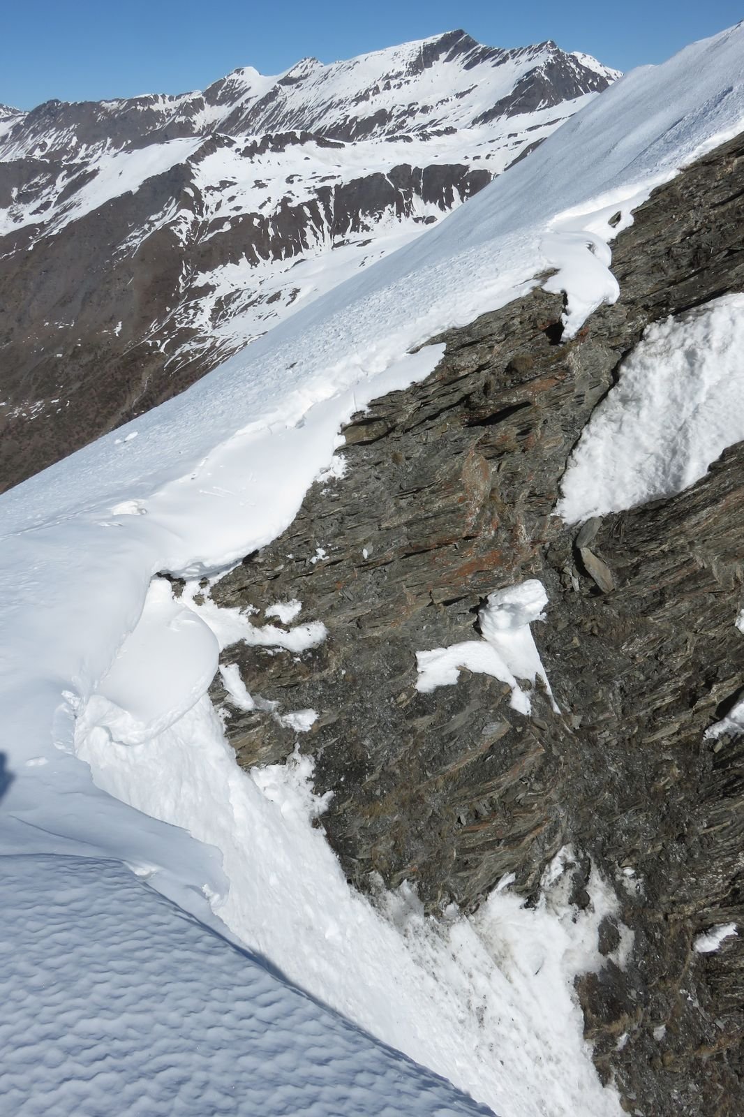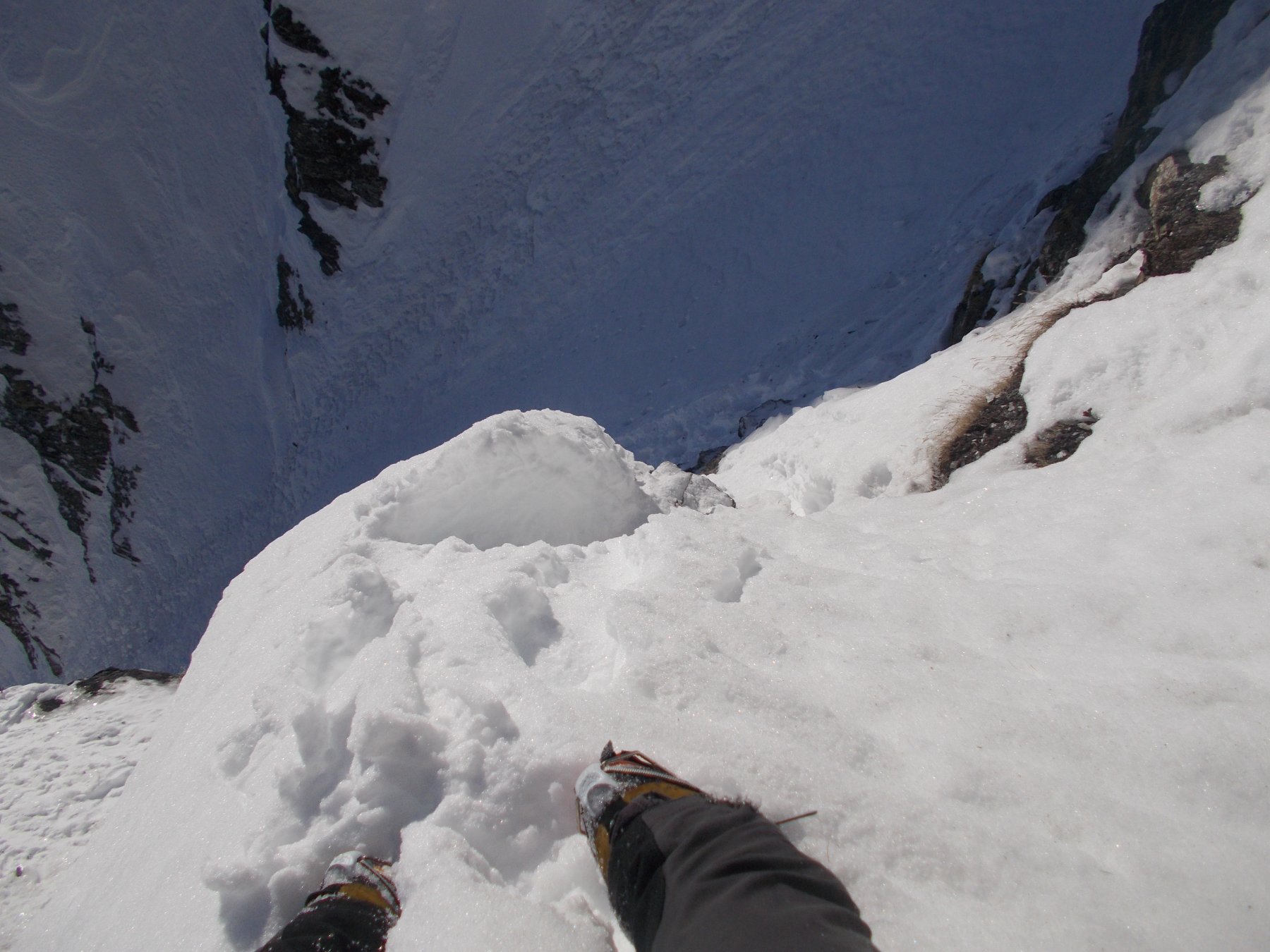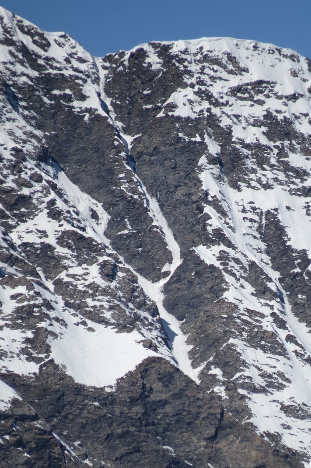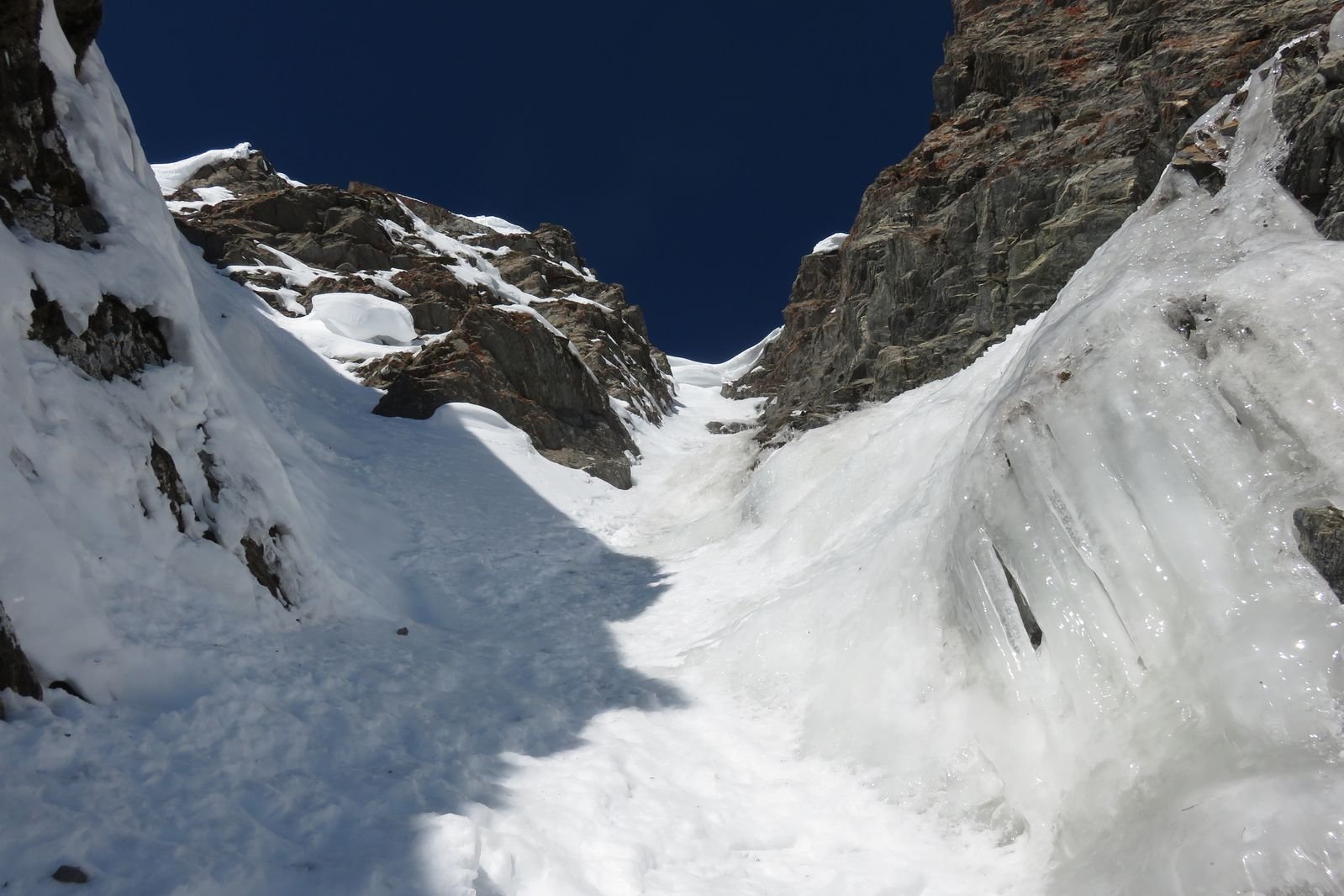 Lo si risale per circa un centinaio di metri (35/40°) quindi si imbocca sulla dx un canale secondario che si infila nella parete. Lo si risale per un centinaio di metri (45°, passaggio iniziale a 50-55° in ghiaccio possibile per pochi metri) e quando il canalino spiana leggermente si imbocca sulla dx una rampa di neve, detriti e roccia friabile (delicato, esposto) che permette di immettersi nel canalino finale vero e proprio, stretto pochi metri e lineare. Lo si risale completamente (50-55°) in alto è possibile trovare ghiaccio (brevi passi a 60°) e soprattutto una cornice incombente proprio verso il canale che obbliga a romperla oppure a passare a fianco su neve ripidissima o roccette friabili verticali e poco proteggibili (delicato, III).