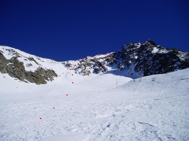 Risalire la strada per il colle della Lombarda in auto sino dove possibile. Dal Baraccone si risale il vallone della Maladecia sino a incontrare sulla destra un evidente conoide che porta verso l’attacco del canale. Si deve superare una balza rocciosa spesso a piedi o se si è fortunati su neve, a dx salendo, tra arbusti e roccette. Alternativa: si sale centralmente superando brevi risalti di misto-ghiaccio. Usciti dal canale si prosegue a destra per circa 70m sino alla croce di vetta.