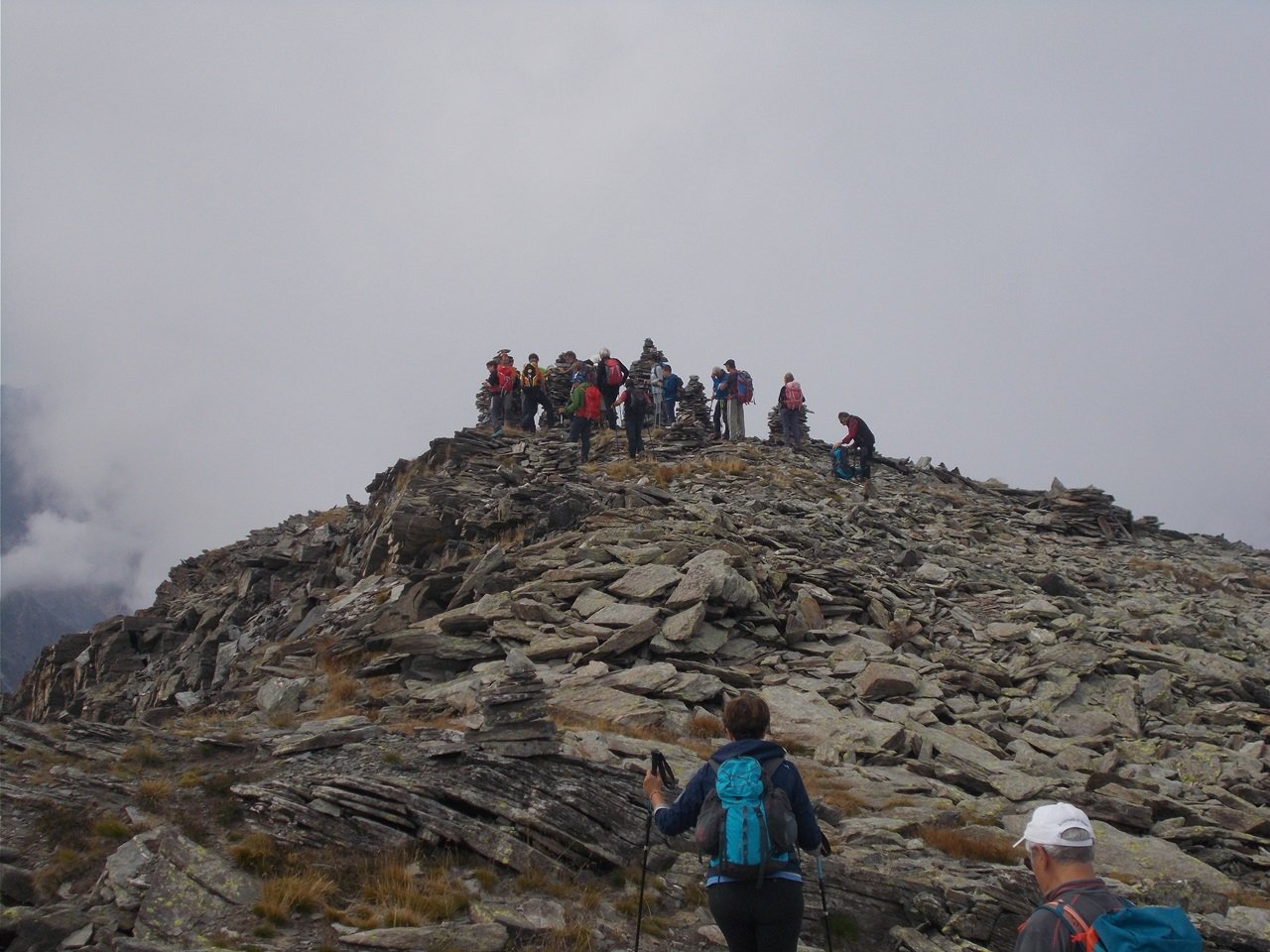 Gita sociale del Cai Mondovì ,a cui si sono aggiunti anche un gruppo del Cai di Susa.Un continuo ‘alternarsi di nebbia e schiarite ha penalizzato un po il panorama ,ma tuttavia la gita è stata portata a termine con successo dagli oltre 40 partecipanti,con tanto di rinfresco in cima a base di pasticcini ,torta e vino .Oggi pochi escursionisti in zona ,e qualche bikers.