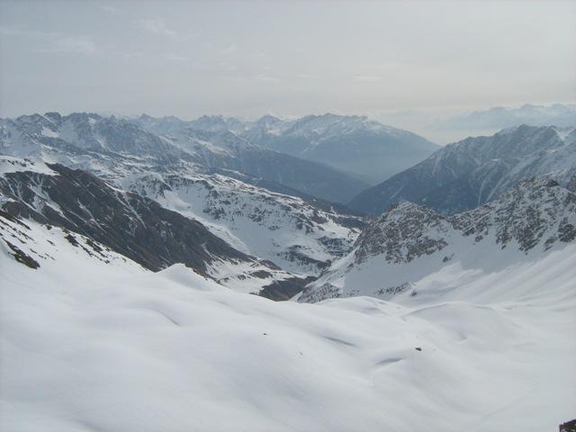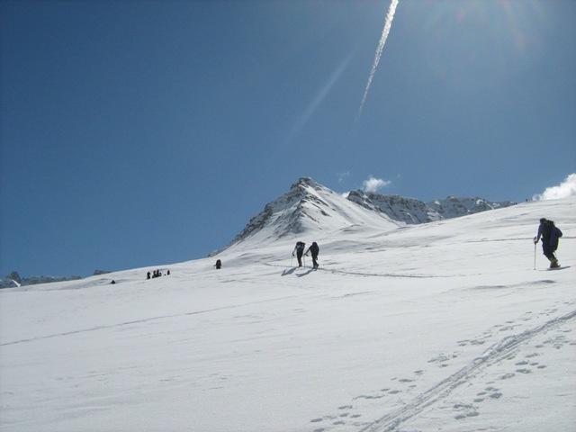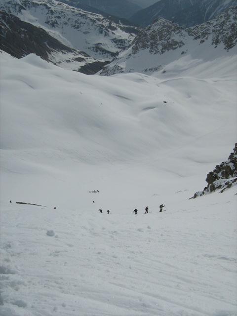 Domenica partenza alle 6.50 dal rifugio, sia per anticipare la perturbazione, sia per trovare neve bella in discesa. Salita senza grossi problemi fino al Colle, dove siamo arrivati un po’ sgranati in poco più di 3 ore…il rigelo notturno è stato ottimo e sono utili i rampant nei 2-3 tratti un po’ più ripidi. Discesa iniziata verso le 10.30; i primi 100-150 metri sono abbastanza ripidi (30-35°) e la neve non aveva ancora mollato molto, quindi occorreva un po’ di attenzione anche se il grip è comunque buono e il pendio è un biliardo…bellissimo, anche se forse avessimo aspettato ancora mezz’ora sarebbe stato perfetto!! Poi da lì in giù grande sciata su pendenze mai eccessive e neve che aveva mollato al punto giusto. Nei tratti meno toccati dal sole si trova ancora un po’ di crosta, ma per il resto neve cotta al punto giusto fino quasi in fondo. Solo dai 2000 in giù ogni tanto si sfondava un po’ e in qualche tratto bisogna fare attenzione alle pietre affioranti. Cmq si arriva ancora senza problemi con gli sci ai piedi fino al parcheggio di Crevacol!!!