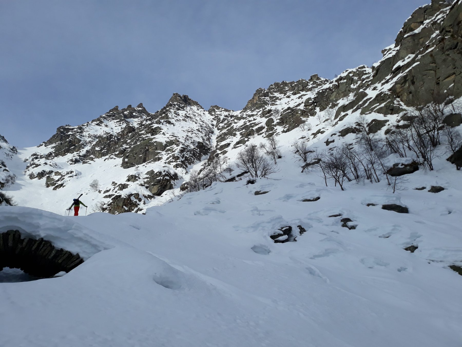 Qui il canale diviene più largo e generalemnte ben innevato con pendenza che a partire dal solitario Gias Mombran 1818 m, va via via accentuandosi.