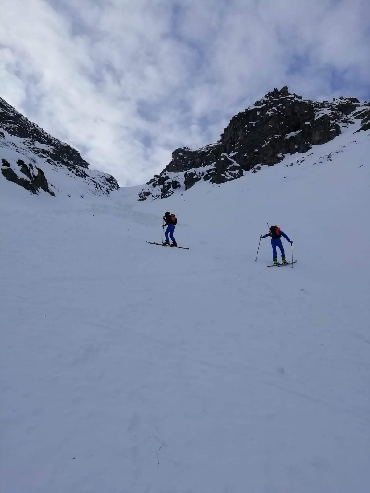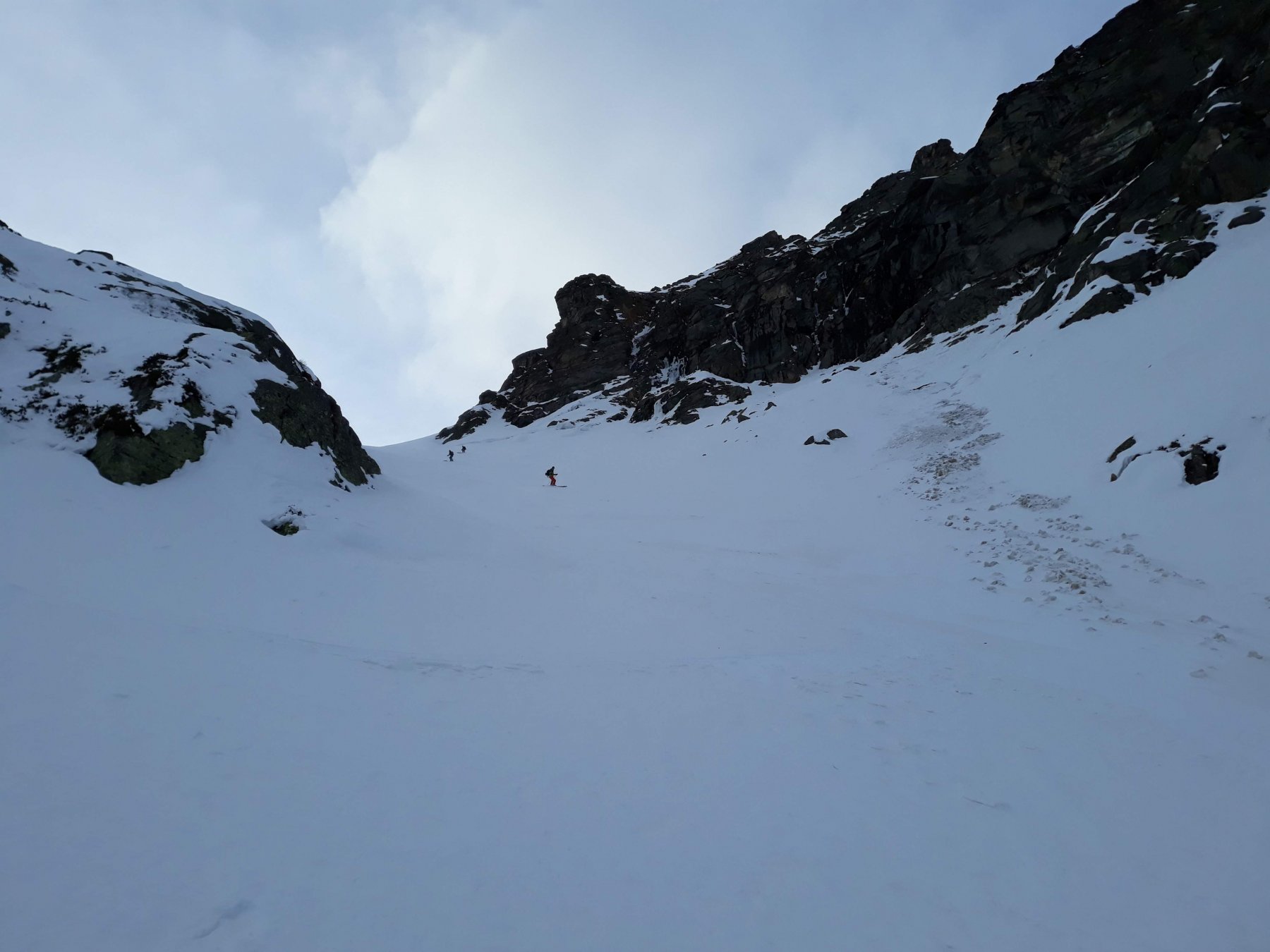 Discesa: tenersi generalmente nella contropendenza di destra, con ripidi tratti fino a 45° e qualche passaggio tra salti rocciosi specie quando s’imbocca il secondo colletto. Attenzione alle condizioni della neve sul lato sx idrografico del canale, dove dal Bec Cerel scendono sempre delle pericolose placche a vento.