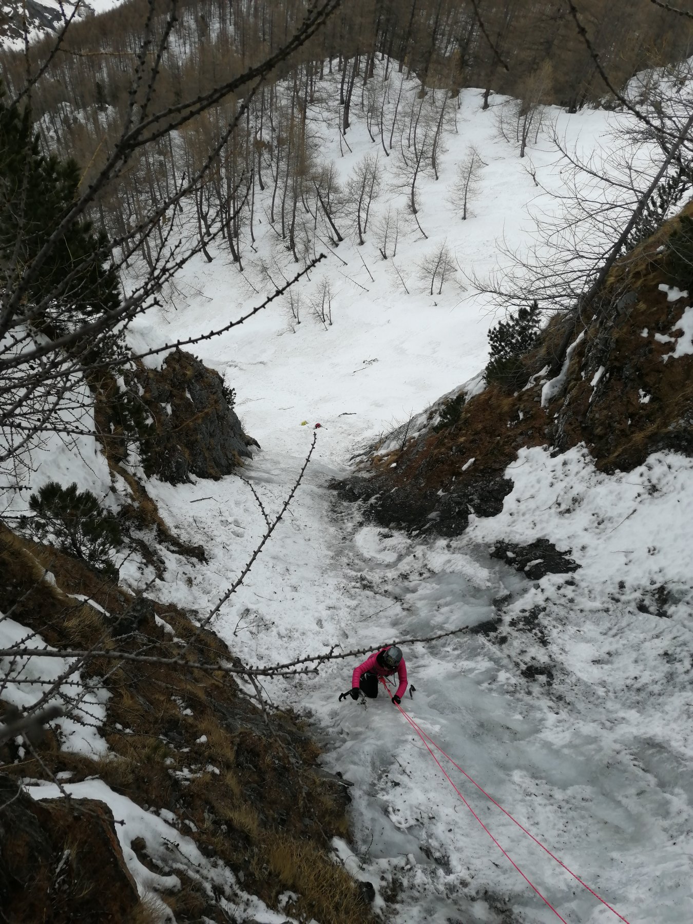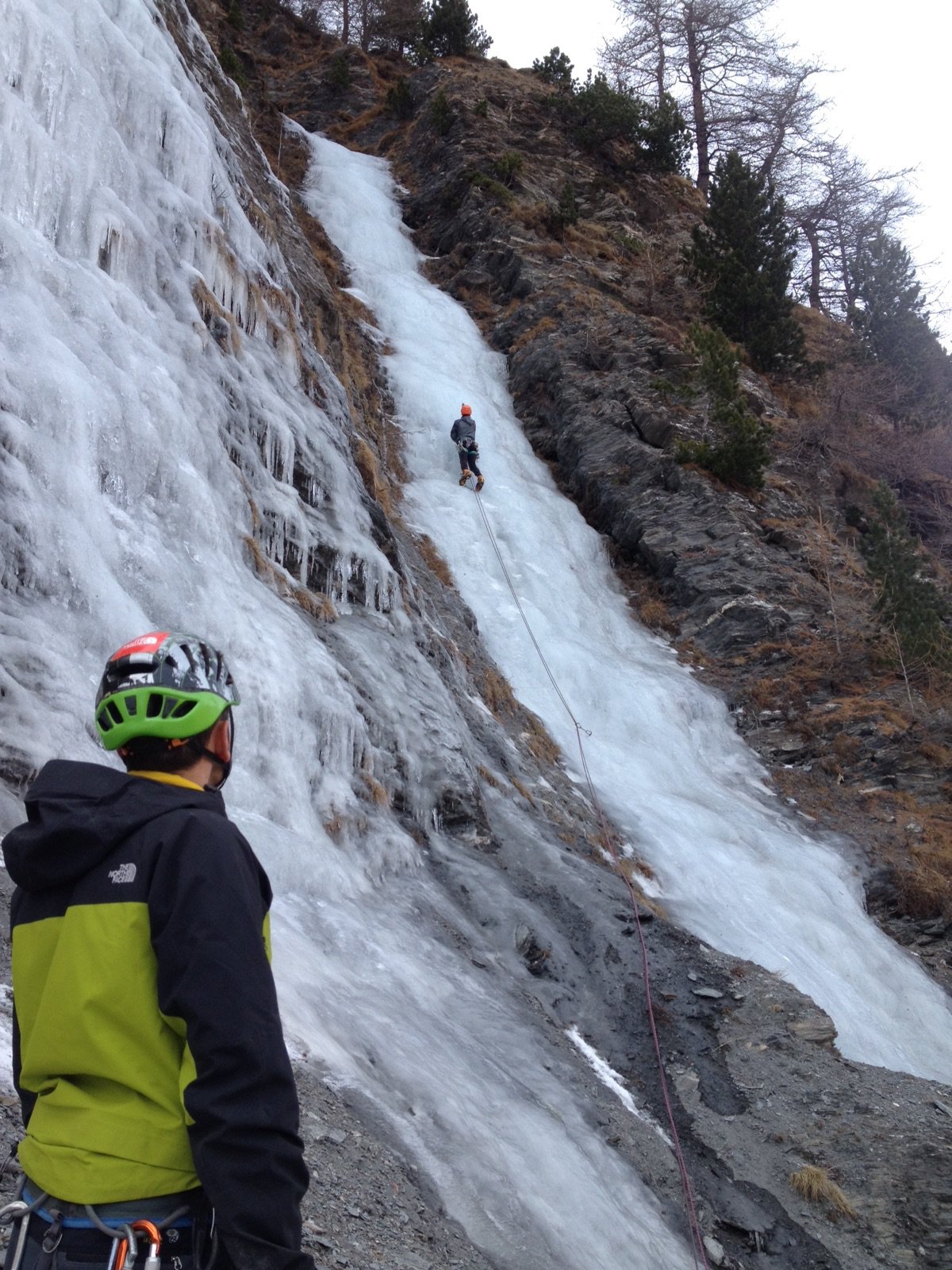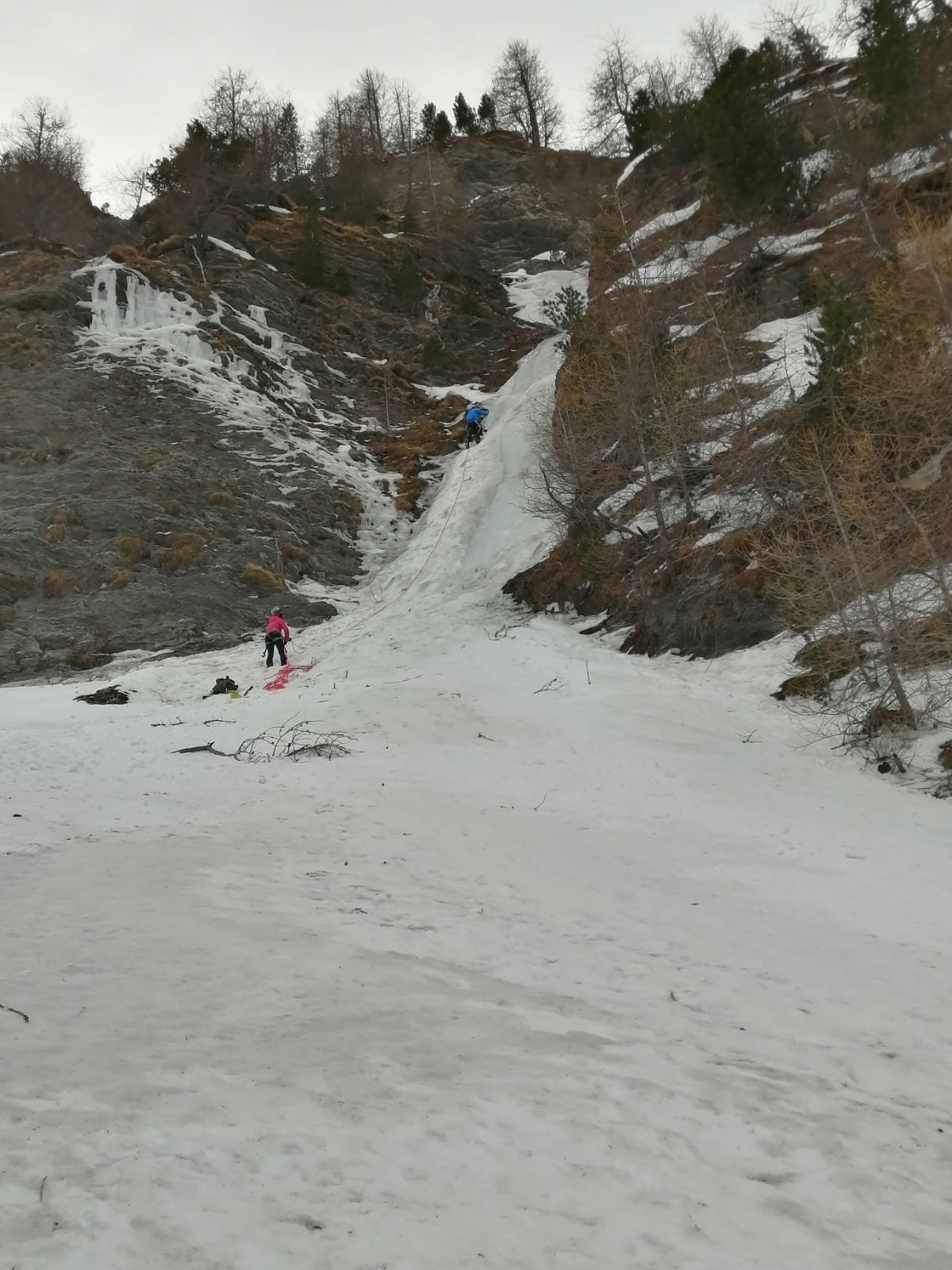 Prosit è a sinistra (60 m ghiaccio da 60° a 75° difficoltà 2), Mammuth a destra (20m ghiaccio da 60° a 80° gradi difficoltà 3).