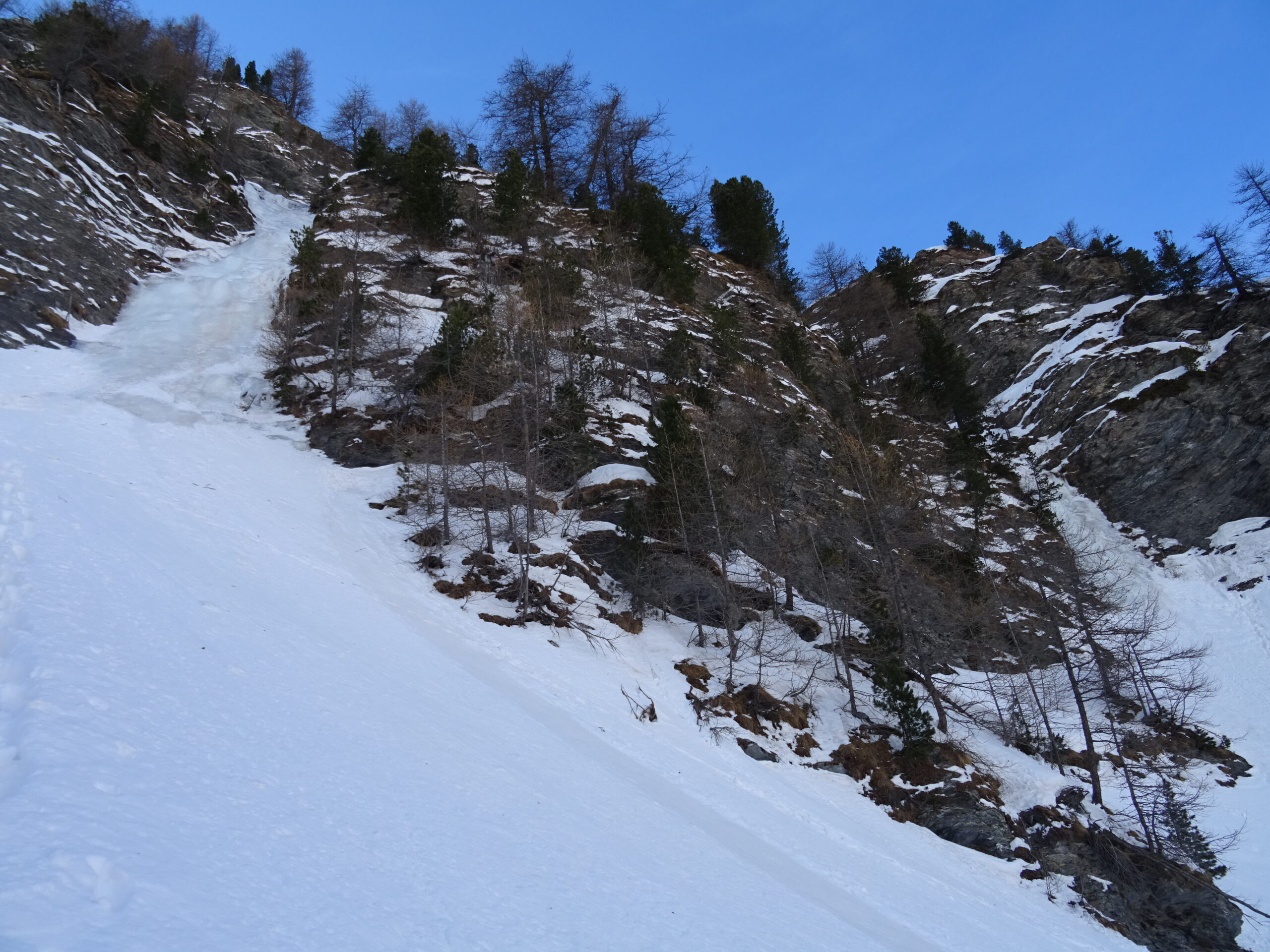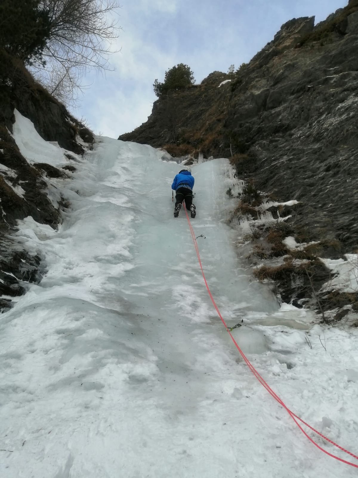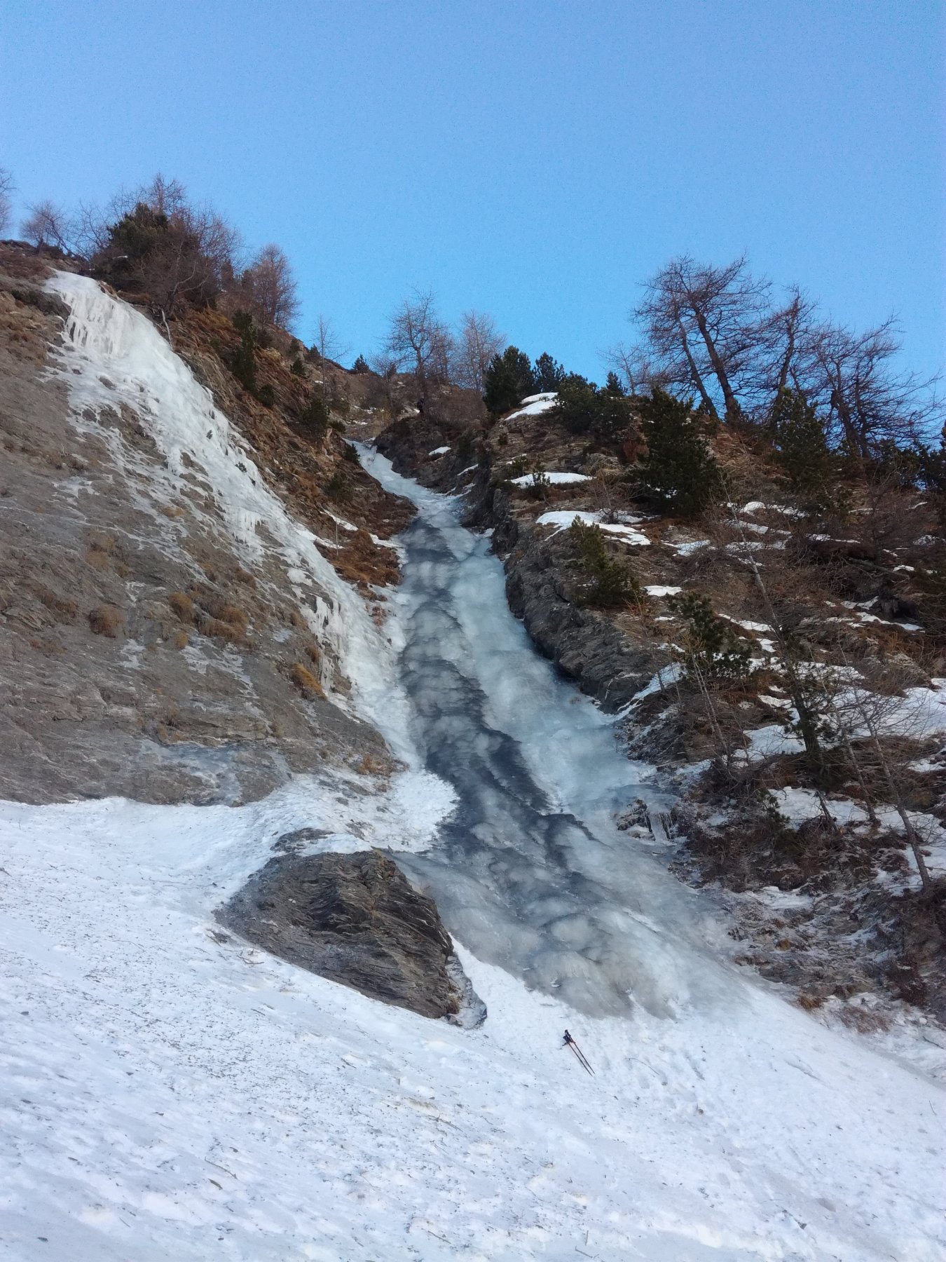 Prosit è a sinistra (60 m ghiaccio da 60° a 75° difficoltà 2), Mammuth a destra (20m ghiaccio da 60° a 80° gradi difficoltà 3).