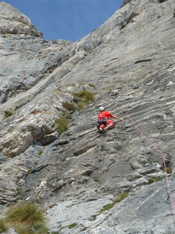 L1 : placca a scaglie, poi stupendo muro gradinato con roccia molto aderente ( 6a+, 35 m)