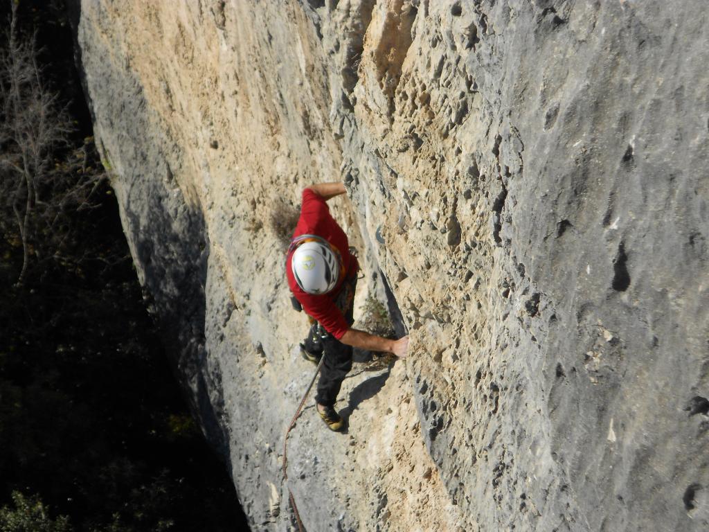 - L6) Inizia la parte alpinistica. Traversare nettamente a sx per facile lame (5a), salire un diedrino strapiombante (6b) e continiare obliquamenta a sx (6a poi 6b) fino a una sosta scomodissima con tre chiodi che conviene saltare, salire verticalmente in placca su ottima roccia a gocce (6a+) fino a prendere una fessura leggermente a sx che porta alla comoda sosta (5c). (45mt) (1cl 2fr 7ch – sosta 1spit + cl)