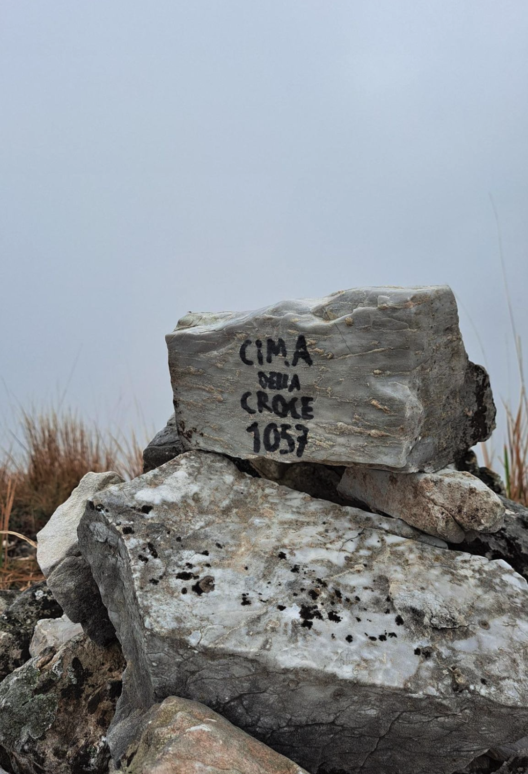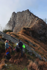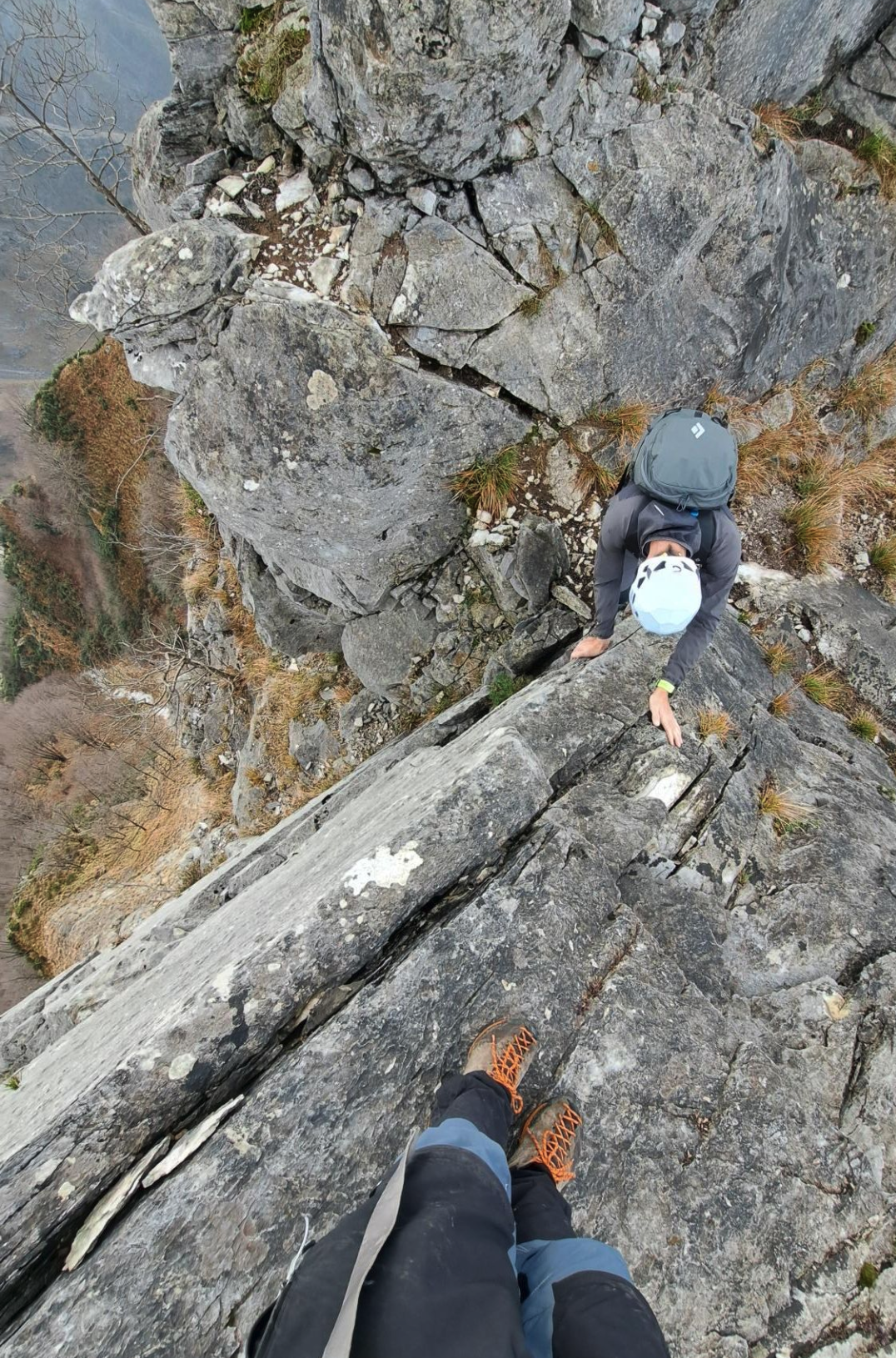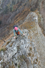 Di fronte a noi in primo piano due cime secondarie, che andremo a visitare a conclusione del giro proposto , Cima della Croce e il monte Castagnolo…la discesa sempre su cresta per raggiungere le cime appena citate, è altresì impegnativa, sempre con forte esposizione, e con passaggi da superare su roccia, massi spuntoni, mai banali…una corda posta in loco sull’ultimo speroncino offre una possibilità di discesa, altrimenti una esile cengia esposta sulla sx lo supera ugualmente…giunti al termine della cresta, la soddisfazione e l’appagamento è grande…da qui proseguiamo la nostra escursione, visitando le cime sopra citate.