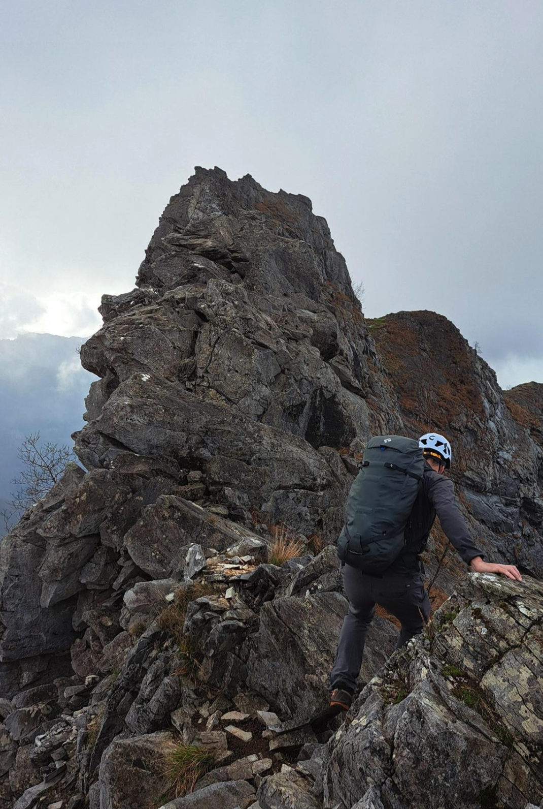 La traversata della Cresta da Est a Ovest è sicuramente il percorso più bello, mai banale, sempre molto esposto su entrambi i versanti sud e nord, offrendo una salita divertente e molto panoramica, ma altrettanto delicata. affrontiamo i primi passi sulla cresta ,tranquilli, il terreno pur di roccette e paleo si presenta facile, doveoe la cresta comincia a salire, le difficoltà aumentano via via e l’esposizione si fa sentire….l’arrampicata è piacevole pur richiedendo esperienza di terreno apuano, molto friabile e sfasciumato, alternato a passi di roccia solida…. superato uno erto sperone di roccia, si raggiunge un tratto di cresta pianeggiante, che si supera più agevolmente, fino ad arrivare al castello di rocce che formano la vetta…questa è la parte in salita che richiede più concentrazione e attenzione, in quanto la roccia è tutta marcia, sfasciumata, sembra un tratto che ha subito un crollo.. sono pochi metri di salita ma l’esposizione è forte.