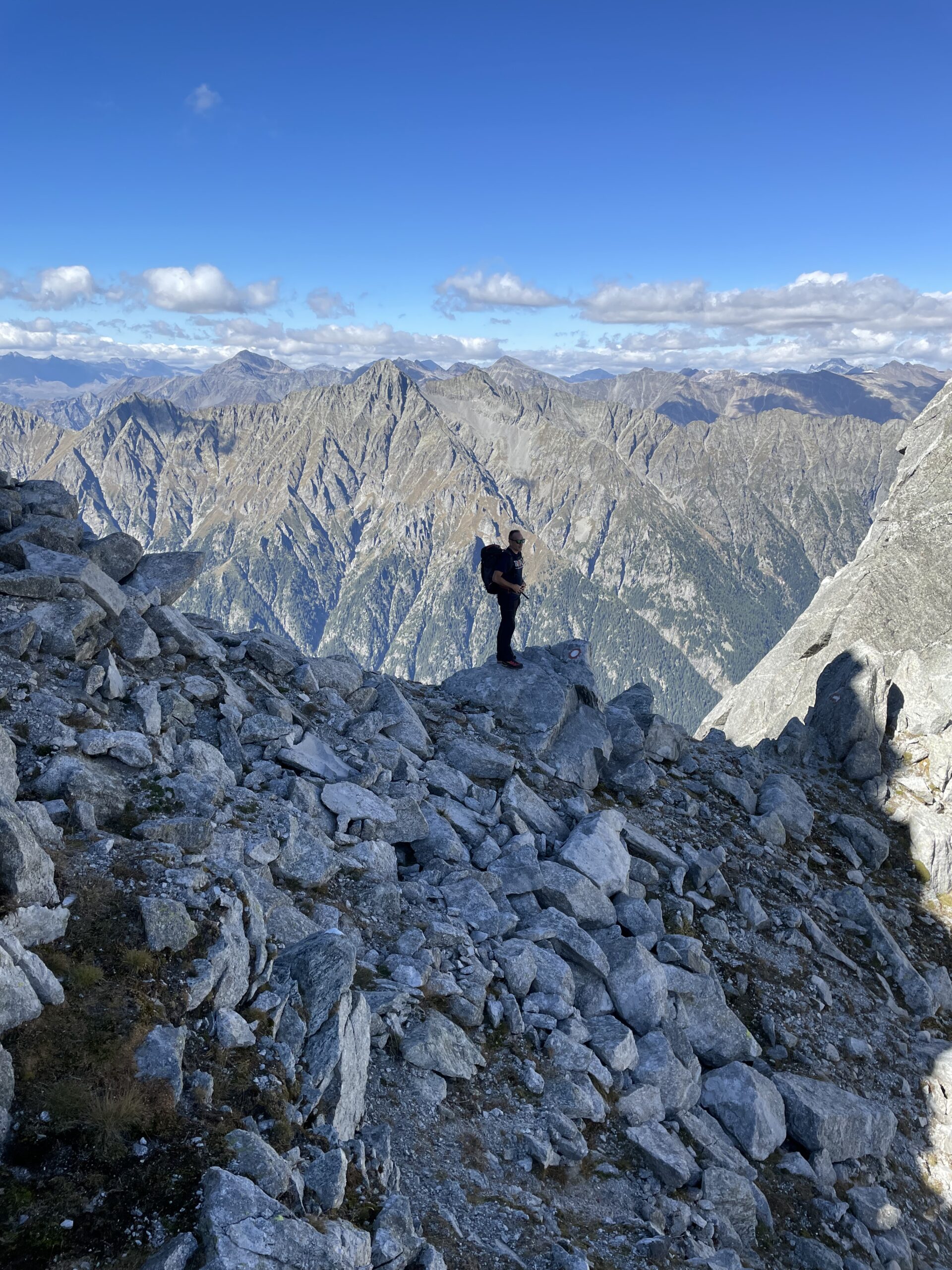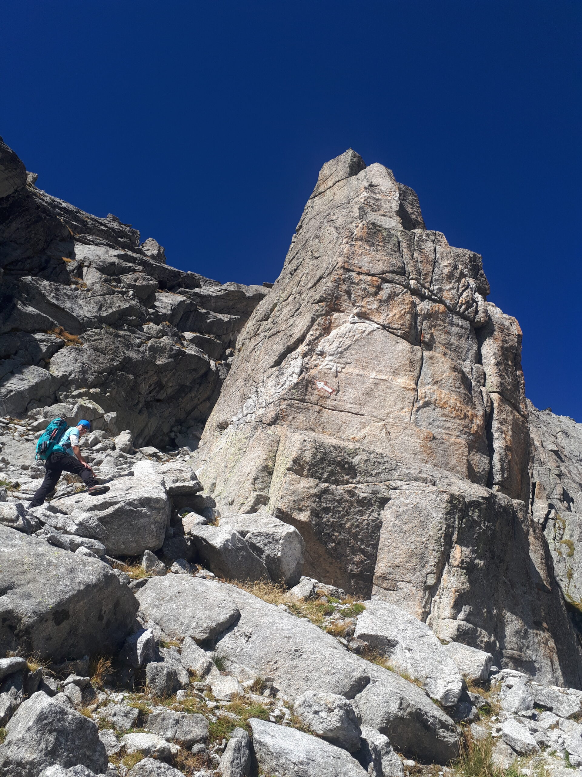 Arrivati più o meno 150/200 metri sotto la cresta si incontra una serie di ometti che dalla via normale alla cima porta verso la bocchetta. Si incontrano anche due piccoli laghetti che confermano la giusta direzione. Seguire gli ometti fedelmente verso ovest (molto facile perdersi) fino ad una zona di sfasciumi sovrastati da un canale detritico non visibile dal basso. L’ingresso del canale è segnalato da una grossa freccia posto su una roccia a destra dell’imbocco.
