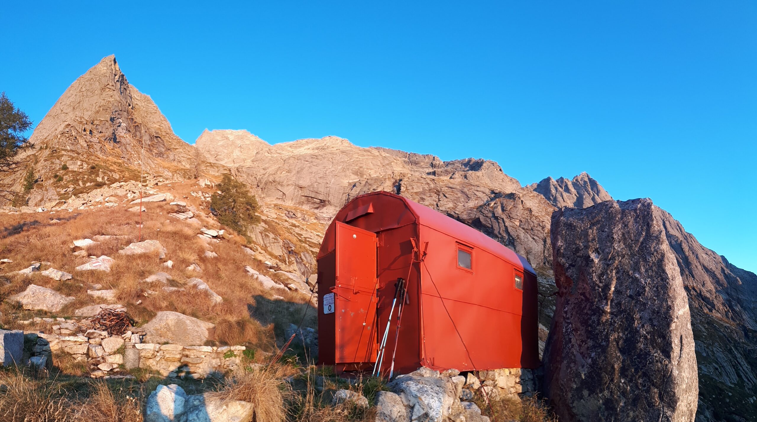 Comunque poco dopo il rosso bivacco diventa visibile. Bisogna continuare a scendere fino alla sua altezza. Qui spostarsi a sinistra fino a superare un torrente e poi risalite per una trentina di metri tra i rododendri fino a raggiungere il bivacco Casorate Sempione 2100m (6 ore dal Primalpia, 2 ore dalla bocchetta EE).