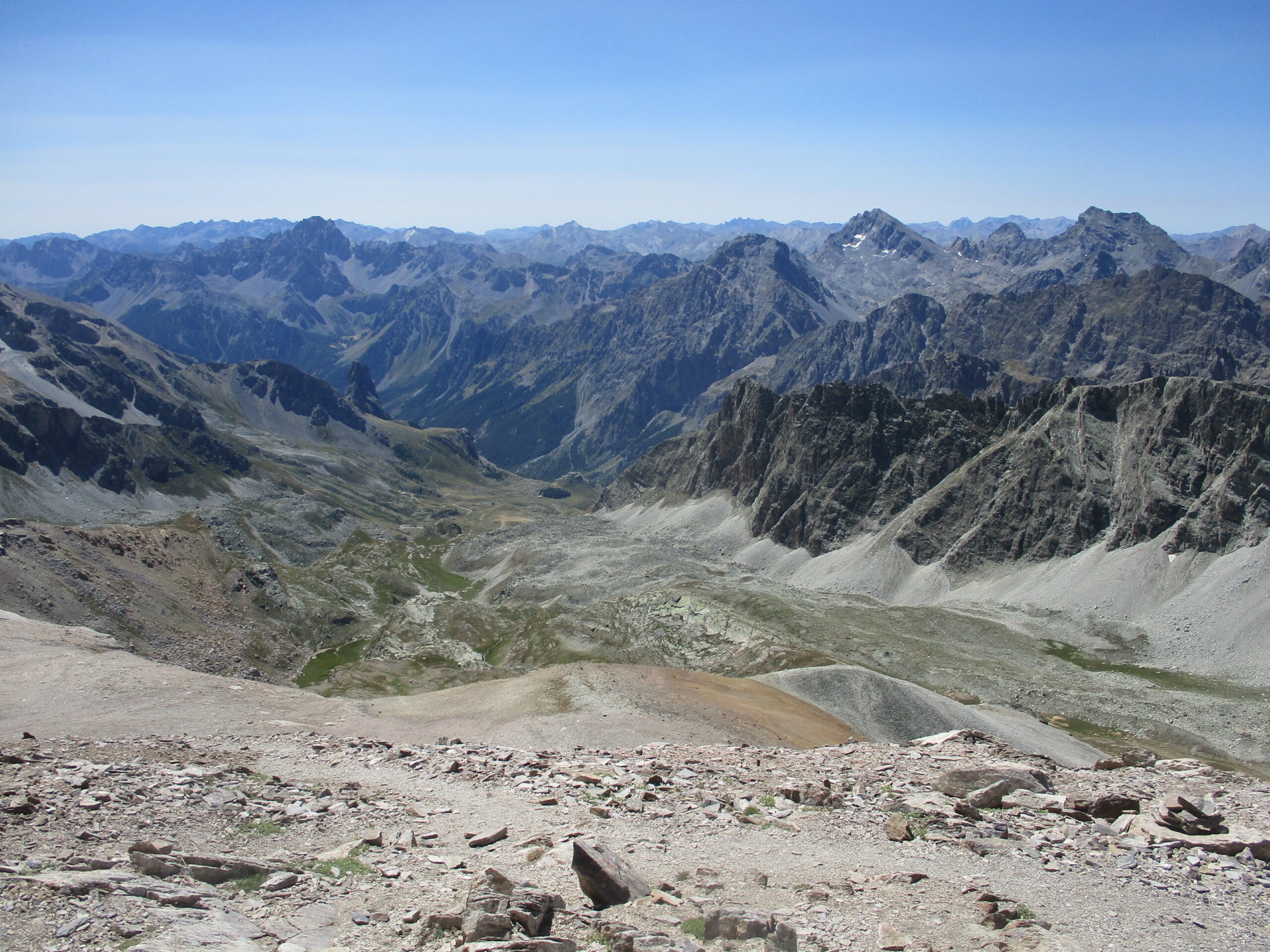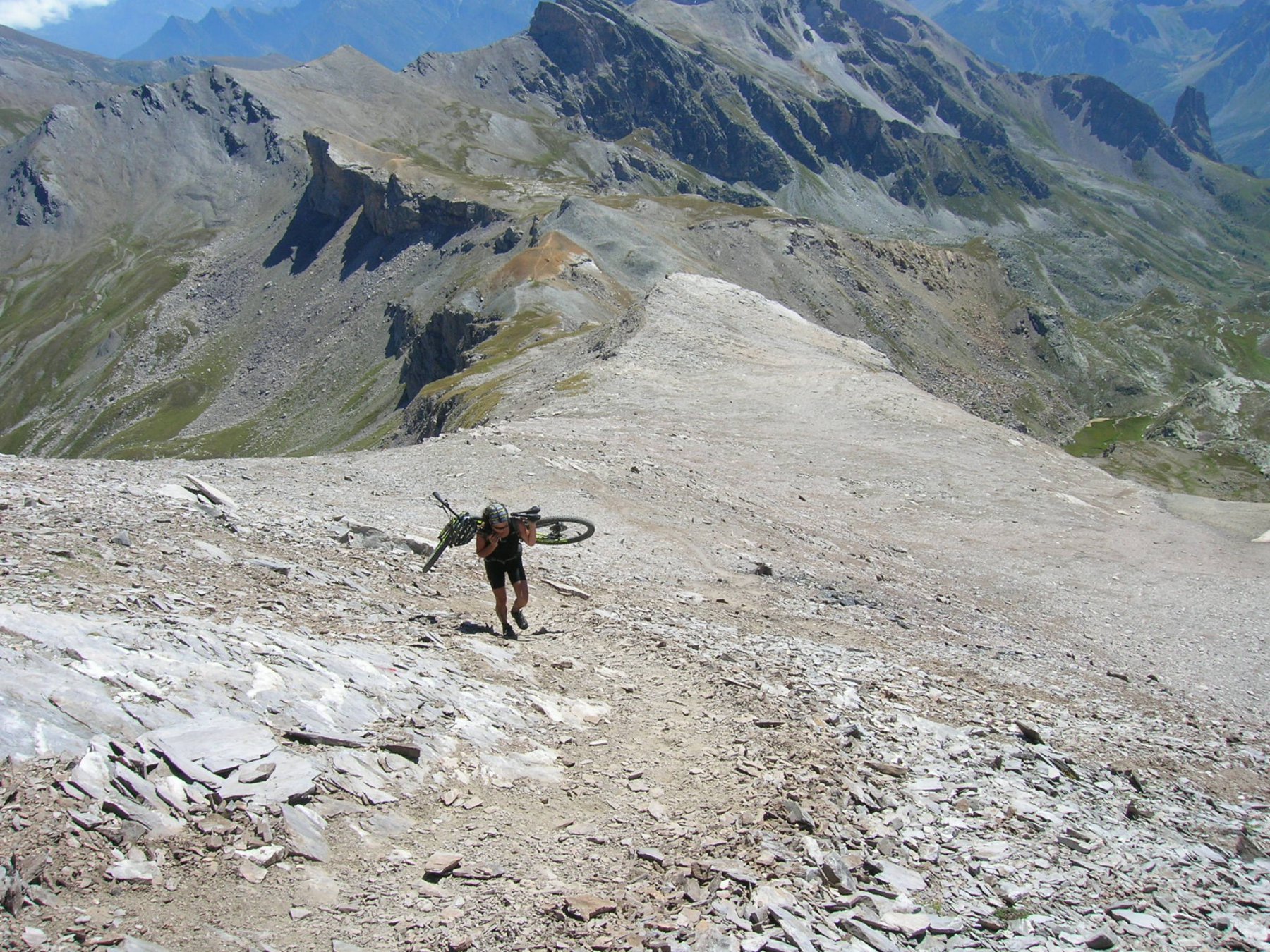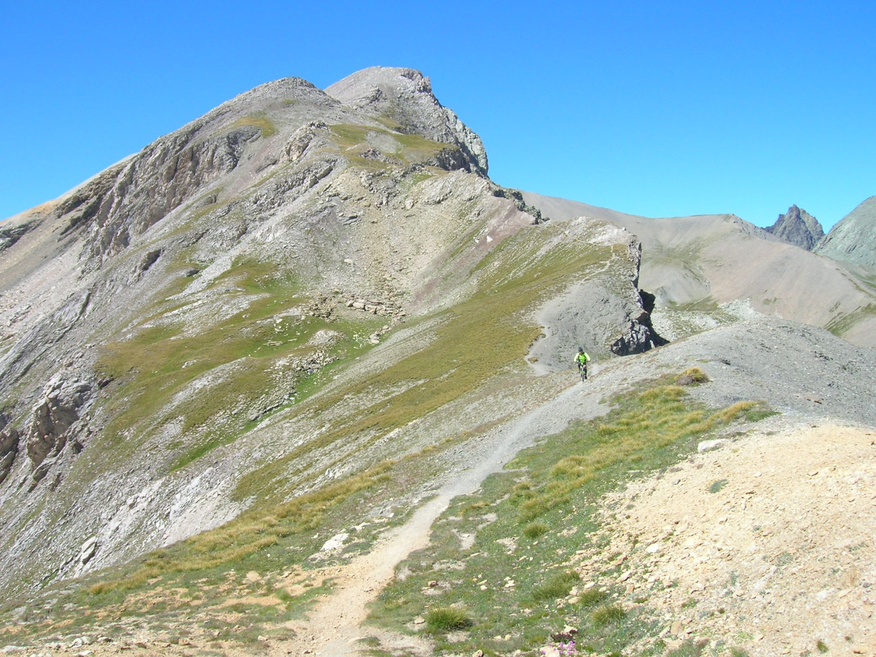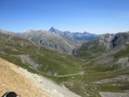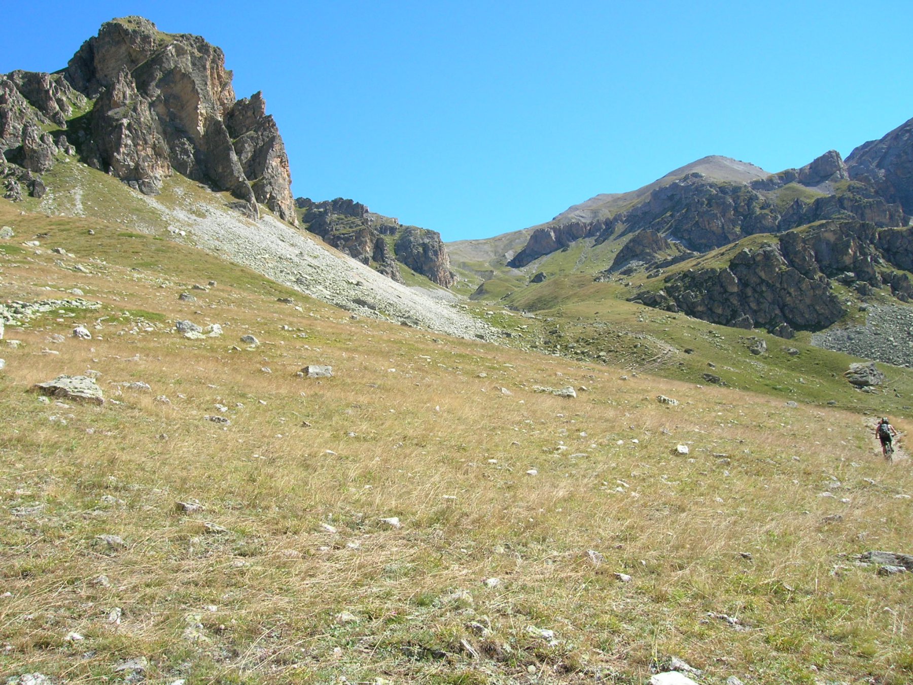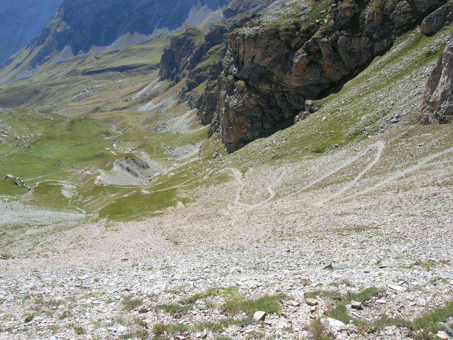 Dalla Bassa ad un bivio si procede sul sentiero di sx che porta ad un colletto dove si deve scendere sul versante Varaita di Bellino per circa 200mt di dsl (S4 continuo,tornanti stretti ravvicinati con ostacoli e fondo molto scivoloso) fino al pratone che delimita la pietraia.