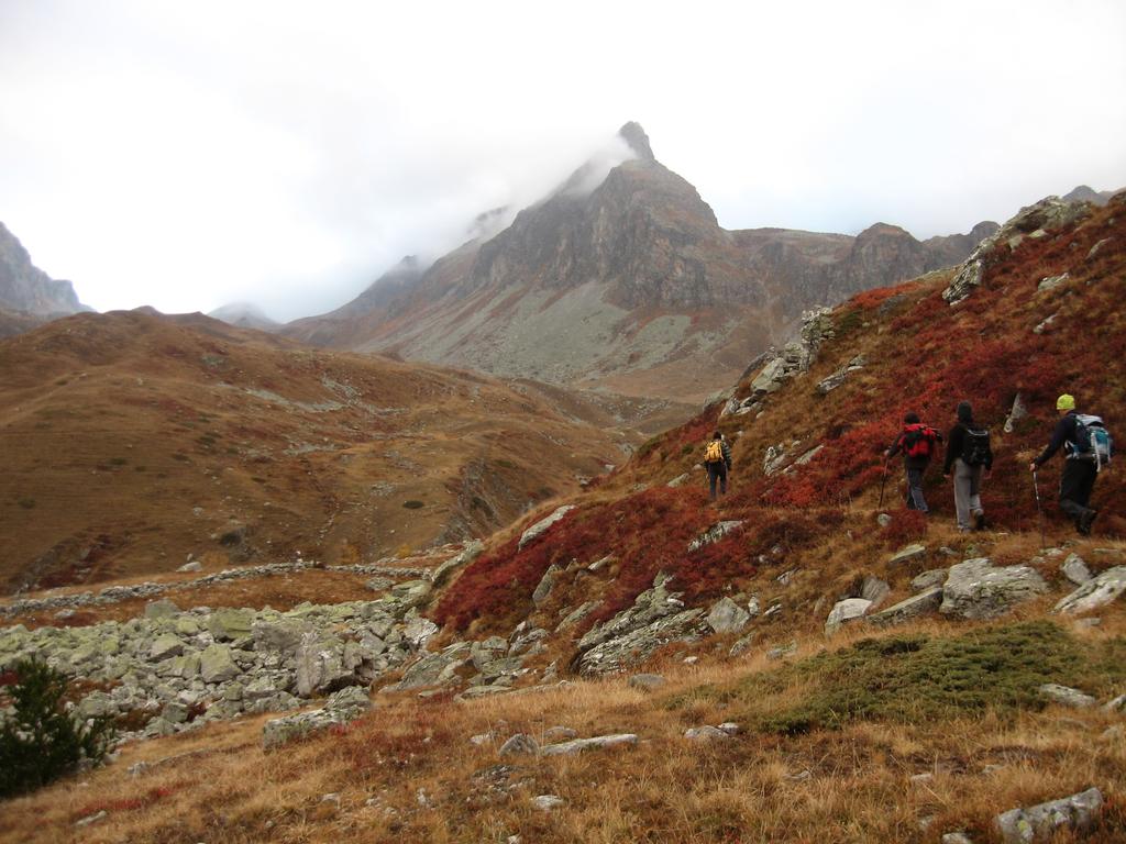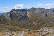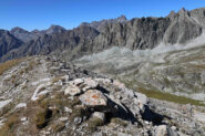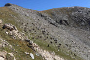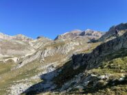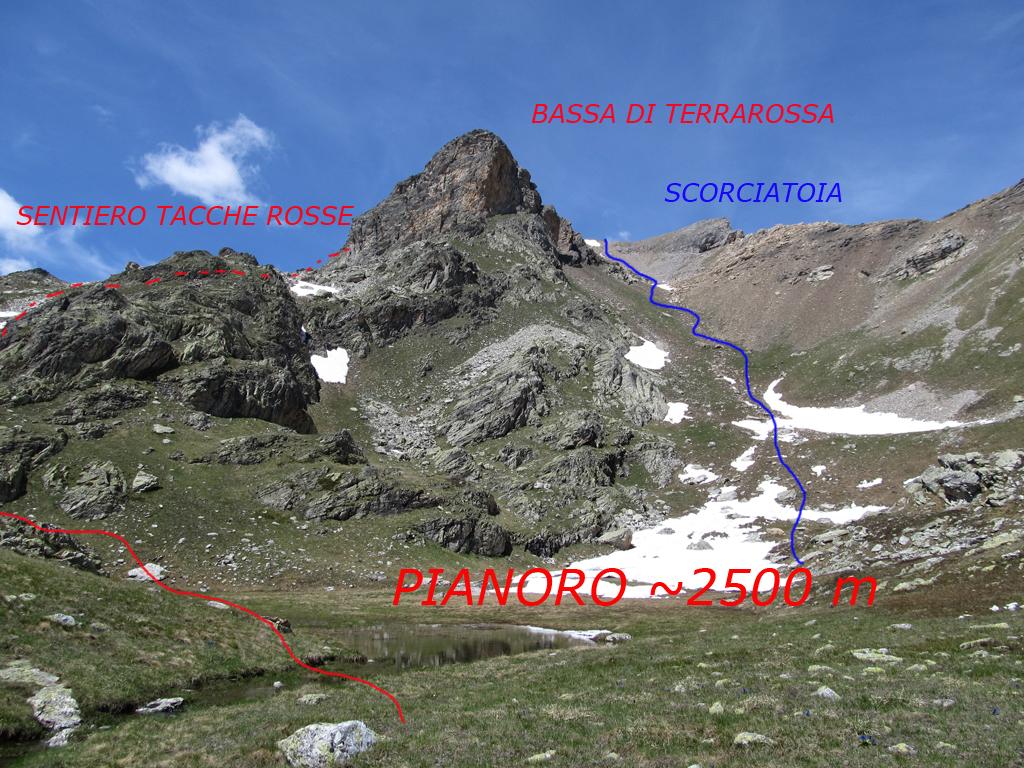Discesa lungo il percorso di salita, oppure raggiunta la dorsale sotto la bassa di Terrarossa, si può scendere nel canalone di sinistra, solcato da vaghe tracce e ometti, che porta al pianoro a circa 2500 m con i laghetti incontrato all’andata.