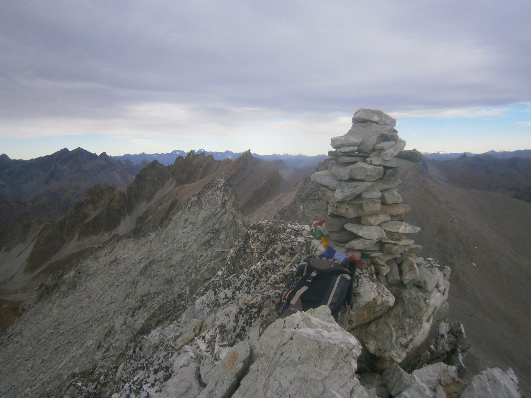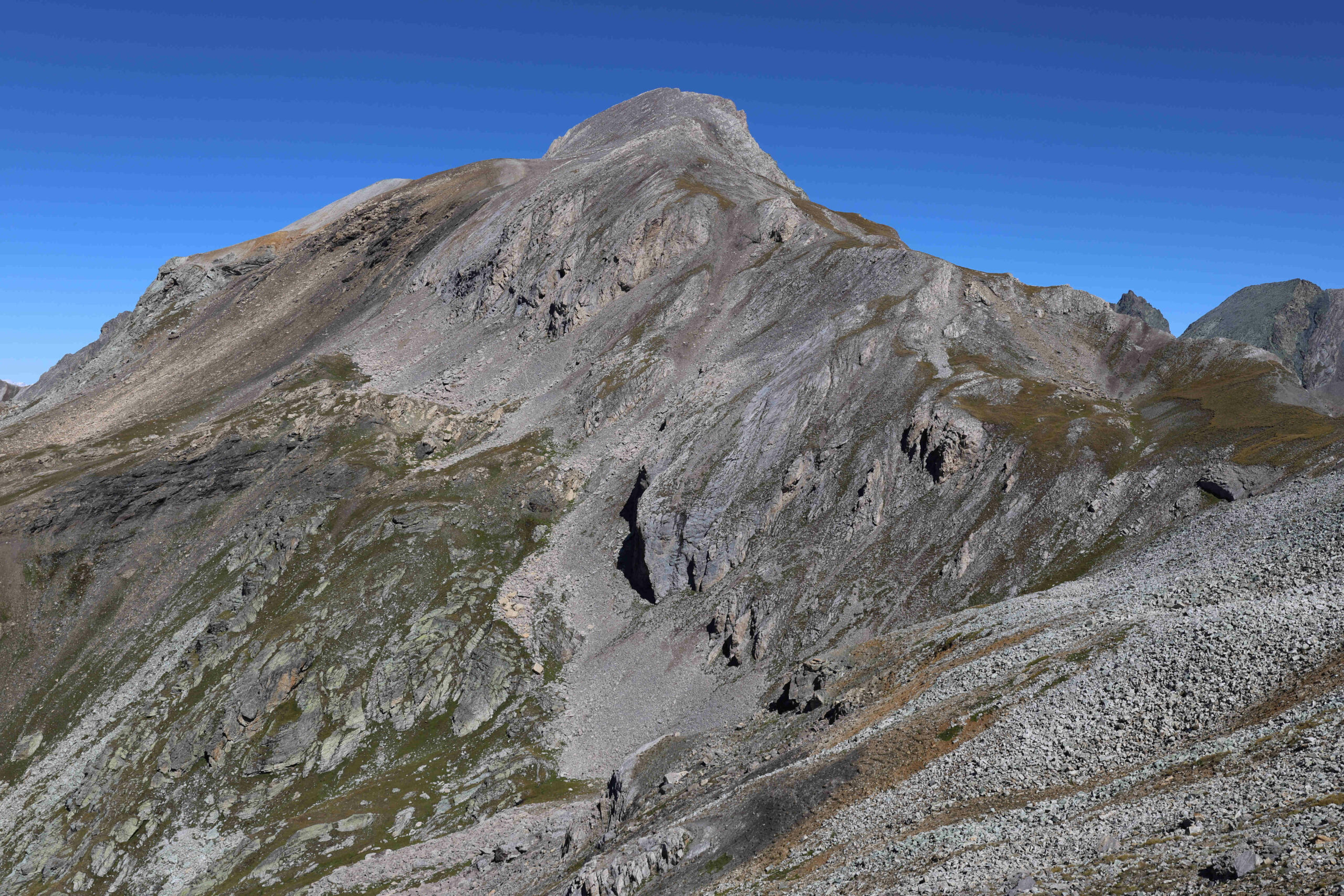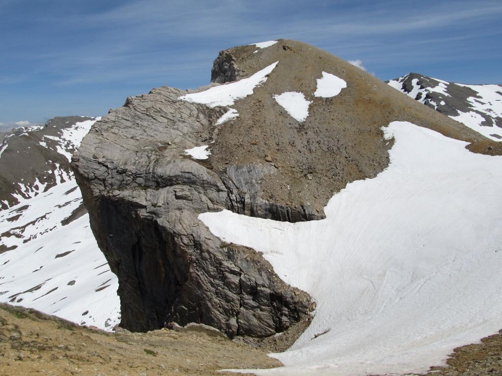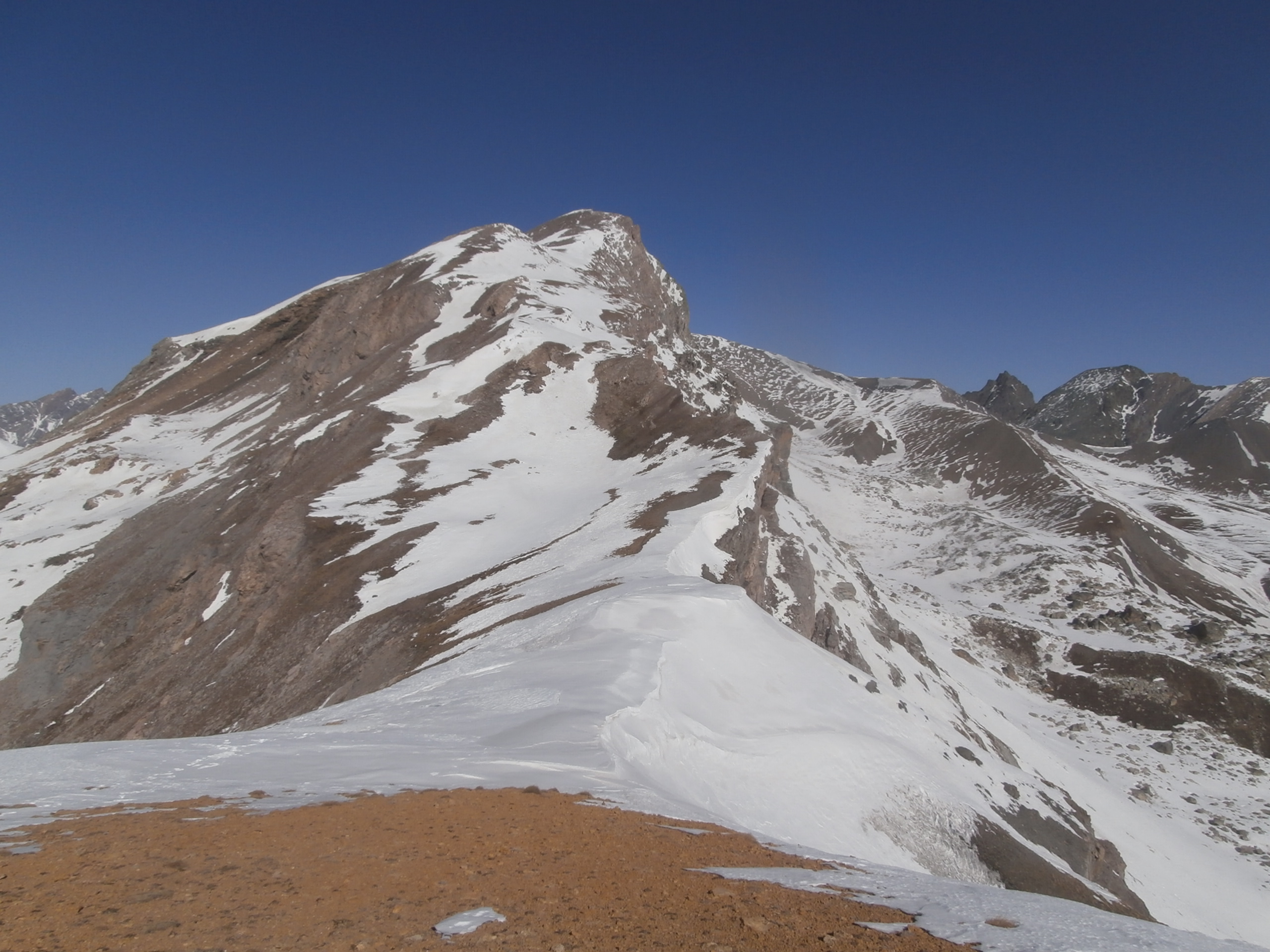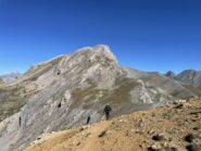 Per la punta vera e propria bisogna proseguire qualche metro seguendo la traccia in cresta, e per roccette si arriva alla vera cima, senza difficoltà senza neve o ghiaccio.