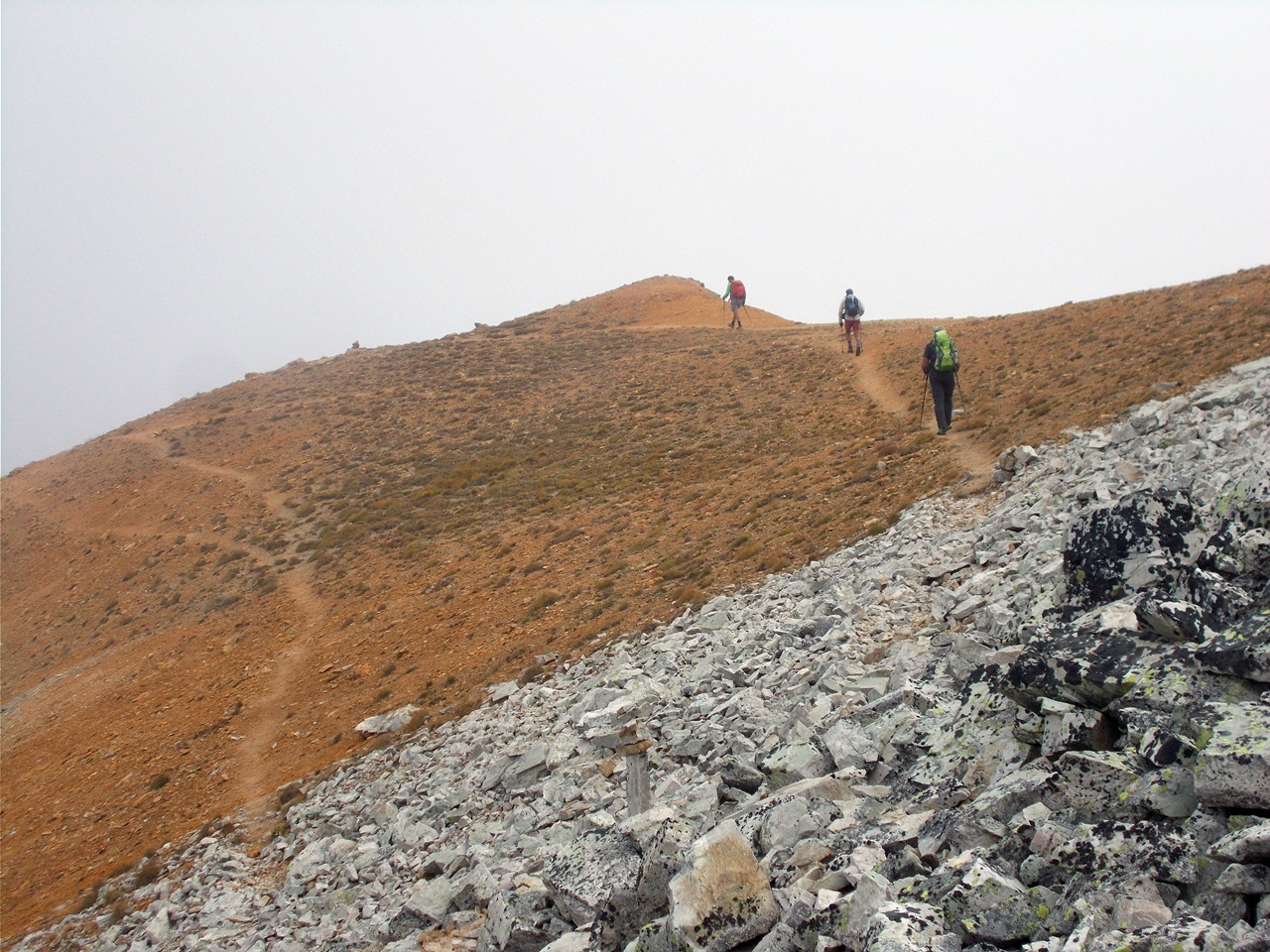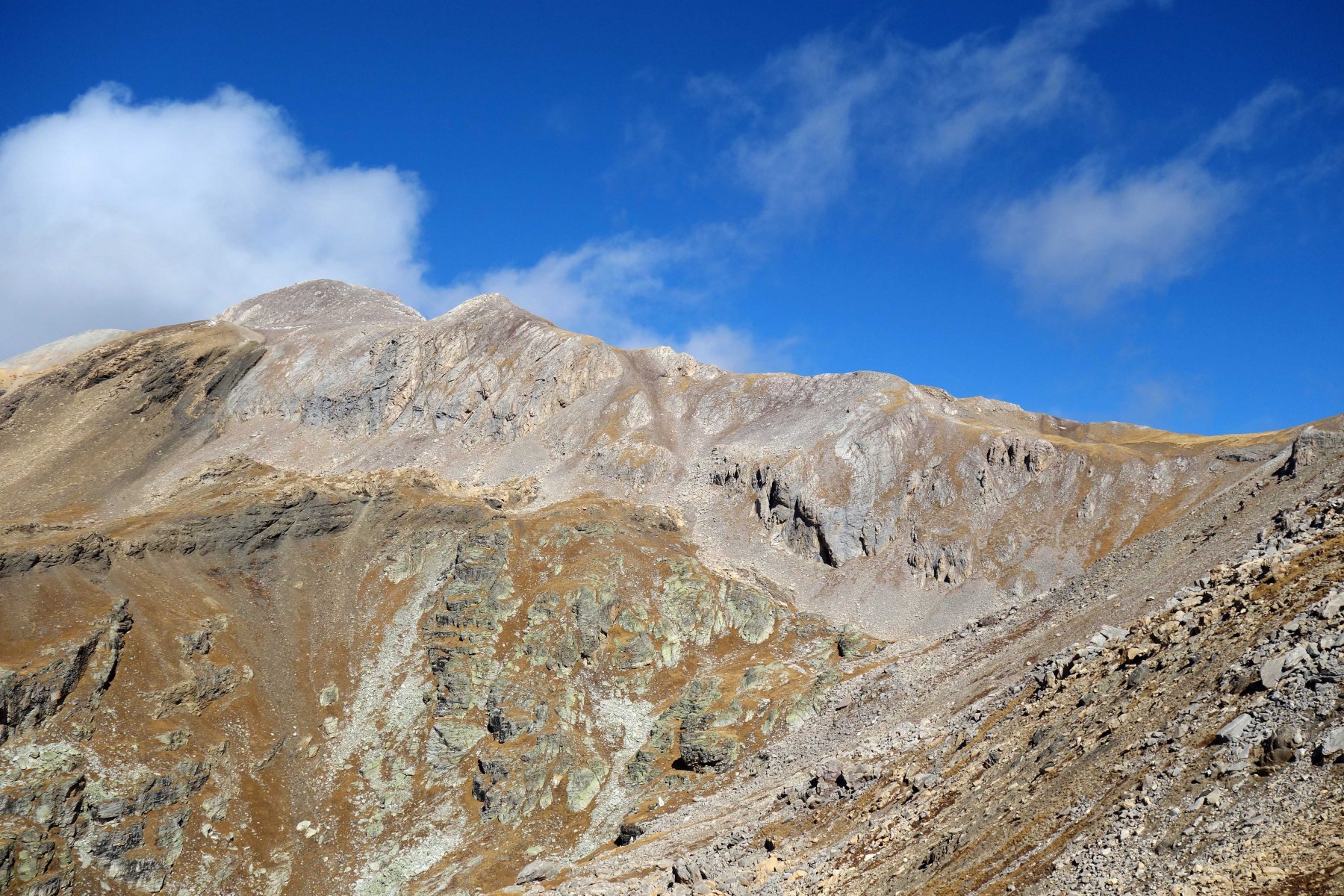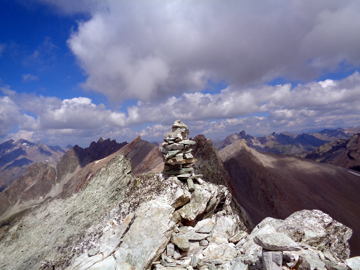Per la punta vera e propria bisogna proseguire qualche metro seguendo la traccia in cresta, e per roccette si arriva alla vera cima, senza difficoltà senza neve o ghiaccio.