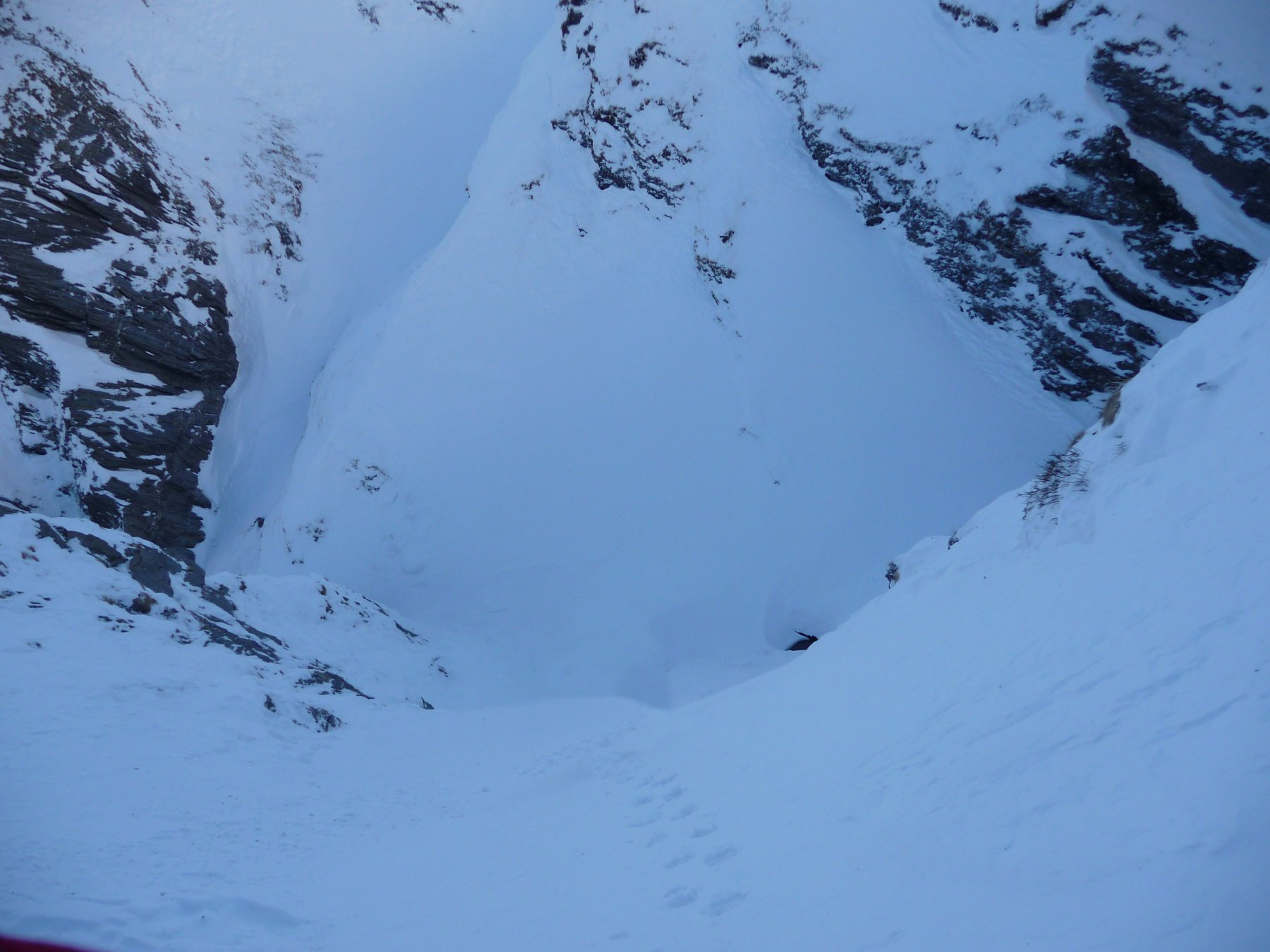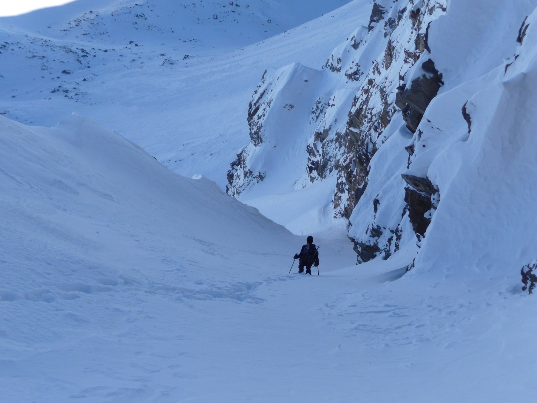 Per salire al Dente Nord di Maniglia, ritornati alla base del punto nodale, scendere verso Sud costeggiando la parete sino alla base della ripida rampa/canale, obliqua verso dx, che permette di raggiungere una sella poco prima della piatta vetta. Il canale ha una lunghezza di circa 150 m con pendenze di 40° abbondanti.
