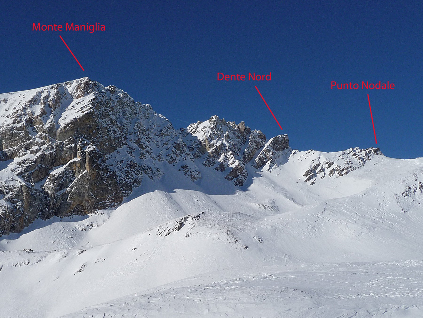 Il Dente nord di Maniglia m 3177 è invece il primo dente roccioso, a forma di becco rivolto verso nord, 300 m a sud del Punto Nodale, e raggiungibile con neve risalendo un ripido canale nevoso obliquo.