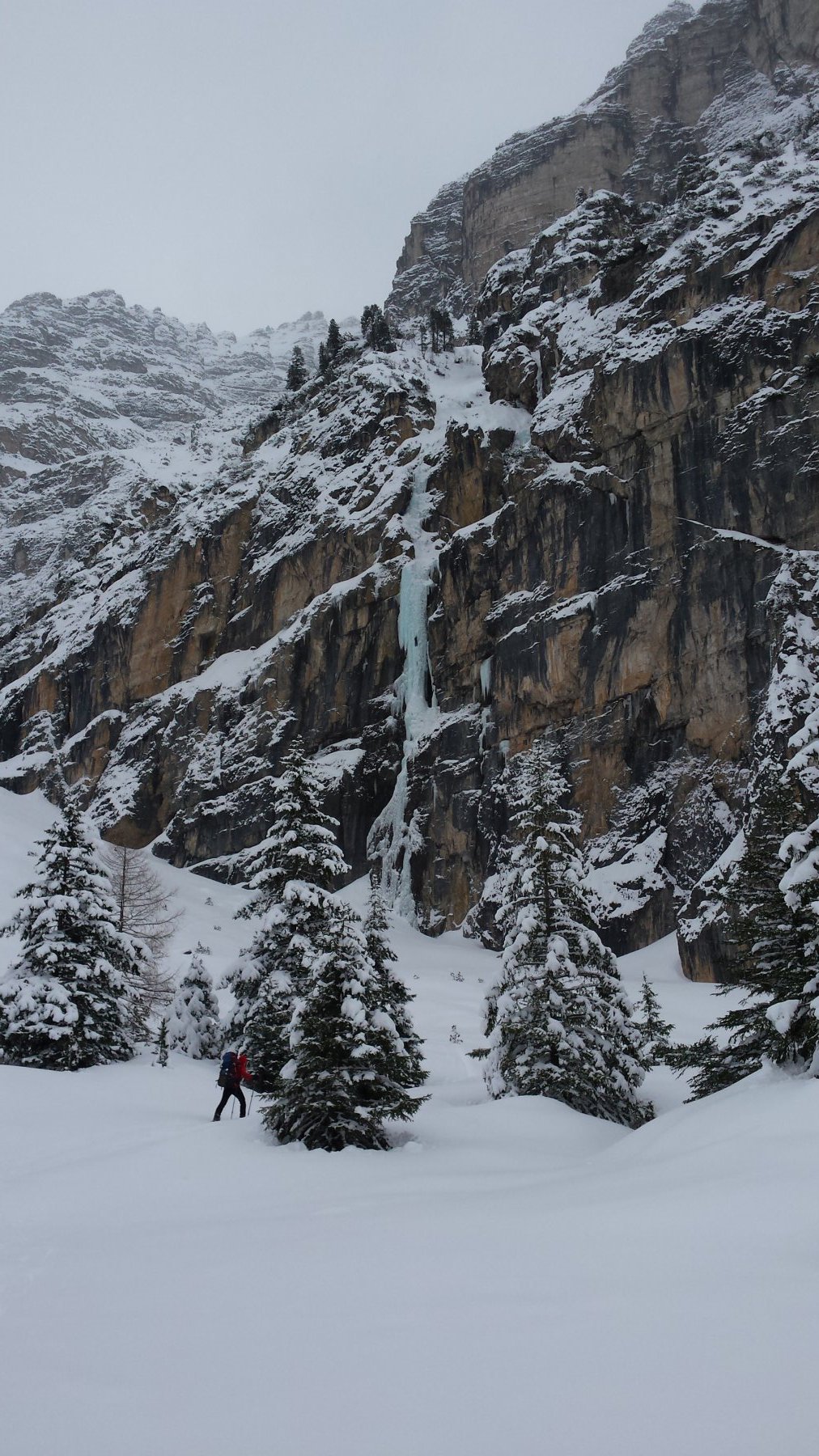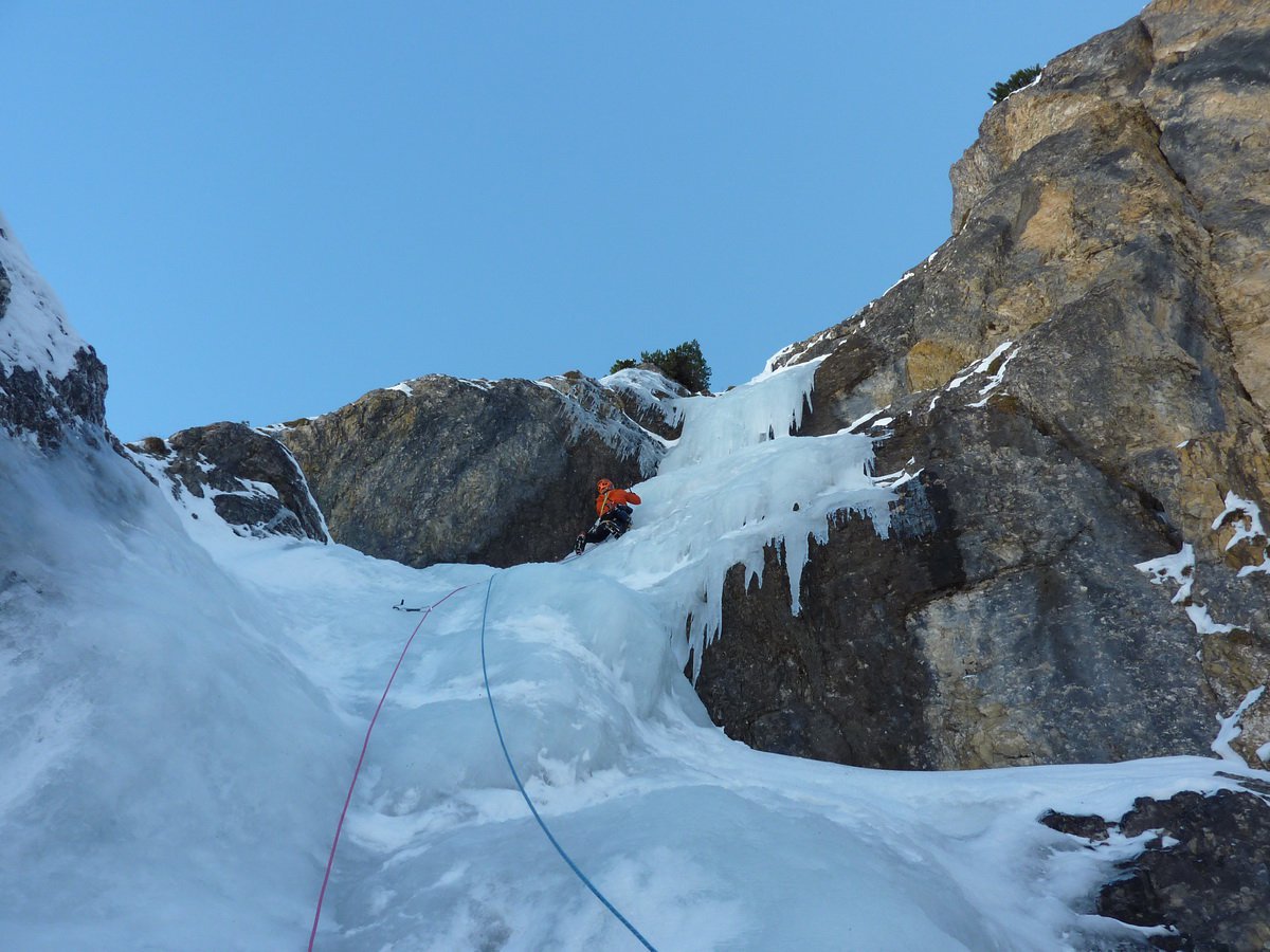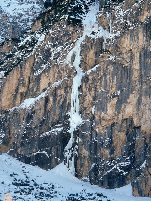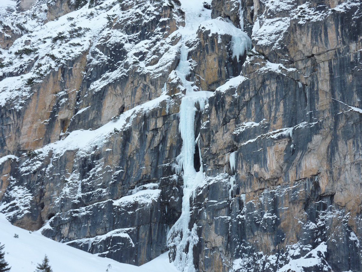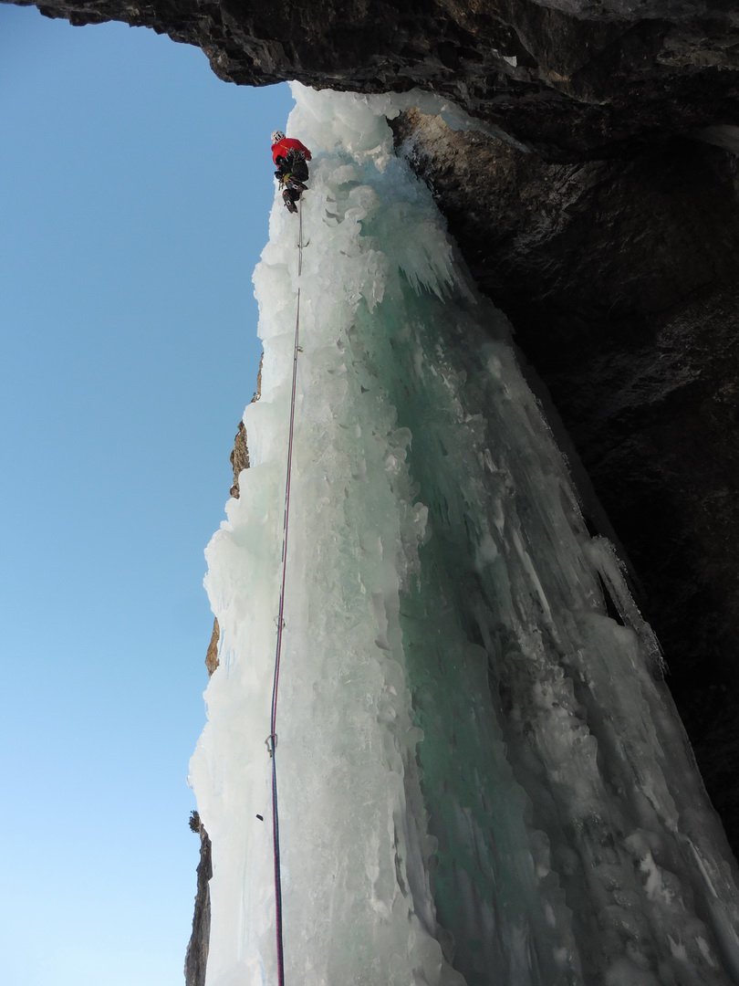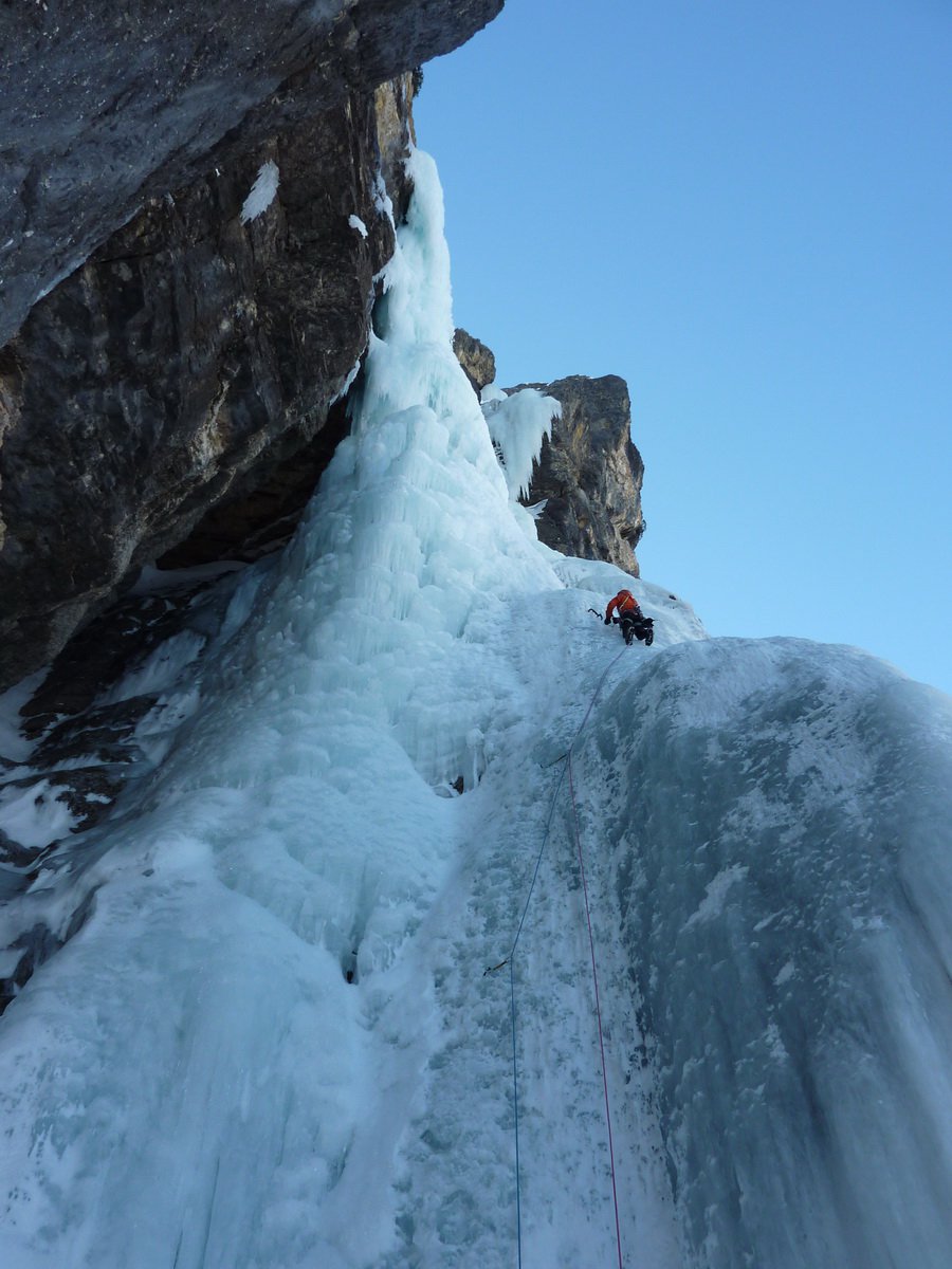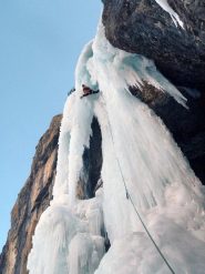 “Männer” è la prima della parete, ed è semplicemente fantastica. Offre un’arrampicata su strutture di ghiaccio impressionanti. Si supera con tre lunghezze, di cui la centrale è la più difficile e spettacolare. Una prima sosta su chiodi e le altre su ghiaccio, anche se vi sono due soste su vecchi fittoni, ma fuori via con poco ghiaccio.